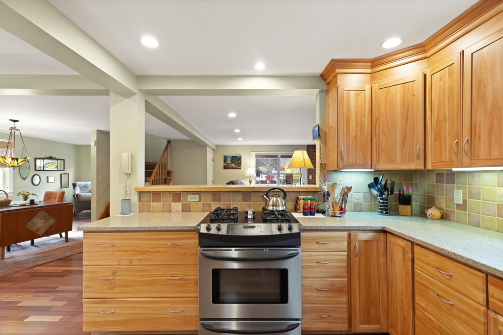 Ever dreamed of living on a tranquil pond with peaceful views, morning sunrises and evening sunset skies? Here's your opportunity to make your dream come true. A thoughtful renovation in 2014 opened up walls to create a beautiful entertaining space. Warm red birch cabinetry/silestone countertops with a dual fuel stove in the kitchen opens seamlessly into the dining and living spaces. Brazilian cherry flooring throughout the 1st floor as well as recessed lighting. Generous living room with wood stove and patio doors to your deck overlooking the tranquil pond, a birdwatchers paradise. Side door entry into a generous tiled floor mudroom perfect for bookbags, coats, shoes and shopping bags.Upstairs 3 BR's with full bath & laundry. 100 acre Pillings Pond is so close to RTES 95/128, 20 minutes to Boston, a few miles to beloved Market Street shops/restaurants plus Lynnfield's highly rates schools. Minisplit for A/C on 1st floor, whole house exterior just painted. Offers due Tues. noon