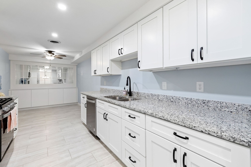 Completely updated two-bedroom, two-bathroom condo in Chelmsford Village. This sun-filled, single-level home offers an open-concept layout with a gorgeous, renovated eat-in kitchen featuring granite counters, white cabinetry, stainless steel appliances, and dedicated breakfast nook. Separate dining area and spacious living room with access to a private patio. Updates include new tile flooring in the kitchen and bathrooms, new carpet throughout, fresh paint, and new lighting. Two large bedrooms with ample closets, in-unit laundry, and garage parking with storage unit. Enjoy resort-style amenities: two pools, four tennis courts, clubhouse, guest parking, and pet-friendly building. Professionally managed and set in a serene yet ultra-convenient location near I-495, Route 3, commuter rail, and tax-free NH shopping. Turnkey and move-in ready.