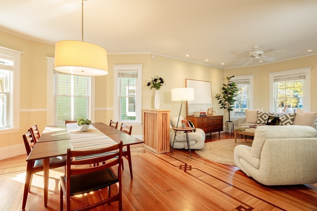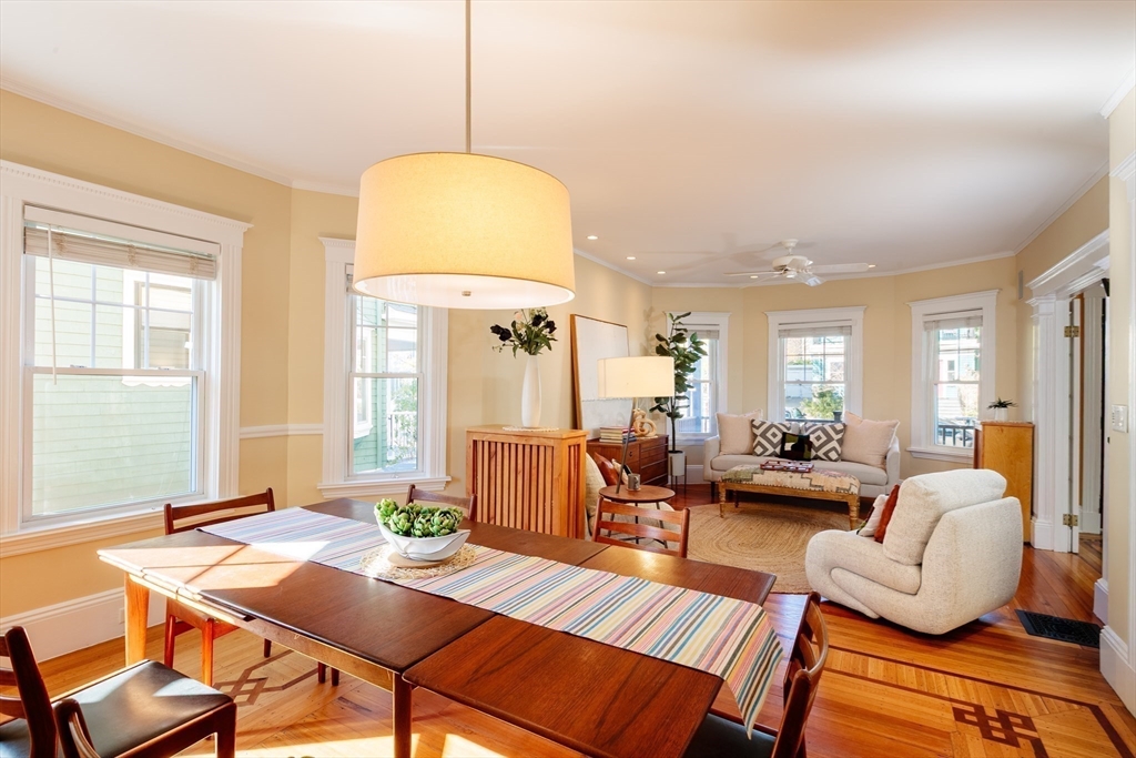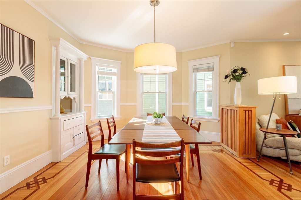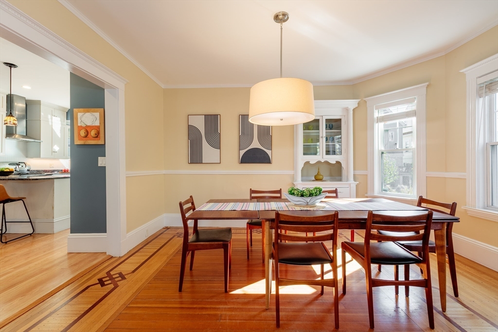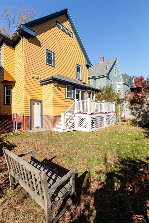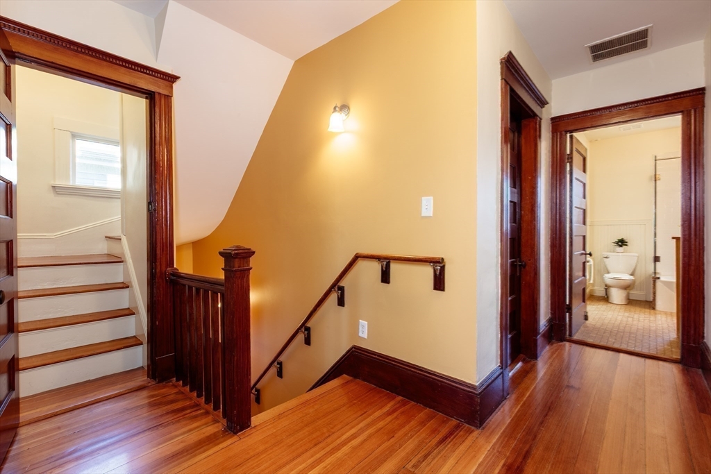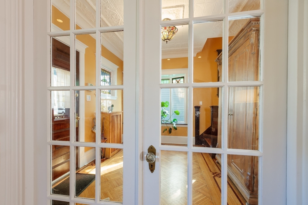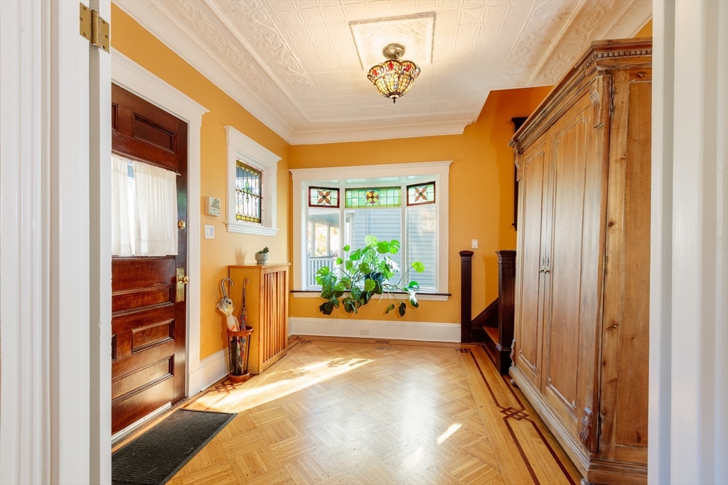 Set on a beloved st w/distinctive landscaping, this renovated home offers 4 bd, 3 ba, AC, stunning original details, wide front porch, rear deck, driveway, and fenced yard. The gracious foyer retains original ornate tin ceiling, bay window w/stained glass, inlaid wood fl, Jack and Jill stair, and French doors to LR. Adjoining DR has built-in china cabinet and inlaid wood fl. The roomy cook's kitchen has brkfst bar, ss appliances, white cabinets, stone counters, skylt, and glass slider to deck and yd. A full bath and separate laundry closet complete the 1st fl. The 2nd fl has 3 sizable bdrms, 1 office, and a full, tiled bath. The entire top fl is a luxurious custom suite w/lg bdrm; dble walk-in closets; and spa-worthy bath w/skylts, clerestory windows, tiled shower, towel warmer, dble sinks, linen closet, and water closet w/pkt dr. Unfin bsmt has ample storage and workspace and dr to yard. Walk to 2 RedLine + 2 GLX stops, bike path, Lex. Park, shops, eateries, theaters, universities.