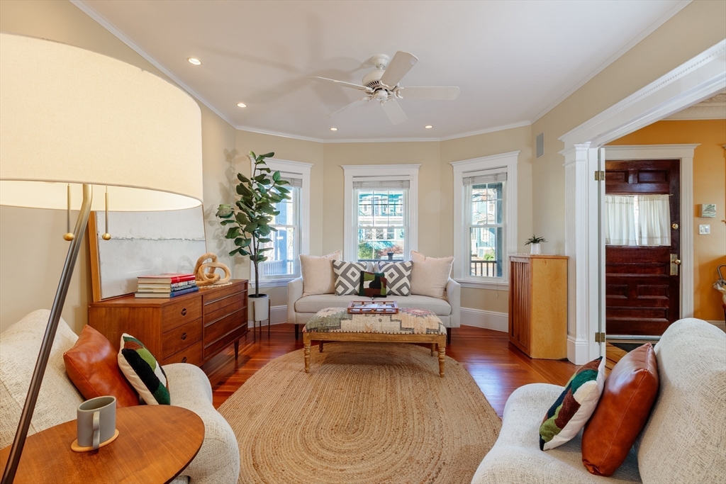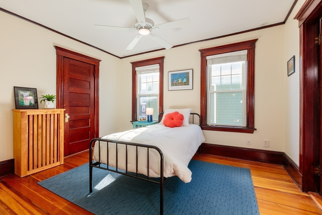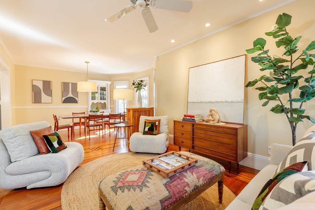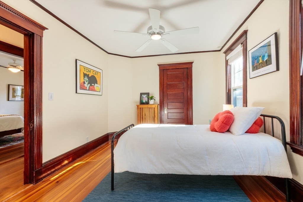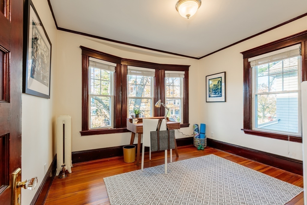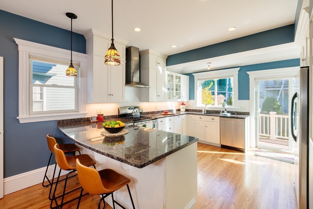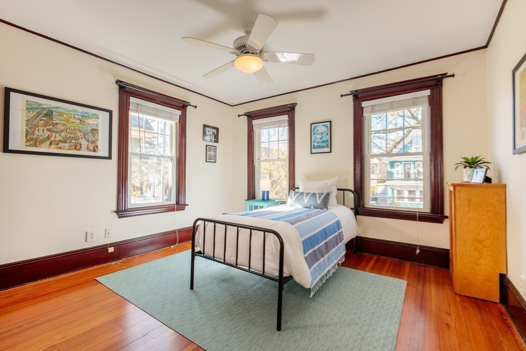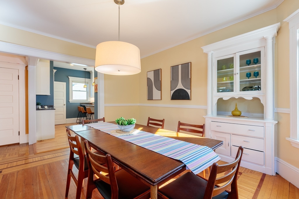 Set on a beloved st w/distinctive landscaping, this renovated home offers 4 bd, 3 ba, AC, stunning original details, wide front porch, rear deck, driveway, and fenced yard. The gracious foyer retains original ornate tin ceiling, bay window w/stained glass, inlaid wood fl, Jack and Jill stair, and French doors to LR. Adjoining DR has built-in china cabinet and inlaid wood fl. The roomy cook's kitchen has brkfst bar, ss appliances, white cabinets, stone counters, skylt, and glass slider to deck and yd. A full bath and separate laundry closet complete the 1st fl. The 2nd fl has 3 sizable bdrms, 1 office, and a full, tiled bath. The entire top fl is a luxurious custom suite w/lg bdrm; dble walk-in closets; and spa-worthy bath w/skylts, clerestory windows, tiled shower, towel warmer, dble sinks, linen closet, and water closet w/pkt dr. Unfin bsmt has ample storage and workspace and dr to yard. Walk to 2 RedLine + 2 GLX stops, bike path, Lex. Park, shops, eateries, theaters, universities.