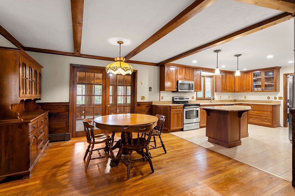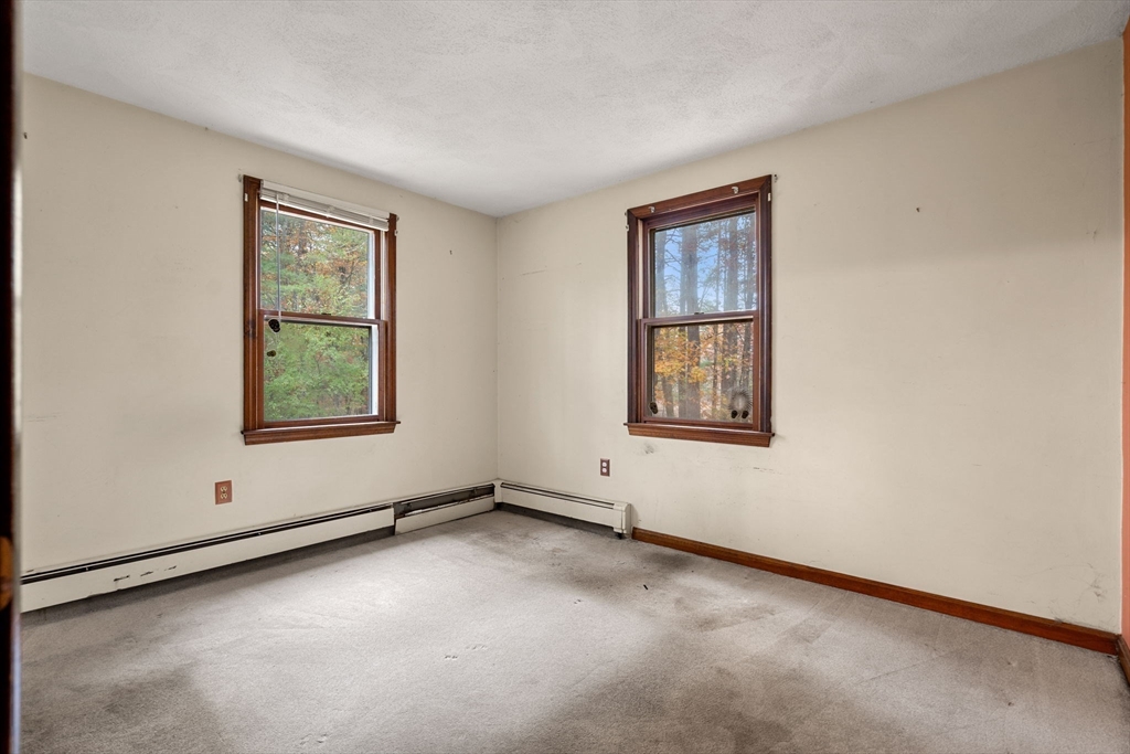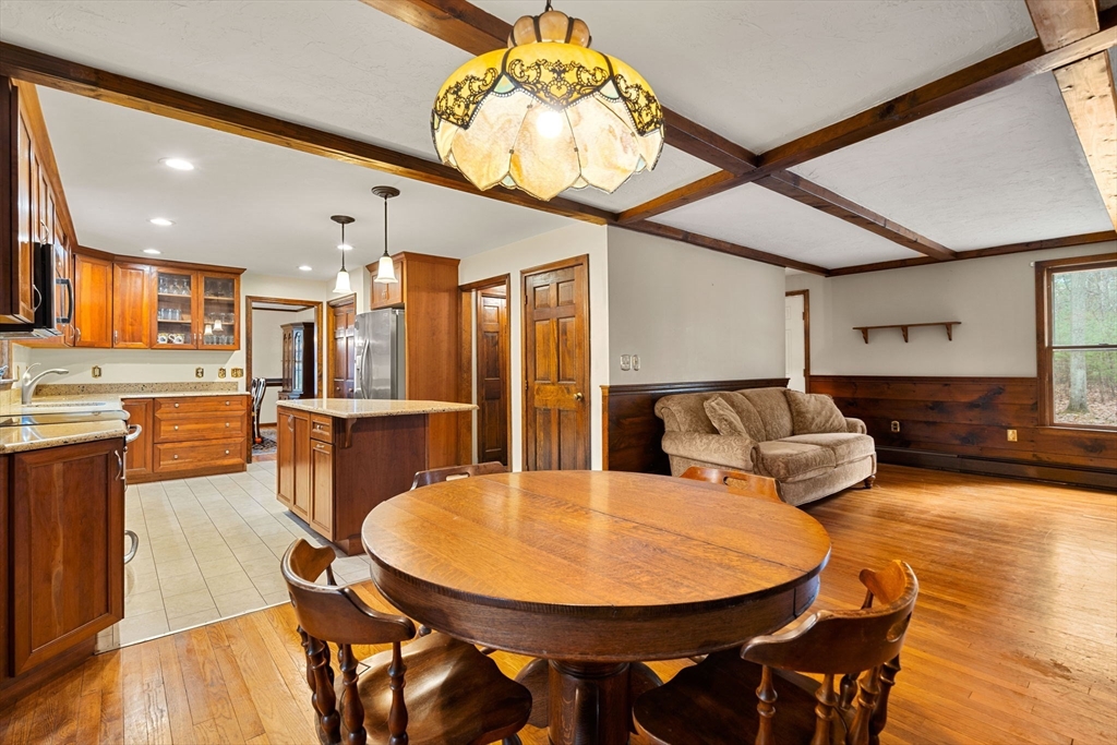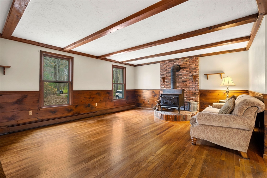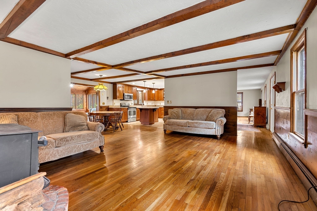 Opportunity is knocking! Nestled at the end of Off Groton School Road in Ayer, this single-family residence in Middlesex County presents an inviting home, ready to move in and begin its next chapter. The large family room w/ woodstove stands as a testament to comfort and style, inviting relaxation beneath a beamed ceiling, complemented by a distinctive wood wall that adds warmth and character. The eat-in kitchen, designed with functionality in mind, features a large kitchen island, perfect for meal preparation and casual dining, SS appliances & ample counter space. Heated sunroom/enclosed porch, half bath w/ laundry, formal dining room and formal living room complete the first floor. This property offers four spacious bedrooms and two full bathrooms on the second floor. Privacy abounds in the wooded backyard. Lots to love!