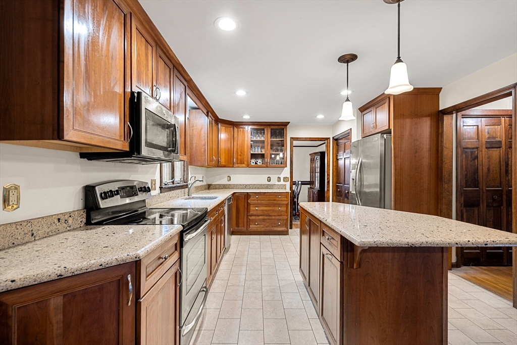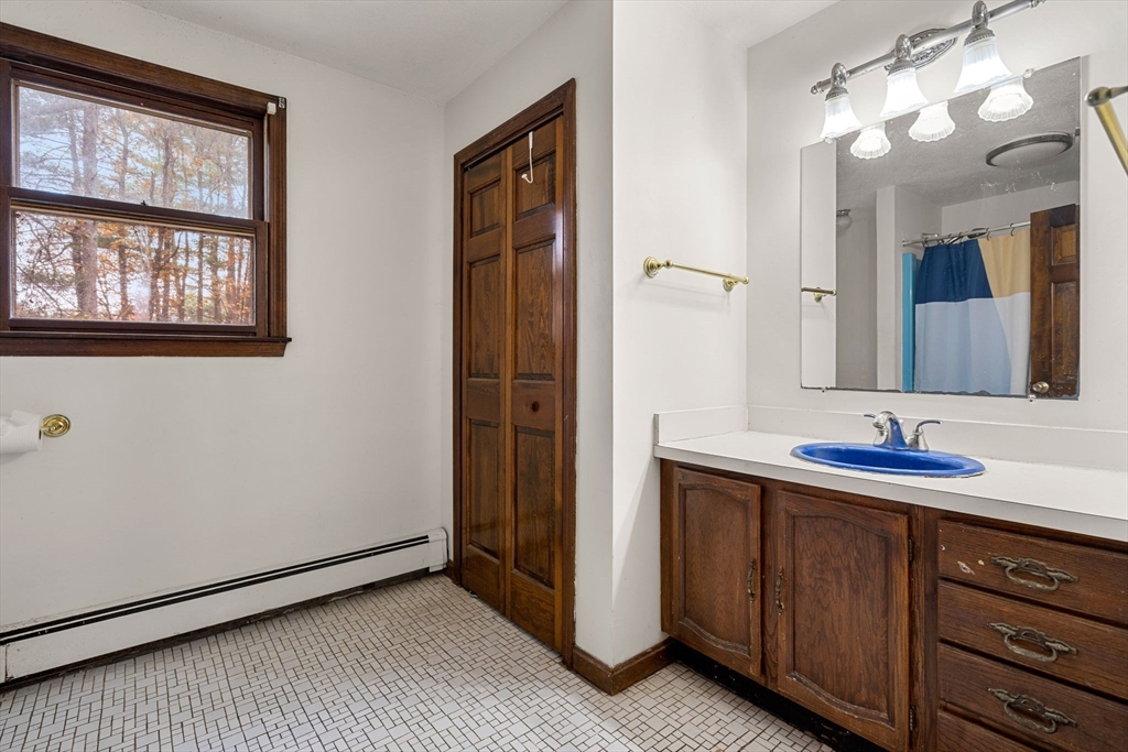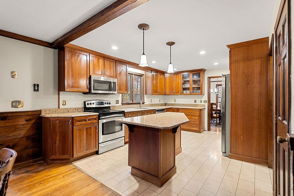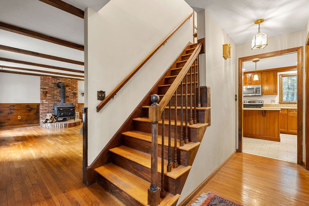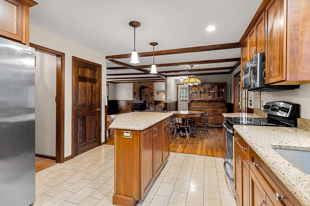 Opportunity is knocking! Nestled at the end of Off Groton School Road in Ayer, this single-family residence in Middlesex County presents an inviting home, ready to move in and begin its next chapter. The large family room w/ woodstove stands as a testament to comfort and style, inviting relaxation beneath a beamed ceiling, complemented by a distinctive wood wall that adds warmth and character. The eat-in kitchen, designed with functionality in mind, features a large kitchen island, perfect for meal preparation and casual dining, SS appliances & ample counter space. Heated sunroom/enclosed porch, half bath w/ laundry, formal dining room and formal living room complete the first floor. This property offers four spacious bedrooms and two full bathrooms on the second floor. Privacy abounds in the wooded backyard. Lots to love!