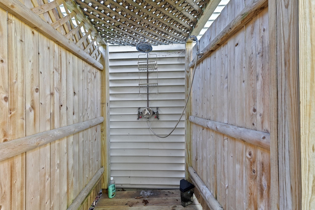 Exceptional Coastal Residence Just steps from the exclusive 50-member Hawley Beach Association beach access for members only. This beautifully renovated residence offers refined coastal living. The main level features a new kitchen with oversized counter, adjoining dining area, and spacious living room—perfect for gatherings. Updates include a new kitchen, two new baths, and a finished attic. The partially finished walkout basement leads to a private backyard with outdoor shower. The second floor offers three bedrooms and a full bath, while the upper level provides a versatile finished space—ideal as a game room, studio, guest suite, or office. Large windows fill the home with light, and a gated deck overlooks a private, tree-lined yard abutting conservation land with a path to a pond used for winter skating. Located at the end of a quiet dead-end road, this property offers privacy, and the best of coastal living