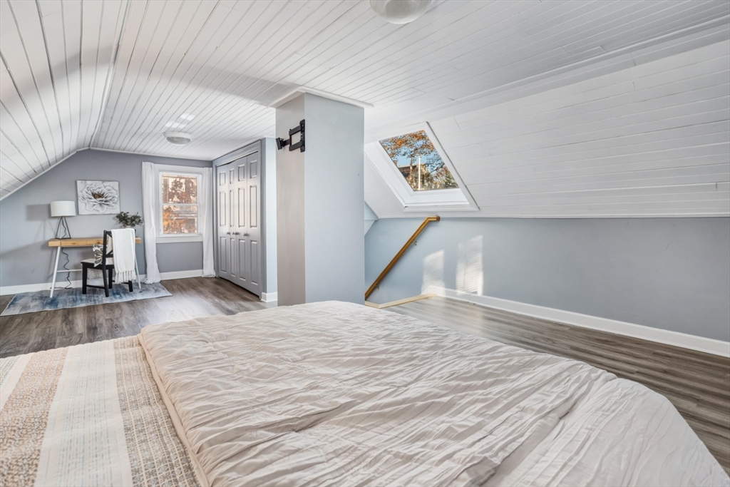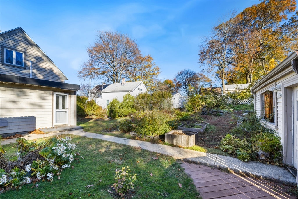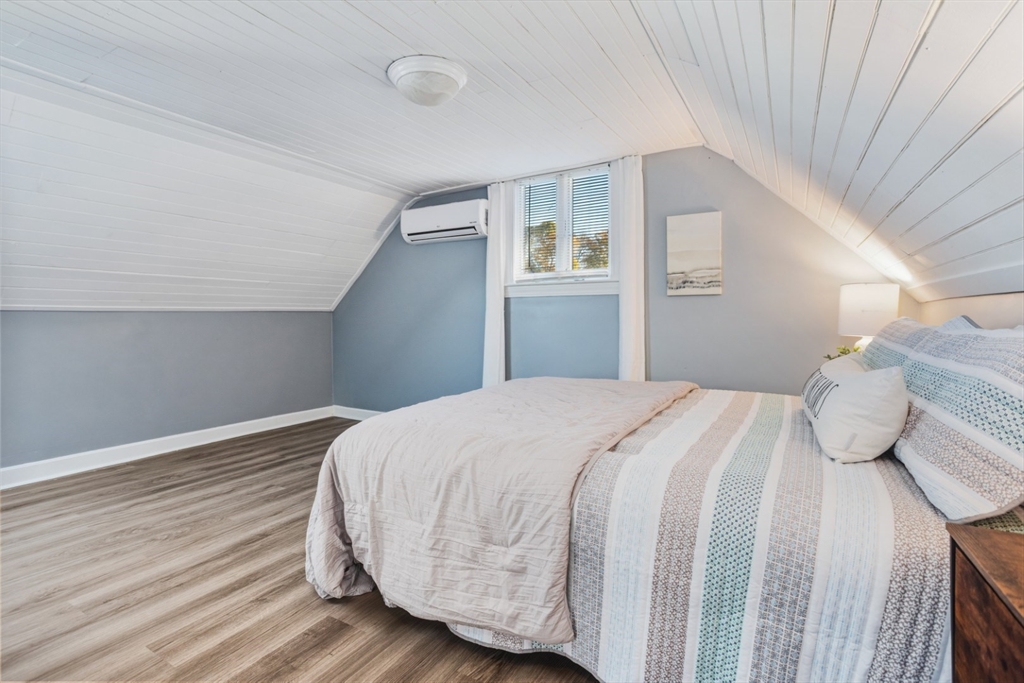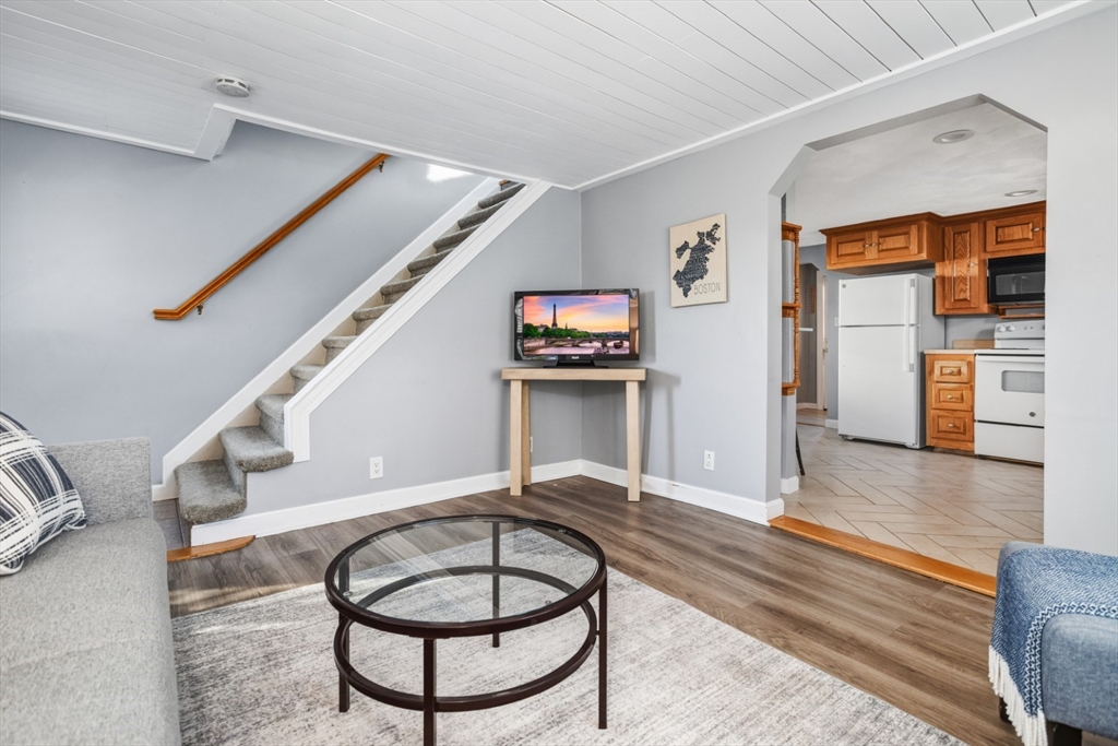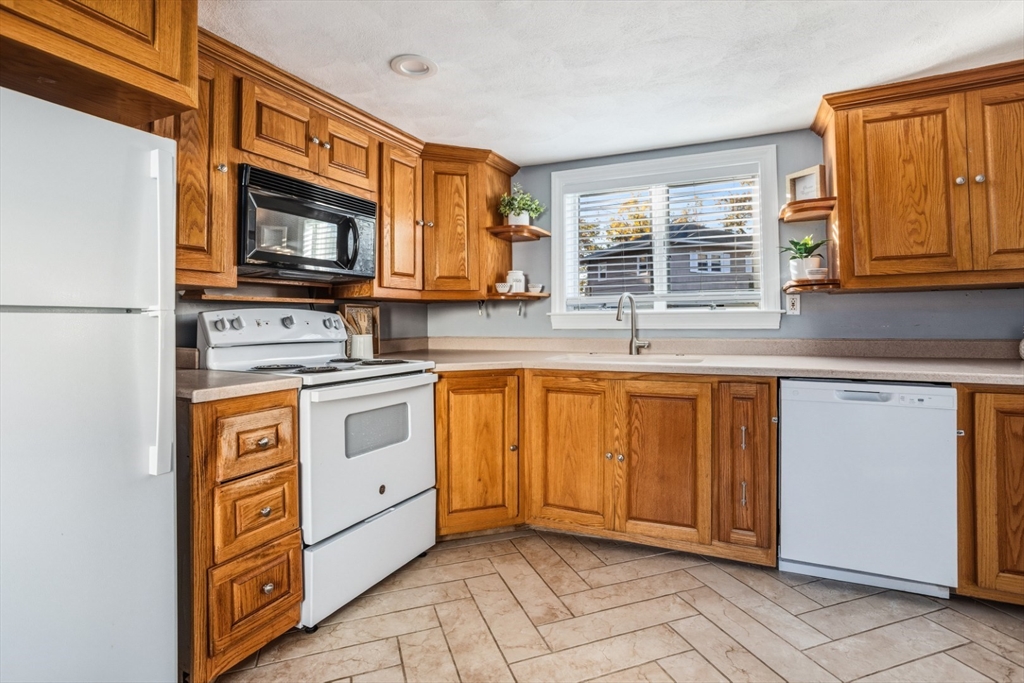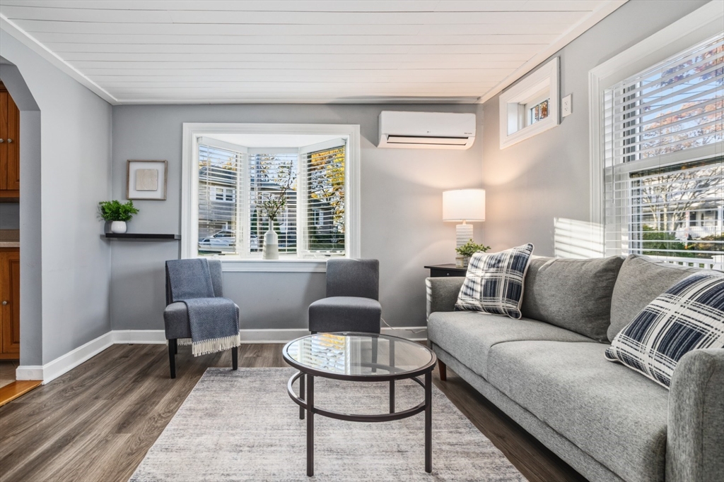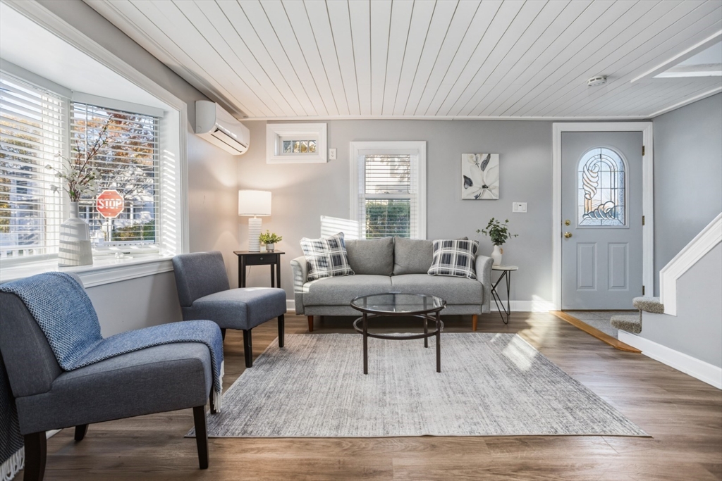 Perfect condo alternative in this pristine 3 room, 1 bed, 1 bath home. Located off the center of town on a nice corner lot, this house has great opportunity for expansion potential. With 714 square feet of living area, the residence offers an intimate and manageable space, perfect for creating a cozy atmosphere. Large eat-in kitchen with lots of cabinets, breakfast bar and Corian counters. Living room offers bow window and is open to the kitchen. Upper floor offers the main bedroom with walk-in closet and skylight. Used to be 2 bedrooms. Lots of updates and improvements have been made in the last 5 years. 3 new ductless mini splits for both heating and cooling. Some newer roofing, flooring, electrical and insulation. Full basement for storage. Detached shed used to be garage and can be easily returned back. Close to public transportation, stores, restaurants and rail trail. Great commuter location. Twenty minutes to Boston and Logan Airport and 45 minutes to NH border.