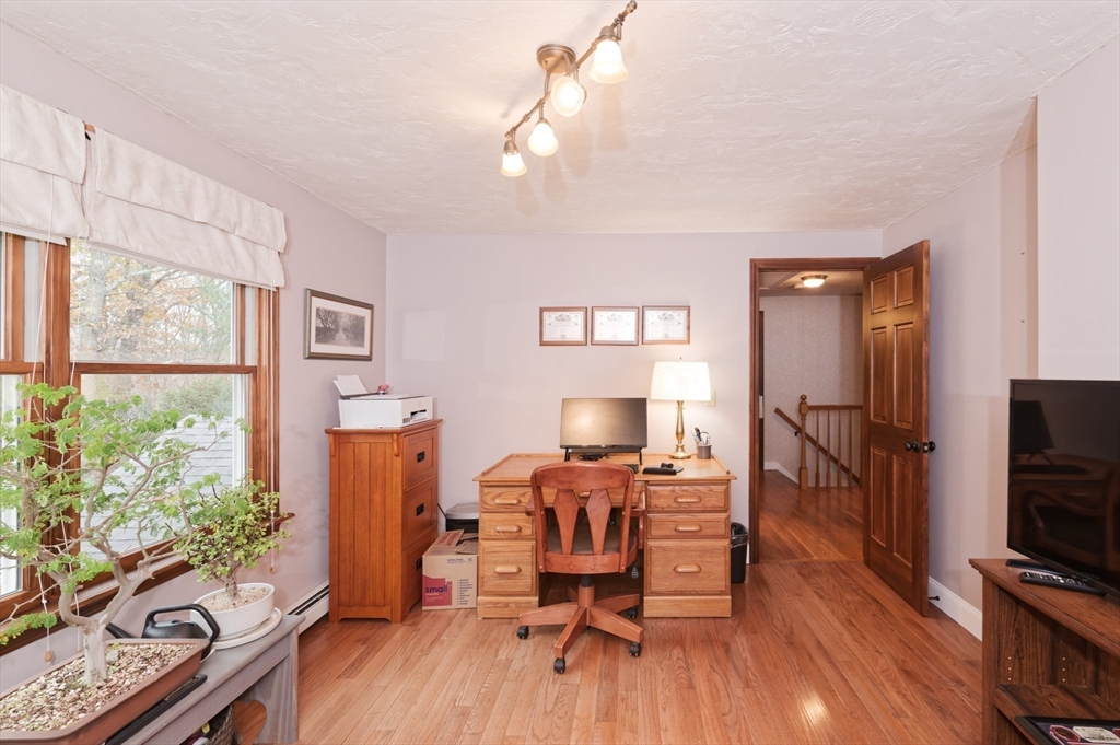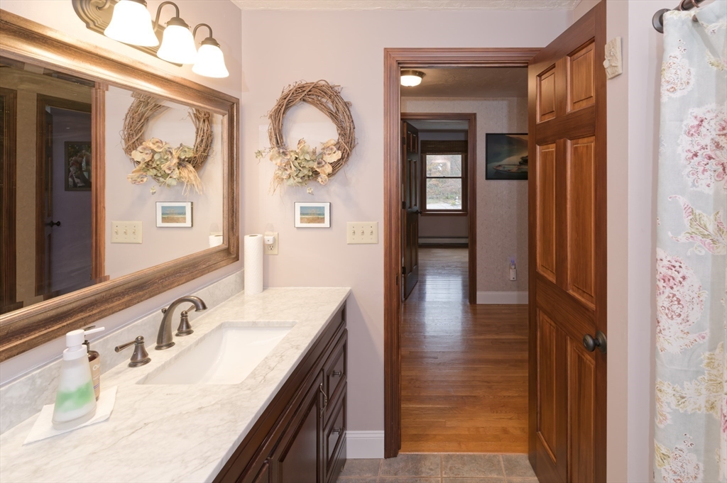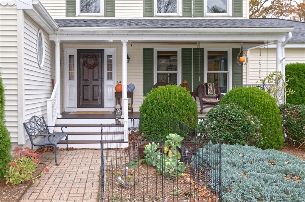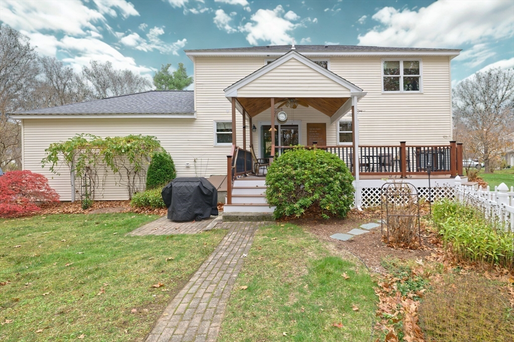 Make this much loved and cared for colonial your new home! Roaming first floor offers flexibility. Spacious family room with gas fireplace allows for several seating options. French doors lead into the more formal dining rm that leads into the cheerful kitchen featuring a center island, mix of solid and glass-front cabinetry - perfect for showcasing fine dinnerware or decorative pieces & a breakfast area overlooking the covered porch & back yard. Fireplaced living rm can function as a den or formal area & a first floor laundry in the updated half bath. Four bedrooms up with the primary boasting a walk in closet & en-suite bath updated with a modern solid surface vanity, tile floor & tiled shower. An add'l full bath services the other bedrooms. Hardwood floors thru 1st AND 2nd floors. Small bonus room finished in the basement. Add to all this an acre lot, oversized 12x24 deck (partially covered), a patio & shed all in a neighborhood setting on a cul-de-sac! Minutes to Rt 495 & shopping.