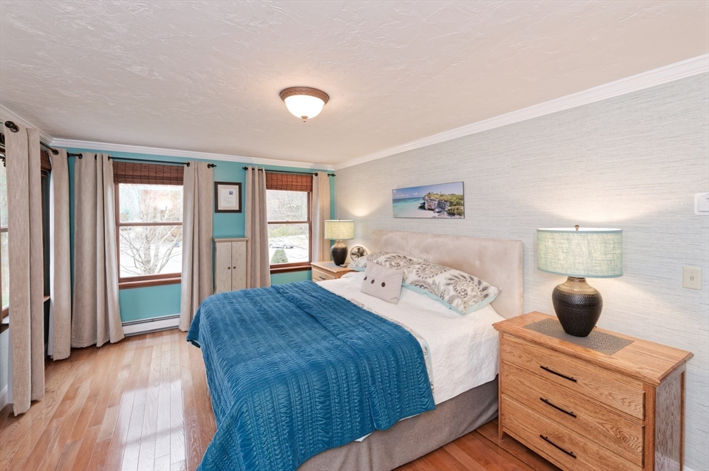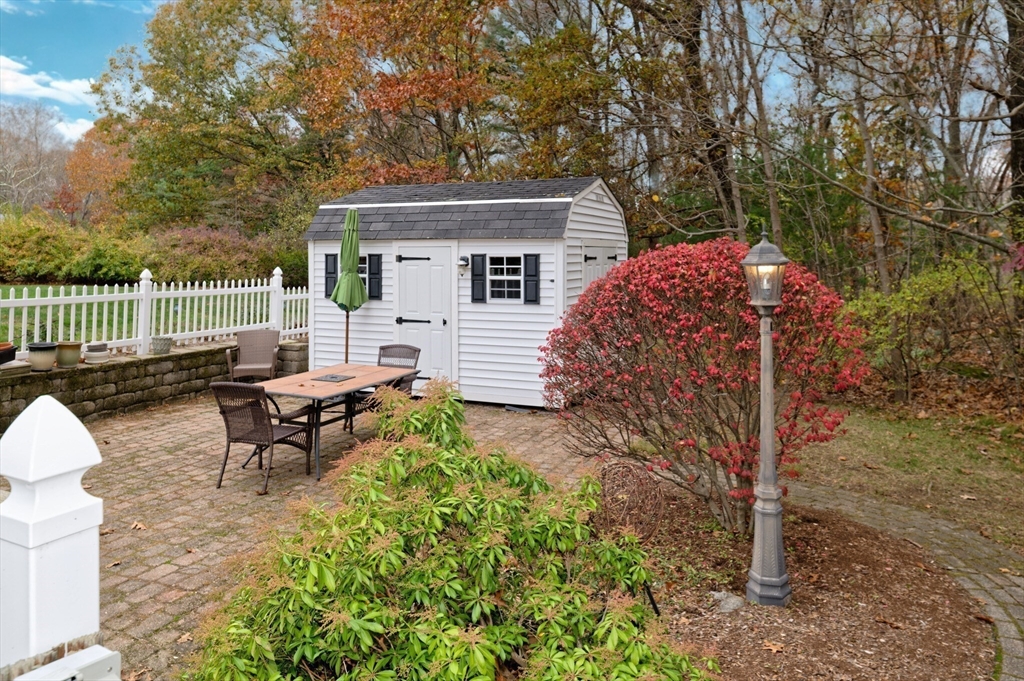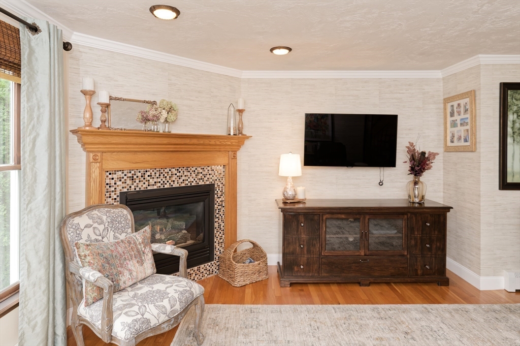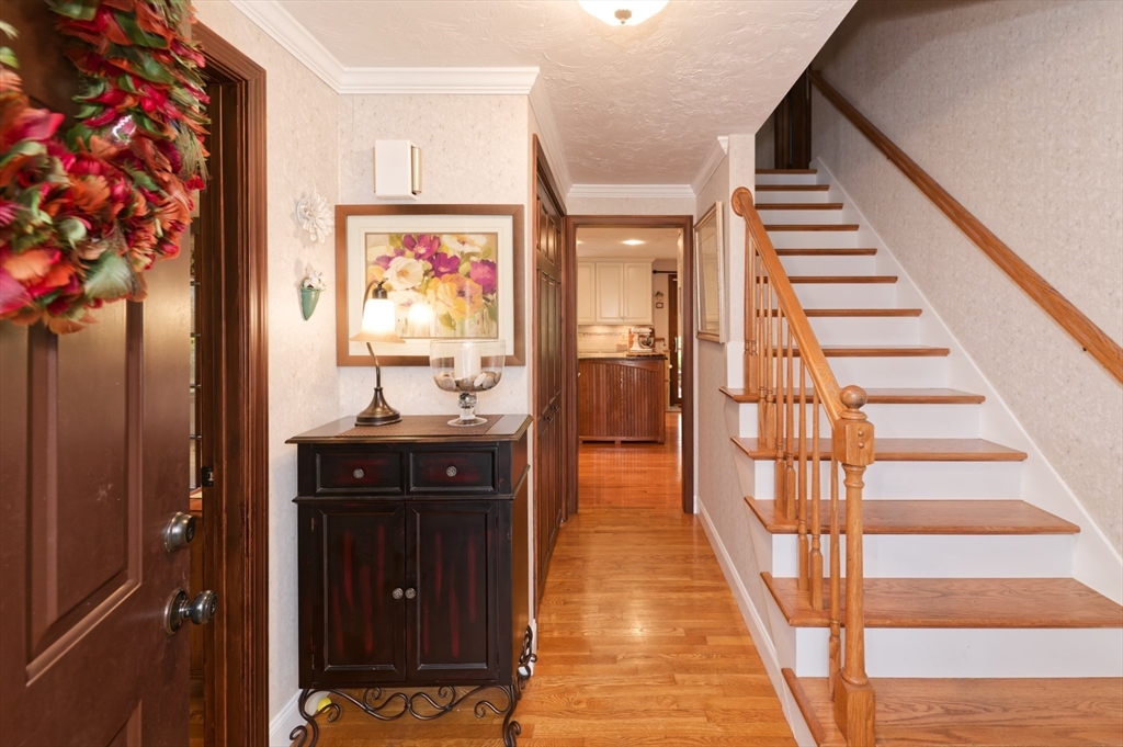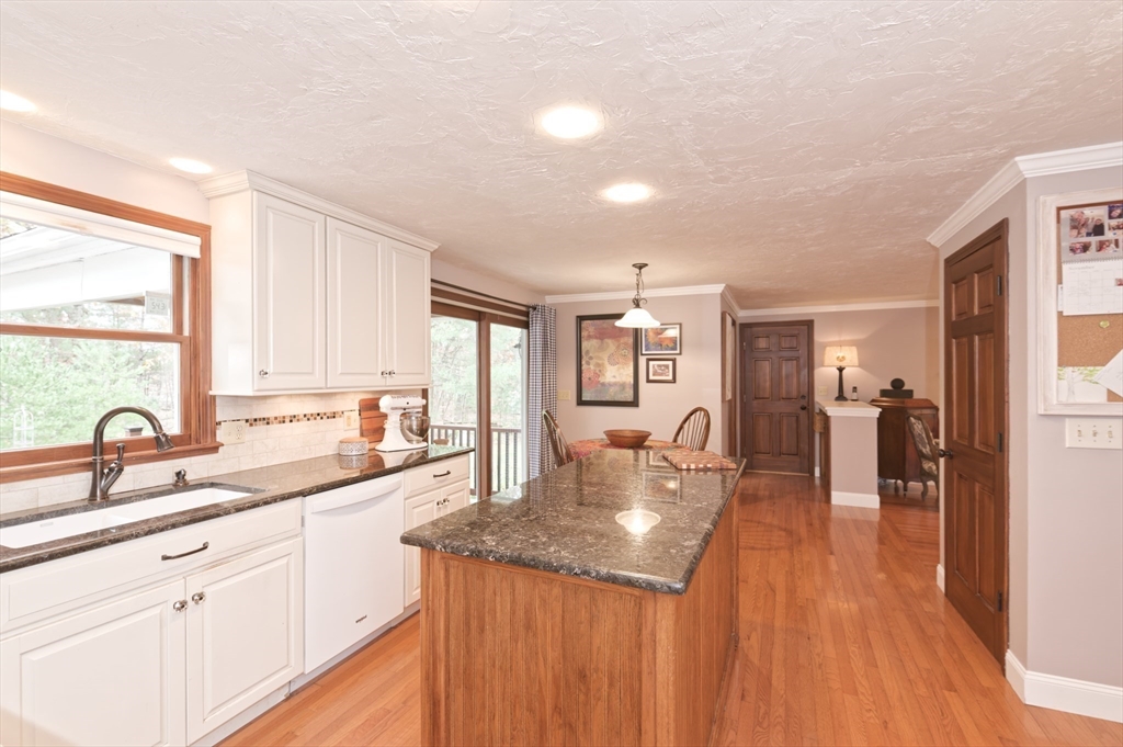Make this much loved and cared for colonial your new home! Roaming first floor offers flexibility. Spacious family room with gas fireplace allows for several seating options. French doors lead into the more formal dining rm that leads into the cheerful kitchen featuring a center island, mix of solid and glass-front cabinetry - perfect for showcasing fine dinnerware or decorative pieces & a breakfast area overlooking the covered porch & back yard. Fireplaced living rm can function as a den or formal area & a first floor laundry in the updated half bath. Four bedrooms up with the primary boasting a walk in closet & en-suite bath updated with a modern solid surface vanity, tile floor & tiled shower. An add'l full bath services the other bedrooms. Hardwood floors thru 1st AND 2nd floors. Small bonus room finished in the basement. Add to all this an acre lot, oversized 12x24 deck (partially covered), a patio & shed all in a neighborhood setting on a cul-de-sac! Minutes to Rt 495 & shopping.