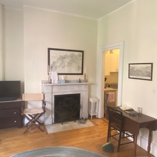 Beacon Hill, South Slope. Elegant, spacious and sunny studio with wood floors, high ceilings, bow window. Located on the third floor of a classic period and impeccably maintained condominium building, this studio apartment has a separate sleeping alcove that can accommodate a queen size bed, galley kitchen, decorative fireplace with marble mantel and common laundry. Hardwood floors. Common laundry located in the basement. Available 12/1/2025