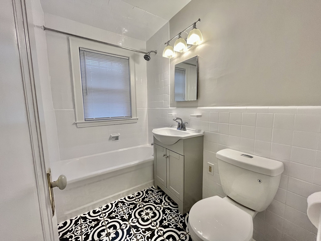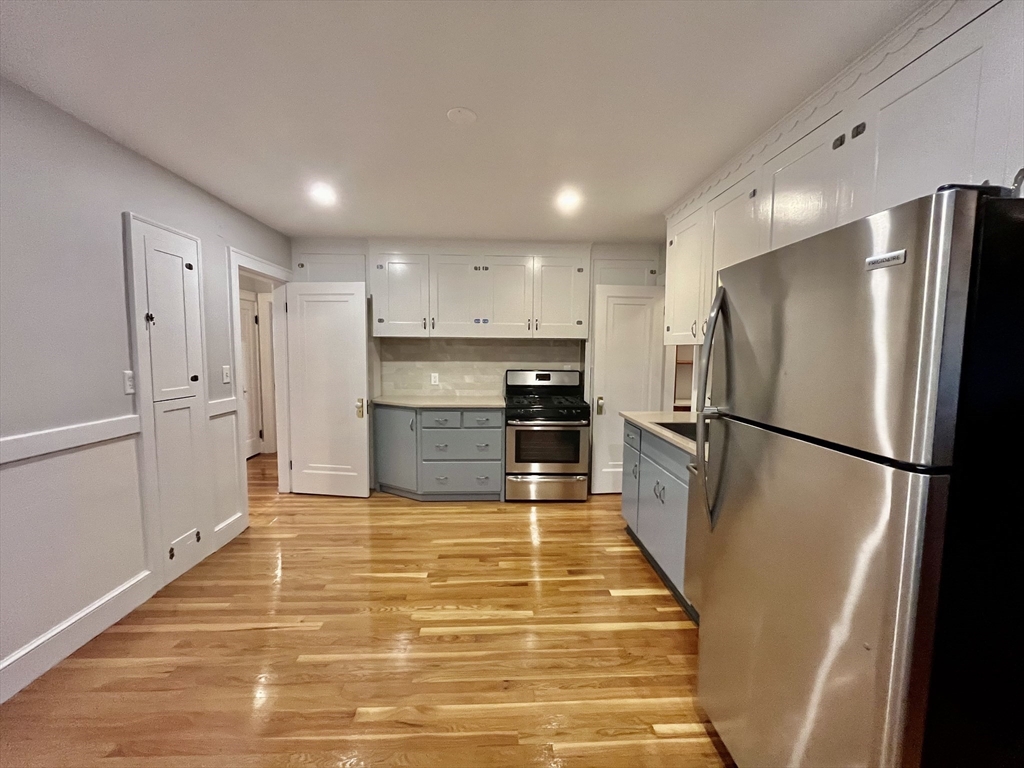 Available December 1st! Recently renovated two bedroom on desirable President's Hill. Beautifully refinished hardwood floors throughout. Bedrooms are evenly sized with adjacent linen closets, on either side of the nicely updated bathroom. The living room is grand with french doors from one of the bedrooms, large front-facing windows, and a walk-in cedar closet. Big eat-in-kitchen features stone countertops, stainless steel appliances (including dishwasher), and a pantry with in-unit, stacked laundry. Enclosed porch and driveway parking are just outside of the kitchen entrance. Private basement storage area. Great location near all that downtown Quincy offers- groceries, restaurants, shopping and a 5 minute walk to the redline Quincy Center T. No smoking. Cats are considerable for an additional $50/month. First month's rent and security deposit for move-in.
