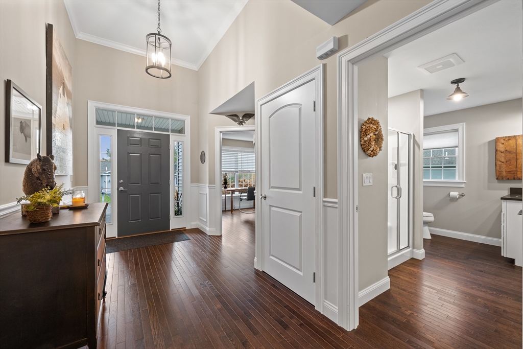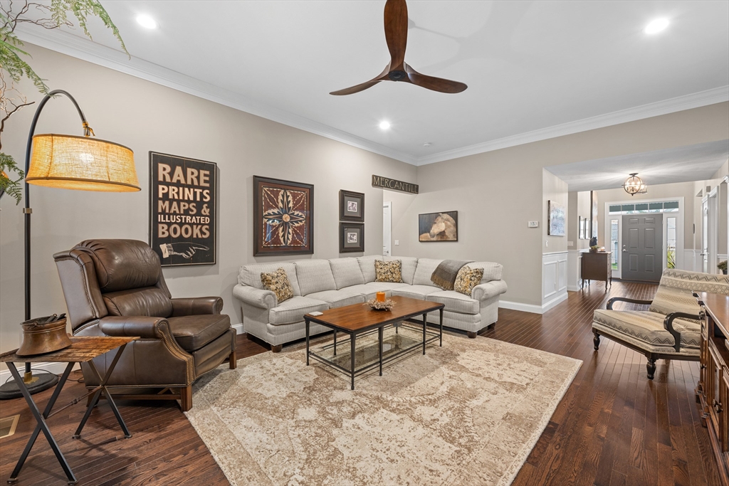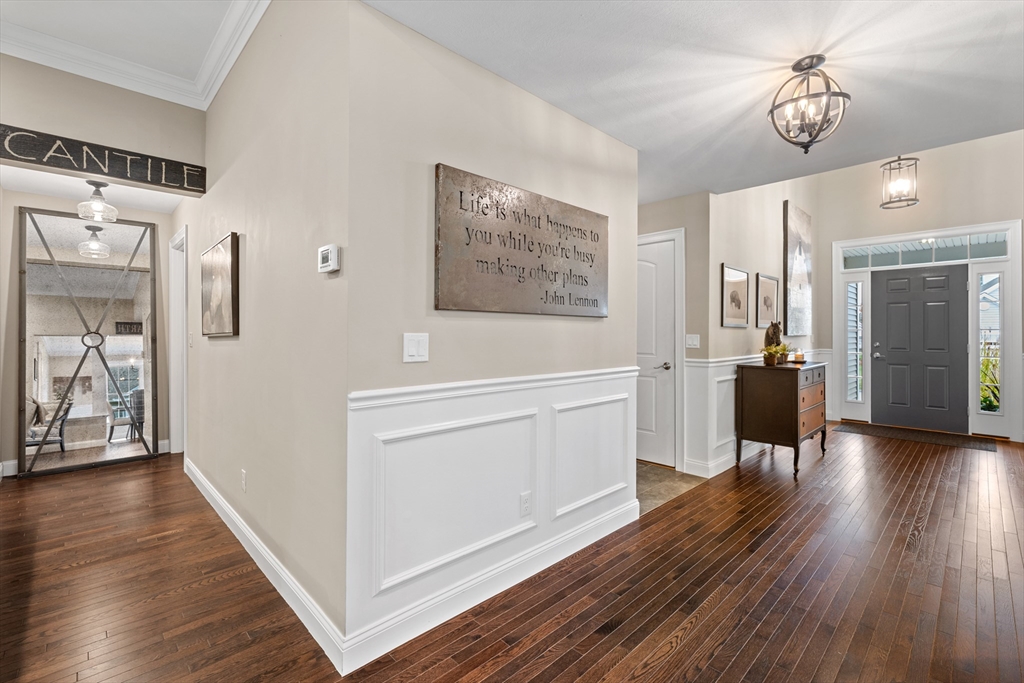 If you’re looking to upgrade to less work & more living, welcome home to The Village at Old Mill, a sought-after 55+ community! This newly built, single-level home features 2 bedrooms, 2 full baths & thoughtful upgrades. Inside you'll find gleaming hardwood floors (no carpet here!) & soaring ceilings. The inviting foyer leads to a guest room, full bath with granite counters & walk-in shower, and a charming dining room with wainscoting & crown molding. The kitchen is a showstopper, complete with honed granite countertops, Fisher & Paykel appliances & an extended peninsula perfect for gathering. The living room centers around a cozy gas fireplace & opens to a covered Trex deck & custom stone patio with built-in bar, an entertainer’s dream! The primary suite offers coffered ceilings, a walk-in closet & a spa-like bath with double vanity, tiled shower & soaking tub. With central air, vac, generator & a 2-car garage, plus a low HOA where you own the land, it's the perfect place to relax!