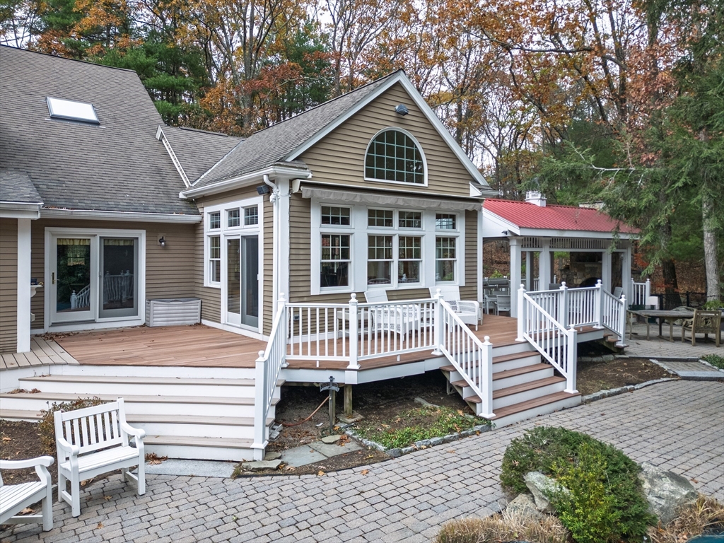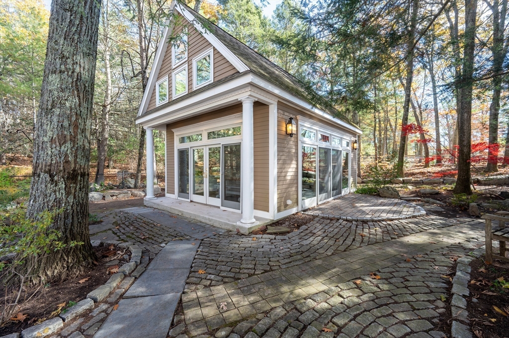 Discover privacy and tranquility at this stately 4-bedroom colonial nestled on a quiet cul-de-sac street in desirable Sheldonville. Lovingly maintained and thoughtfully updated by only one family, this home offers timeless charm and modern convenience. Step inside to find a spacious layout ideal for entertaining, featuring an updated kitchen, a cozy library, a sun-drenched sunroom, and a 3-car garage. Upstairs offers four large bedrooms including a primary suite, plus a finished third floor with flexible space ideal for a playroom, home office, or studio. The backyard is a private oasis, complete with walking paths and lush gardens that bloom from spring to fall. Outdoor living is elevated with a sparkling heated pool, a heated pool house, a charming gazebo, lofted barn, and large covered porch with massive stone fireplace. Additional highlights include a whole-house generator and exceptional storage throughout. A rare find offering true tranquility, privacy and timeless charm.