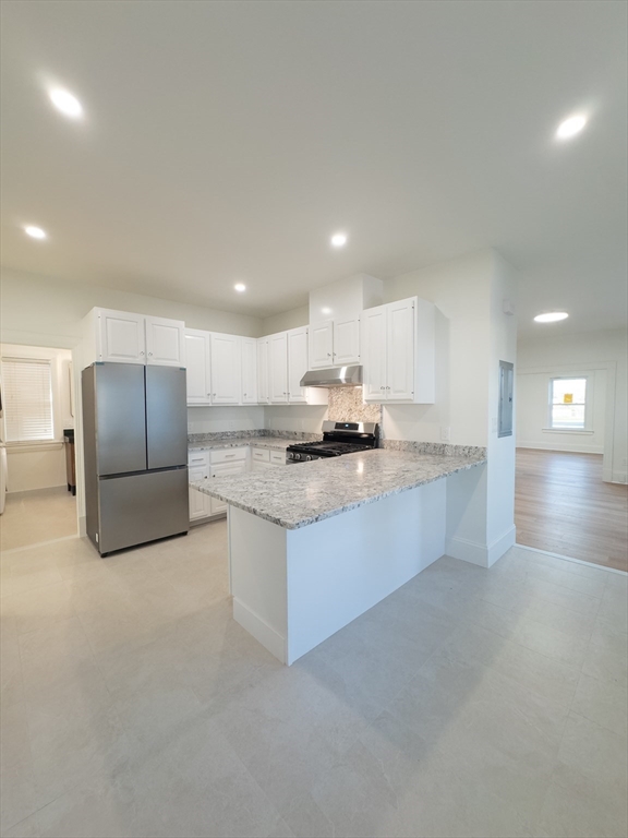 Welcome to 242 Parker Street—a fully renovated 3 bed / 1 bath apartment redefining modern living in Lowell’s Highlands. Every inch has been transformed: brand-new stainless-steel appliances, in-unit laundry, and two private decks (one screened) offer comfort and style. The kitchen impresses with White Ice granite countertops, elegant finishes, and thoughtful lighting throughout. A separate Calacatta Ludovico marble dry bar creates a perfect space for entertaining or unwinding. Enjoy Golden Afternoon vinyl plank flooring, Castille porcelain tile, and a Dekton Bergen porcelain shower for a true spa experience. With new insulation, electrical, and plumbing, plus basement storage, this home delivers worry-free, energy-efficient living minutes from Downtown and UMass Lowell. Every finish was hand-selected to impress—experience the best of Lowell living.
