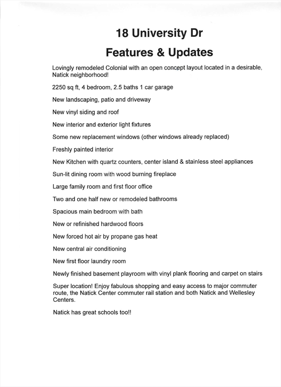 Discover this newly renovated Colonial, located on a tree-lined street in one of Natick's most desirable neighborhoods–truly move in ready! The spacious 4-bedroom, 2.5 bath home welcomes you w/a freshly painted interior & gleaming new or refinished hardwood floors. The open 1st level boasts a newly remodeled kitchen w/quartz counters, island & stainless-steel appliances, a spacious dining room w/ fireplace, mudroom, laundry, new half bath, office & large family room which leads to a new patio overlooking expansive views. The second floor has a main bedroom wi/new ensuite, a renovated full bath & 3 spacious bedrooms. The lower level offers a newly finished playroom w/vinyl plank flooring. Outside updates include new lighting, refreshed landscaping & a terraced backyard. Just minutes from both Natick & Wellesley Centers w/easy access to commuter rail stations, restaurants, shopping, the library, the arts & farmer’s market. Benefit from excellent schools & proximity to major routes.