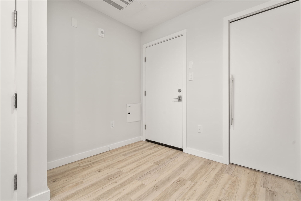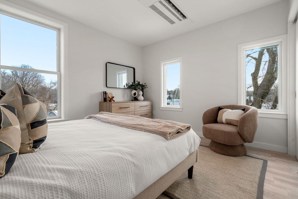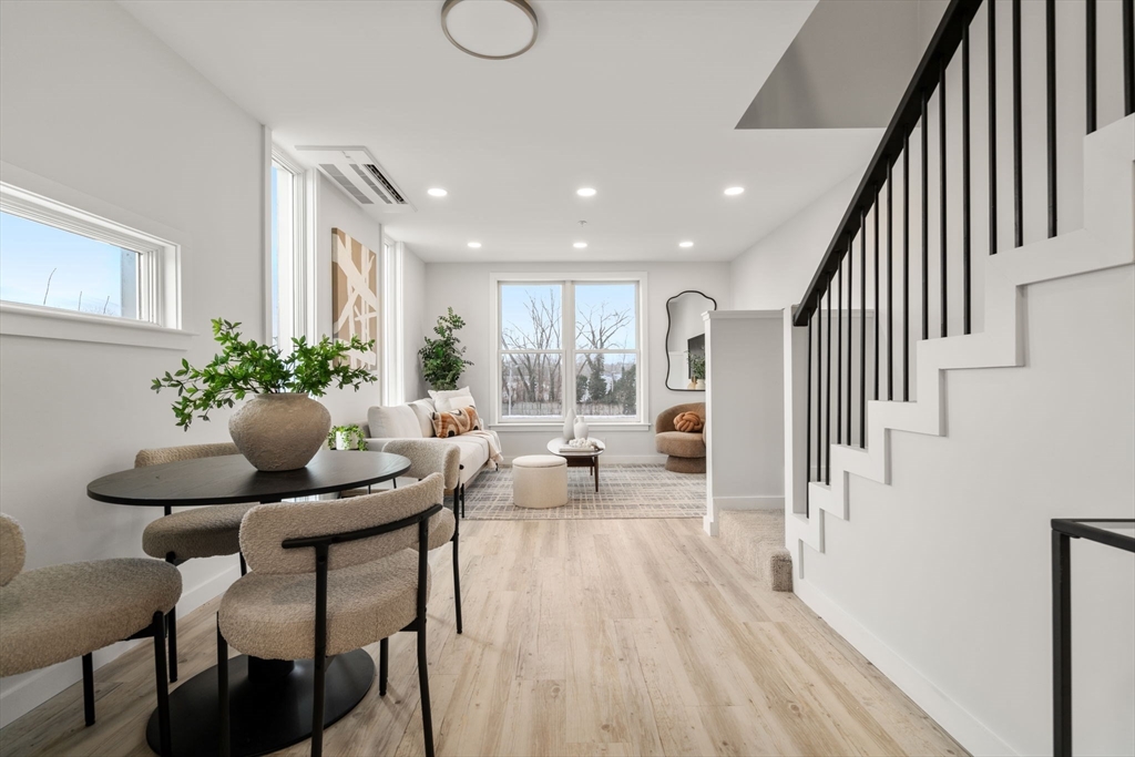 Welcome to Unit 14 at The Canterbury, a beautifully crafted end unit in Roslindale’s newest townhome community, offering modern design and thoughtful livability. This move-in-ready two-bedroom, one-and-a-half-bath home spans two well-designed levels, creating a natural separation between entertaining and private spaces. Additional end-unit windows enhance privacy and fill the home with natural light, highlighting the open-concept main level with oversized windows and sleek contemporary finishes. The kitchen features stainless steel appliances, quartz countertops, soft-close Shaker cabinetry, and a striking glass tile backsplash, seamlessly connecting to the living and dining areas. Upstairs, two generous bedrooms provide ample closet space, while the spa-inspired bathroom includes dual sinks and a rain shower. Two deeded parking spaces and abundant storage complete the home, just minutes from Roslindale Village and Forest Hills Station.