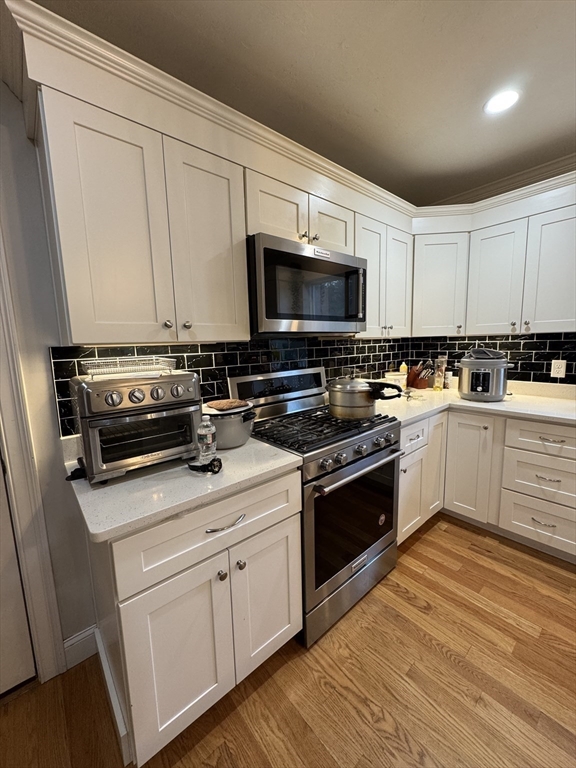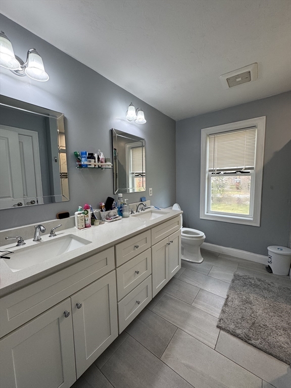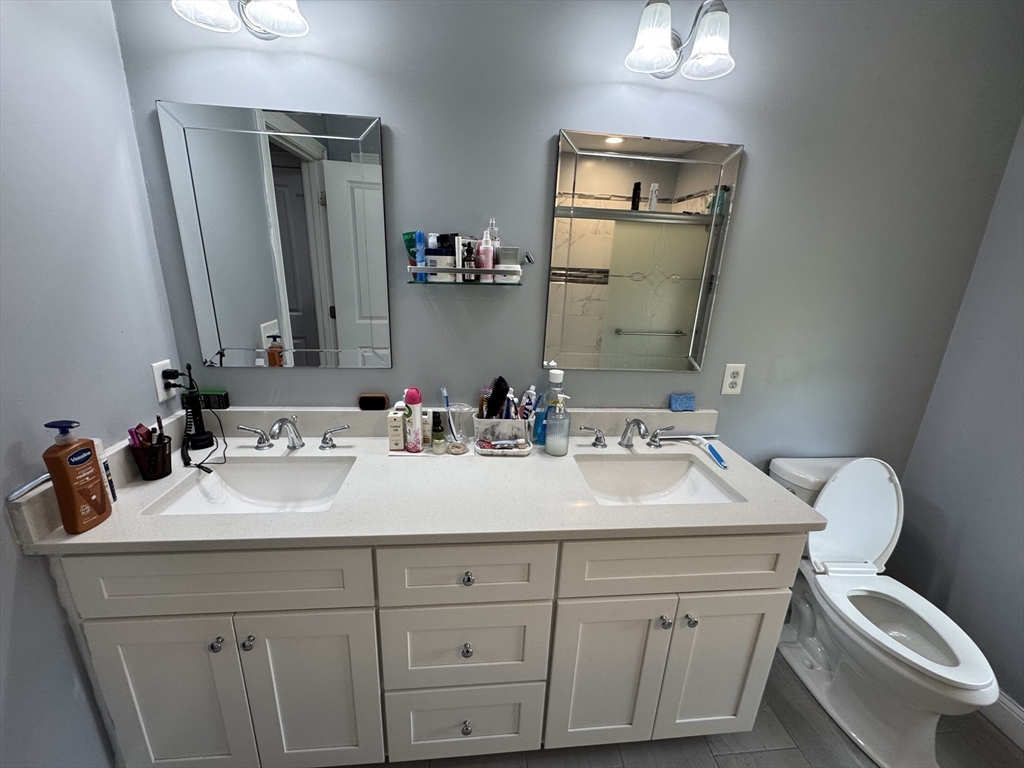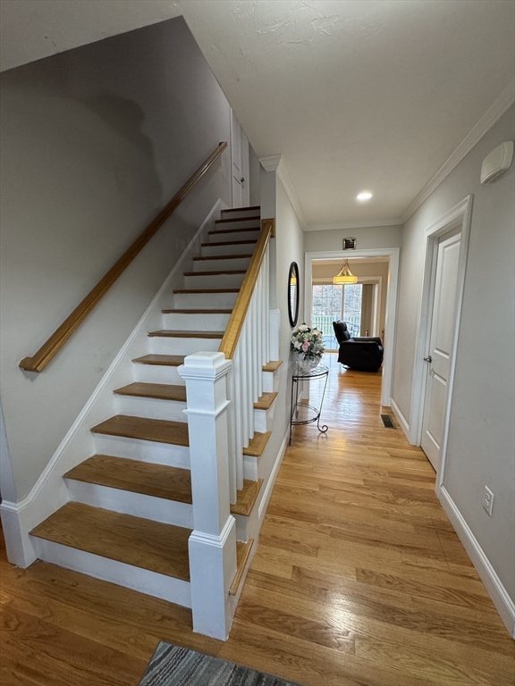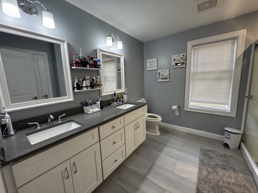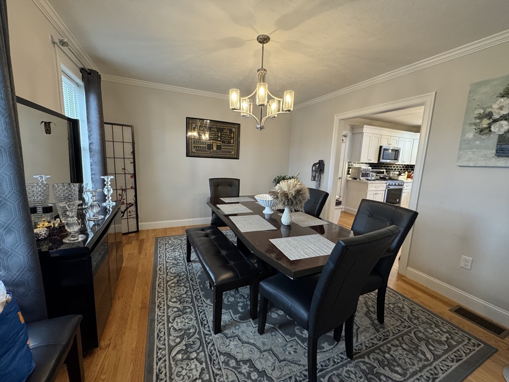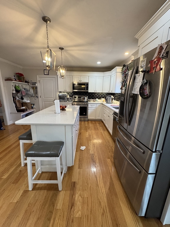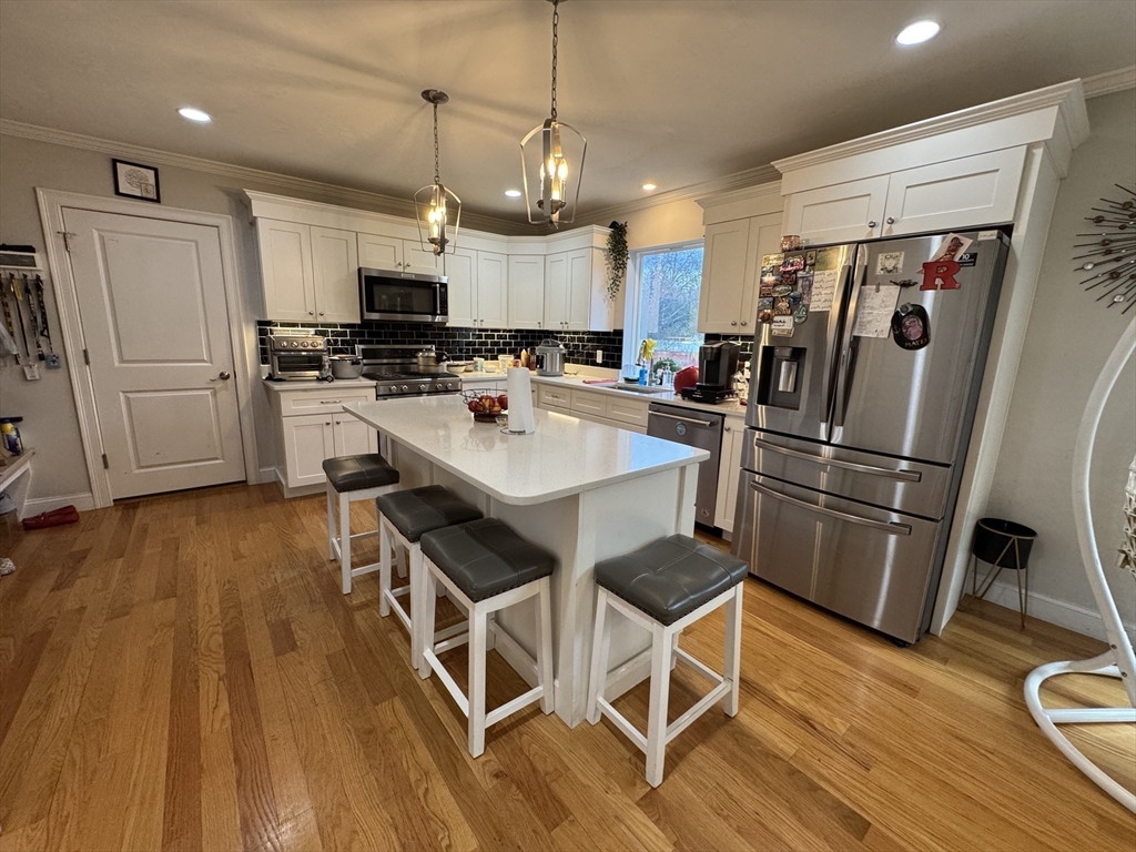 This single-family home offers a blend of comfortable living and outdoor space. Hardwood floor throughout. Beautiful kitchen complete with a large island, stone countertops, shaker cabinets, crown molding, stainless steel appliances, picture window, and a backsplash that adds a touch of elegance. Fireplaced living room complimenting the abundance of natural light coming in the home. The bathrooms provide a spa-like experience with a tiled shower and double vanity, including a private bath in the master bedroom. Half bath on the first floor providing both style and functionality. Upstairs 4 spacious bedrooms with large closets, the master bedroom an ample walk-in closet space. Two car garage and full basement providing ample storage space. The deck offers an ideal spot for outdoor relaxation, and the yard perfect for gatherings or events. Open House this Sunday! 11/09