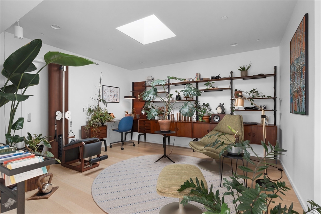This serene 3-bedroom + den, 2.5-bath trophy penthouse features Landmark Protected skyline views and a landscaped Brazilian IPE hardwood roof deck. With top-quality fixtures and finishes, including Italian Pantano marble, Hestan, Miele, Nanz, and hand-painted wallpaper, this bespoke apartment stands apart from typical new developments, balancing luxurious form with functionality. Spanning 2,808 sqft of interior space and over 2,400 sqft of exterior living, the penthouse boasts 18+ foot ceilings and advanced technology, including fully automated Lutron shades and invisible in-wall speakers throughout. Additional highlights include a soundproof primary suite, radiant heat flooring, a 5.1 surround sound theater, a gas fireplace, and a custom 500 lbs Krieger front door. The outdoor kitchen, temperature-controlled wine storage, vintage teak built-ins, mini home gym, and EV charger-approved parking make this an exceptional offering, showcasing one of the finest renovations in the South End.