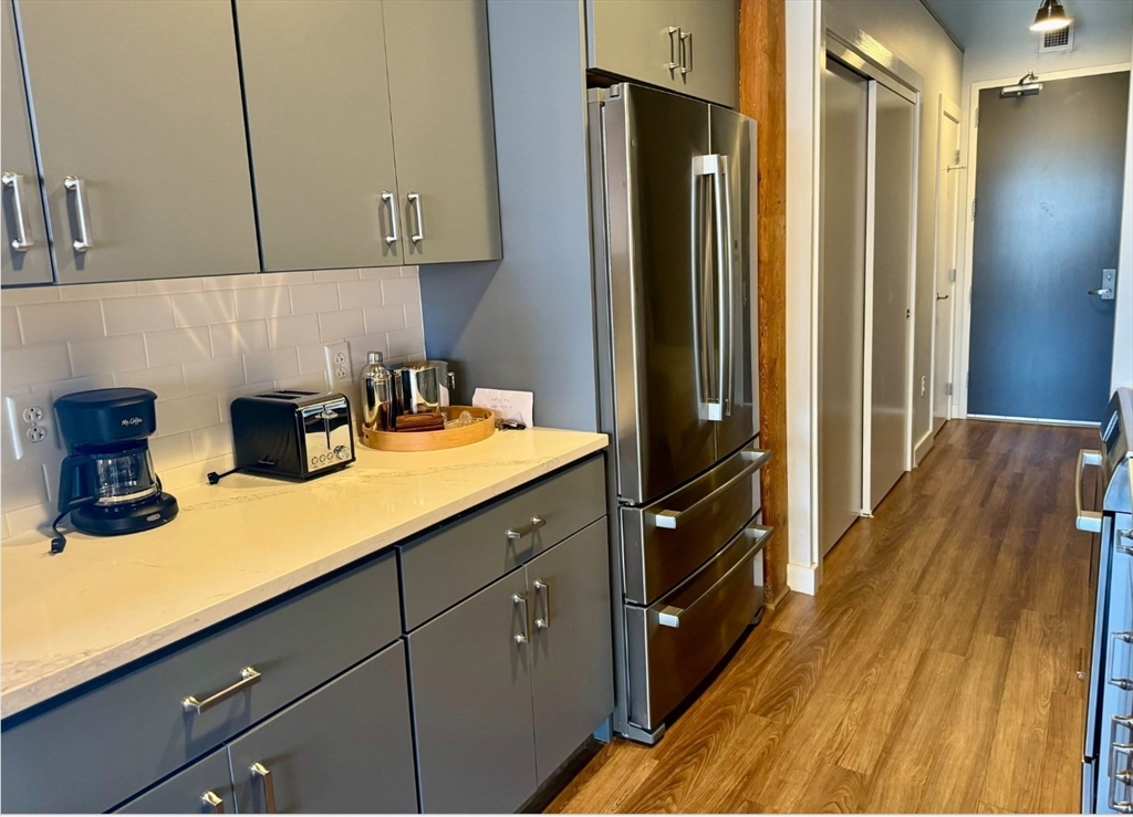 Experience the best of city living in this sun-splashed brick-and-beam residence, perfectly situated in the heart of Fort Point and steps from the Seaport. Soaring 13+ foot ceilings, exposed beams, and hardwood floors create a warm, open feel throughout. Oversized east-facing windows bathe the living area in natural light, while the custom chef’s galley kitchen features abundant storage, quartz countertops, a subway tile backsplash, and a stainless-steel appliance suite.Enjoy thoughtful details like in-unit laundry and generous closet space, plus a shared roof deck perfect for soaking up the summer skyline. Just moments from the neighborhood’s vibrant shops, fine dining, and the scenic Boston Harborwalk, this home offers the perfect blend of historic charm and modern urban convenience the ideal pied-à-terre for city living.