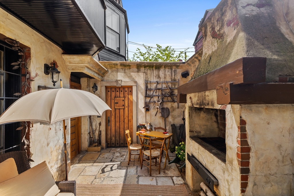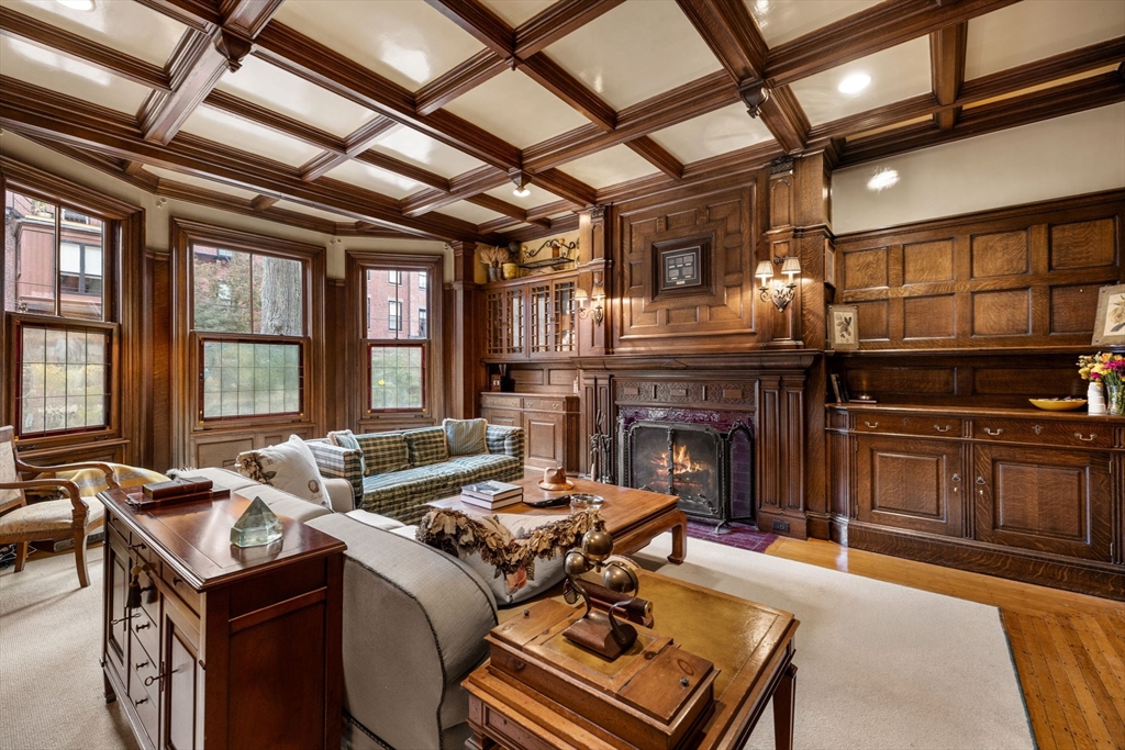 Experience the epitome of Back Bay living in this meticulously crafted three-floor residence. Period details harmonize with bespoke customizations for unparalleled elegance. An elegant foyer with a custom-built staircase leads to the formal living room with paneled millwork, 11-foot coffered ceilings, and expansive bay windows. The gourmet kitchen features a La Cornue gas range and Miele/Sub-Zero appliances, adjacent to a refined dining area with custom pantry storage. Upstairs are two spacious bedrooms with high ceilings, fireplaces, and generous custom closets, along with a luxurious bath. The lower level offers a media room, wine cellar, and sunlit guest suite or office with private bath and kitchenette. A Tuscan-style patio with reclaimed stone and a limestone fireplace provides outdoor living, with direct access parking and a private entrance.