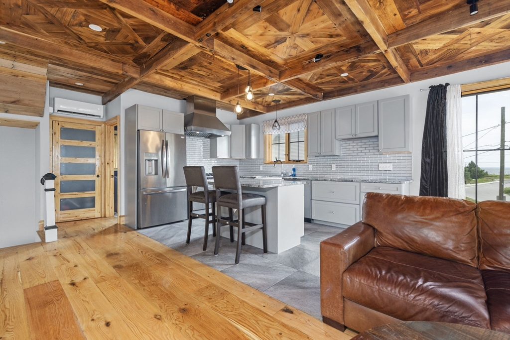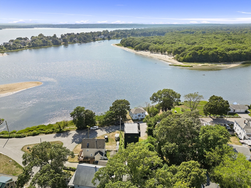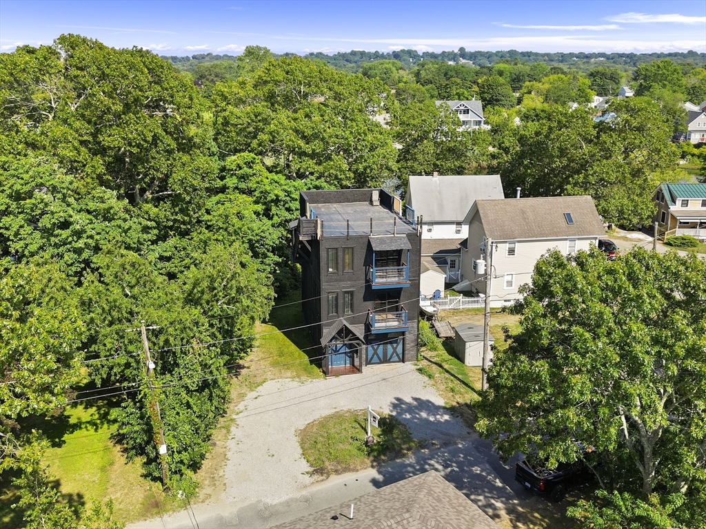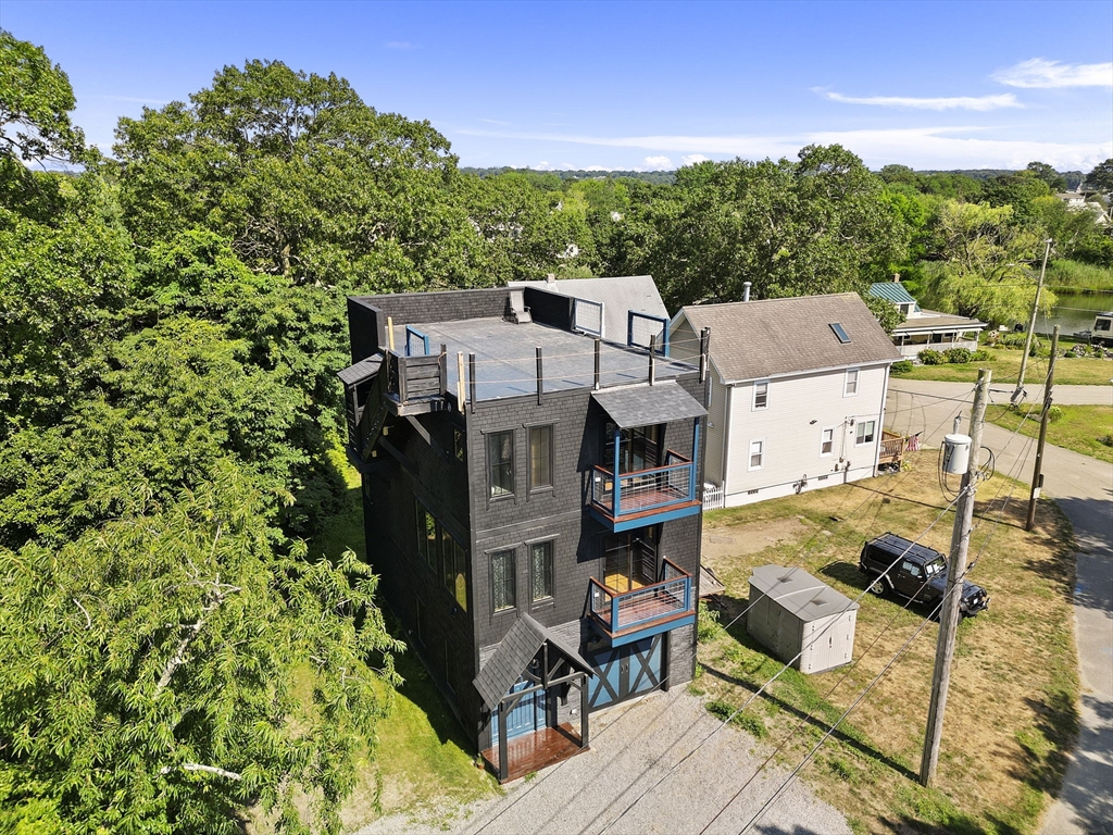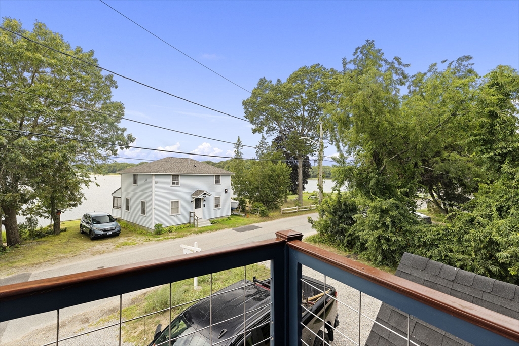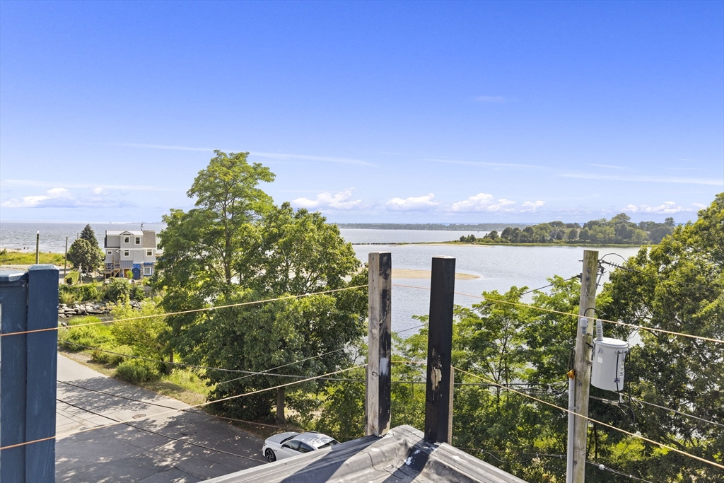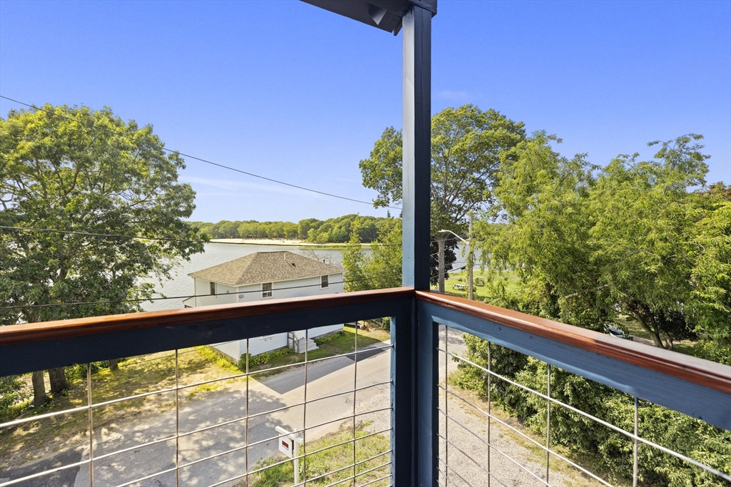 Nestled in a prime location, this newly constructed three-level home boasts two spacious bedrooms and three elegantly designed baths, providing ample living space for comfort and relaxation. Featuring oversized windows that frame breathtaking 180-degree water views, the residence is bathed in natural light, enhancing its open and airy atmosphere. Multiple balconies invite outdoor enjoyment, while the stunning rooftop deck offers unparalleled vistas of Brush neck cove & Greenwich bay. Inside, the wide-plank native oak floors harmoniously complement rustic barnwood ceiling panels, merging modern charm with rustic elegance. The sunlit living room seamlessly connects to a gourmet kitchen, equipped with a Wolf stove, commercial-grade hood, granite island, and a sleek glass tile backsplash. The master bedroom suite features lovely water views and a luxurious full bath with a spacious tiled shower. Additionally, the second bedroom includes its own bath, and convenient washer/dryer facilities