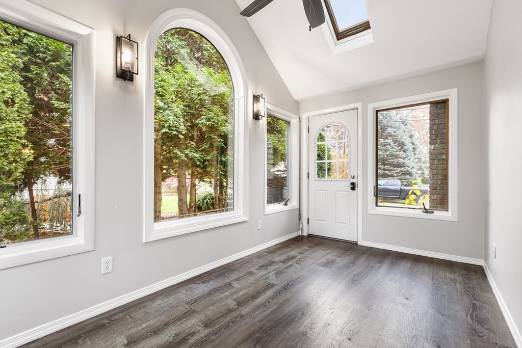 Cozy & commuter-friendly! Charming 2-bedroom, 1-bath ranch tucked into a neighborhood on a corner lot, just steps from coffee, shops, grocery stores & Yentile Farm rec facility. Perfect for savvy first-time homebuyers or anyone looking for easy, single-level living. Inside, enjoy sunny hardwood floors, a wood-burning fireplace, & a functional eat-in kitchen, open to dining area. Bright sunroom with a separate entrance is ideal for a home office, creative space, or playroom. The partially finished lower level offers potential, flex space, & additional storage. Outside, benefit from a garage under, detached garage, & a private, partially fenced backyard, perfect for pets or outdoor gatherings. With easy access to Routes 93, 38, & 129, plus two commuter rail stops nearby, this location is perfect for a connected lifestyle. Move in before the holidays & enjoy your new home in time for the season!
