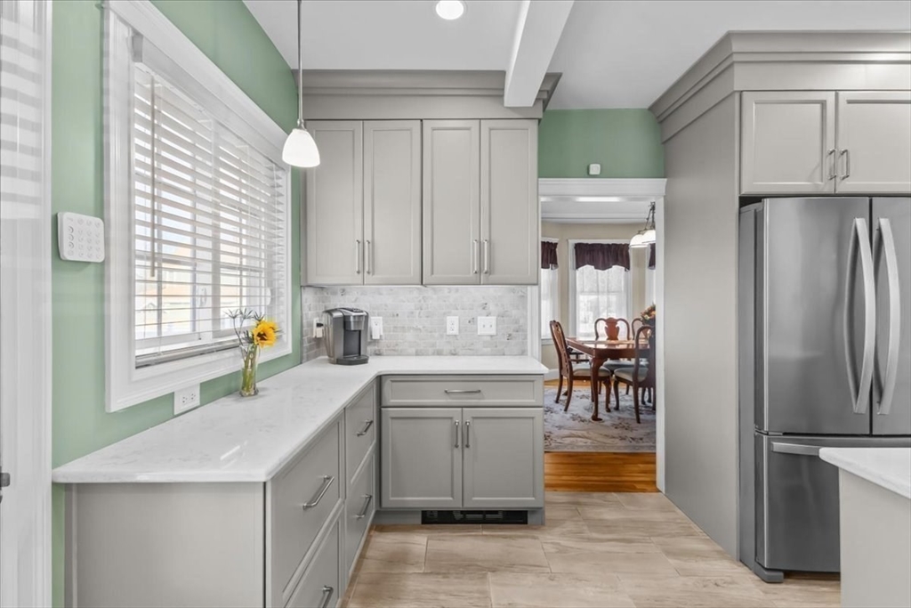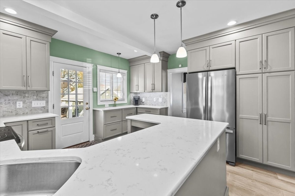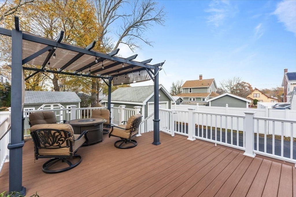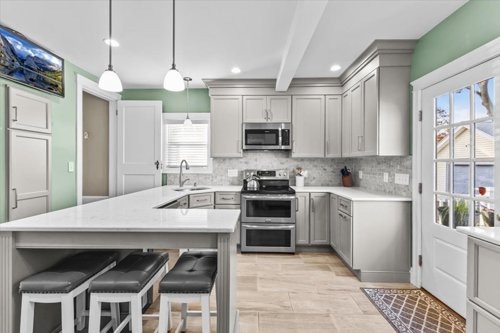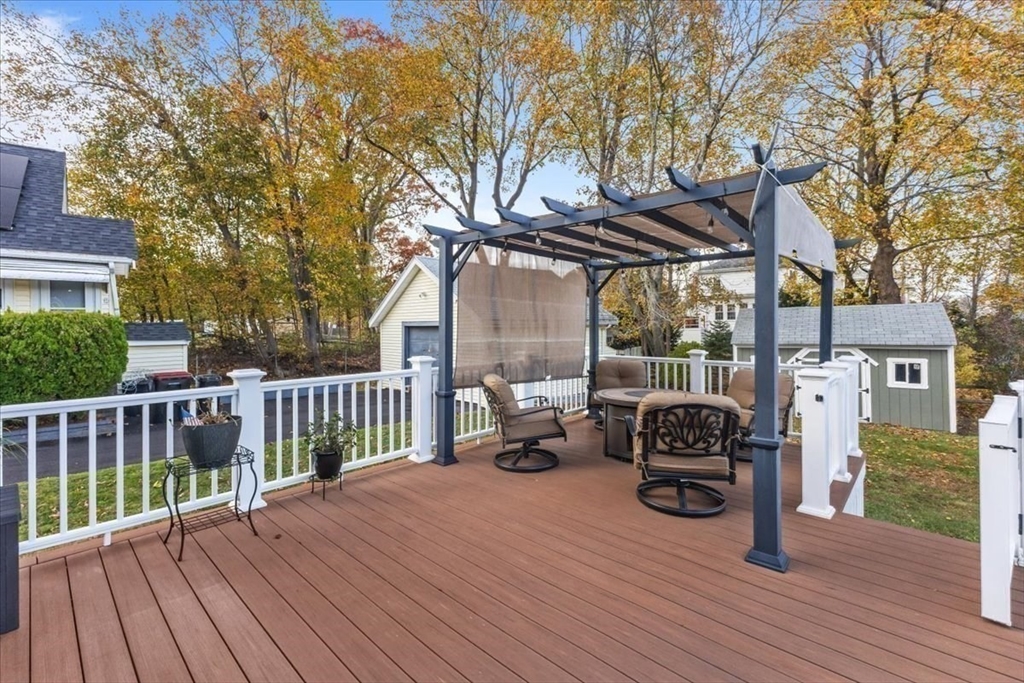 Meticulously maintained and beautifully remodeled West Side Custom Cape! Updates include roof, siding, kitchen, bath, windows, electrical and more. Walking distance to Brockton High School, minutes to RT24 and local shopping. Fire up the grill and take advantage of the large rear deck or sit on the front farmers porch while taking in a pleasant afternoon. First floor highlights a large living room with gas fireplace and hardwood flooring. Sun room could easily be a home office or kids play room, full dining room and a completely remodeled kitchen with breakfast island, new cabinets, appliances and quartz countertops. 2nd floor boasts 3 bedrooms including the large primary bedroom (plenty of space for your king size furniture) and a recently remodeled bathroom with ceramic tile floor, full bath and shower. The partially finished basement includes a family room, full bath, mechanical and laundry room. Plenty of storage with a shed, detached 1 car garage, large closets and pull down attic
