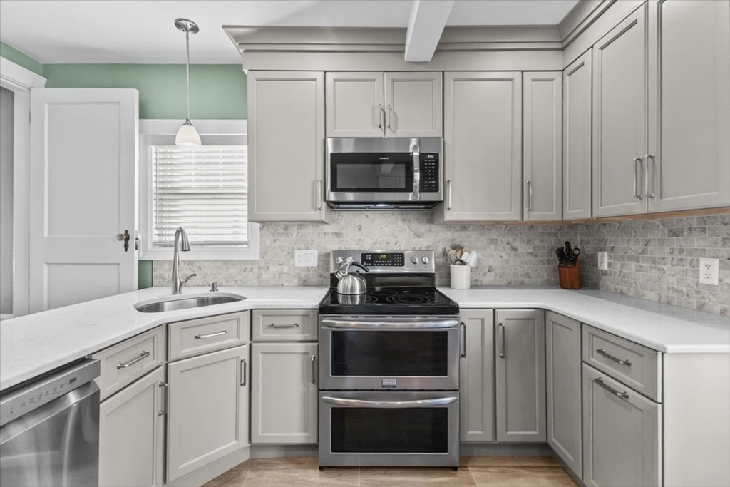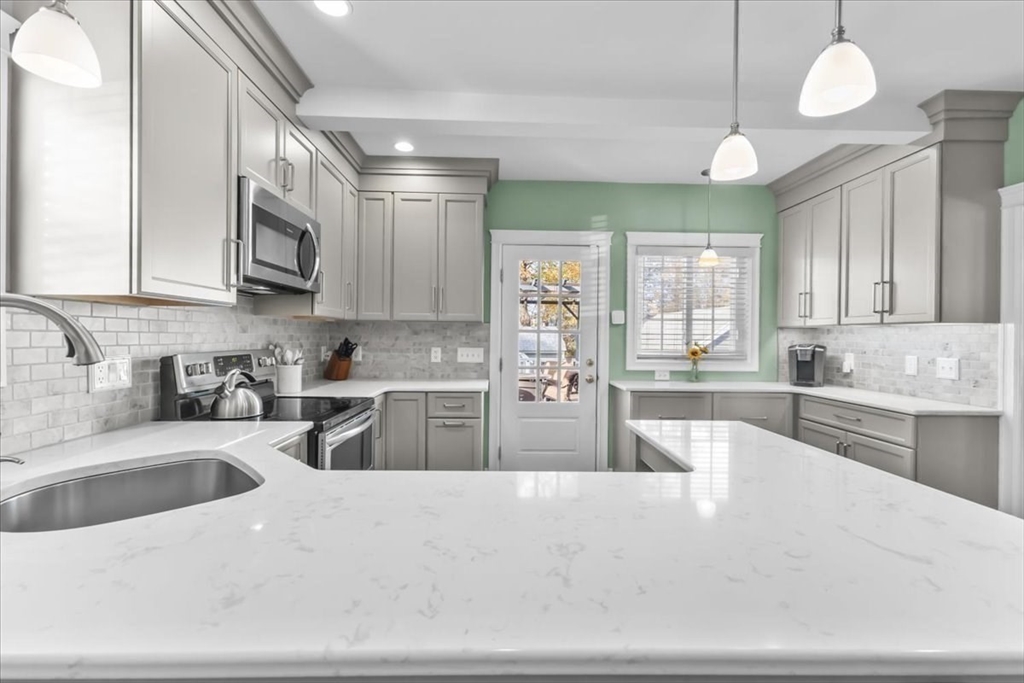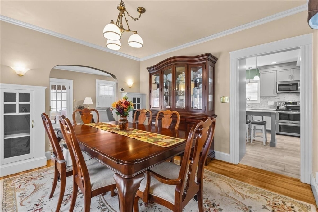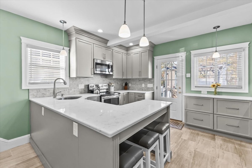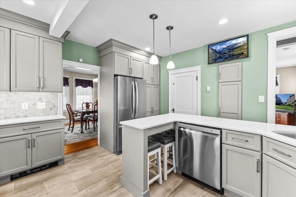Meticulously maintained and beautifully remodeled West Side Custom Cape! Updates include roof, siding, kitchen, bath, windows, electrical and more. Walking distance to Brockton High School, minutes to RT24 and local shopping. Fire up the grill and take advantage of the large rear deck or sit on the front farmers porch while taking in a pleasant afternoon. First floor highlights a large living room with gas fireplace and hardwood flooring. Sun room could easily be a home office or kids play room, full dining room and a completely remodeled kitchen with breakfast island, new cabinets, appliances and quartz countertops. 2nd floor boasts 3 bedrooms including the large primary bedroom (plenty of space for your king size furniture) and a recently remodeled bathroom with ceramic tile floor, full bath and shower. The partially finished basement includes a family room, full bath, mechanical and laundry room. Plenty of storage with a shed, detached 1 car garage, large closets and pull down attic