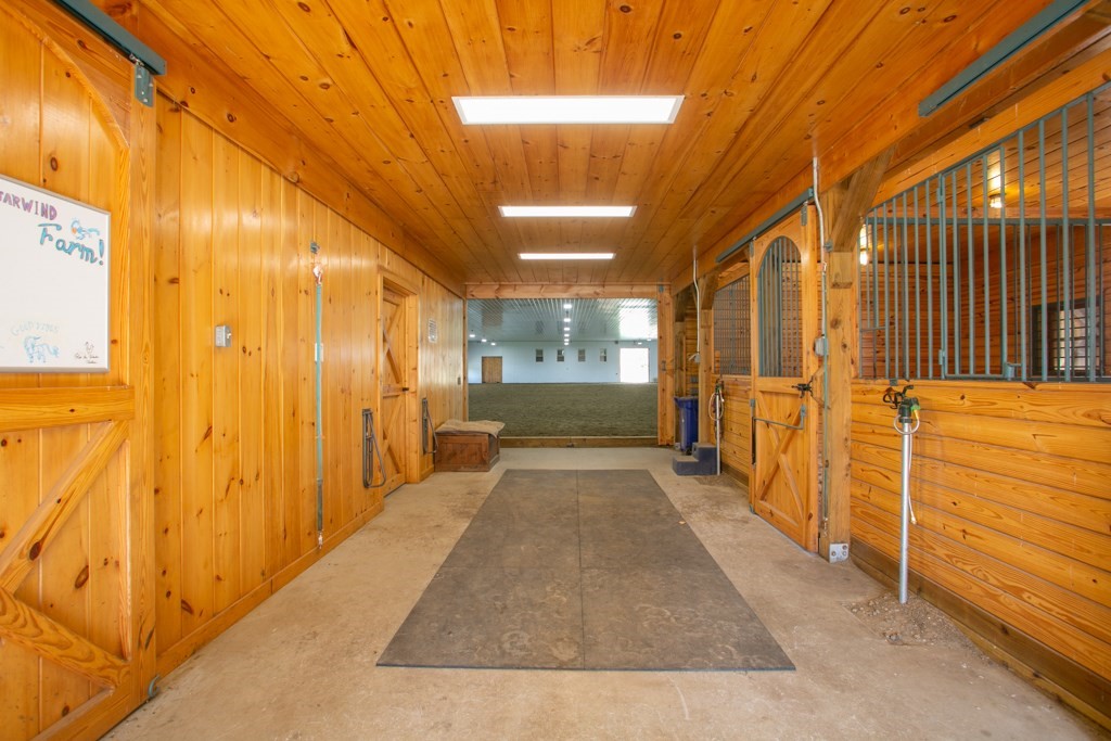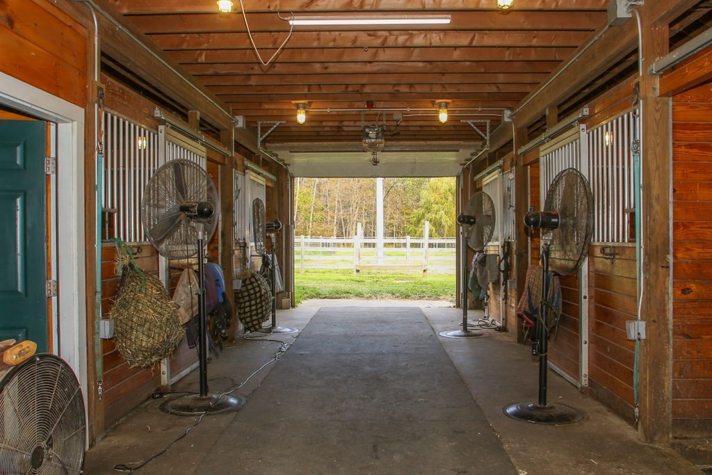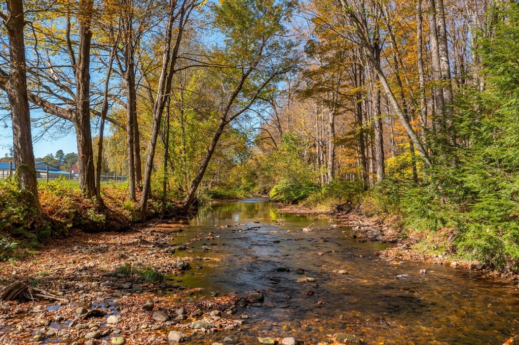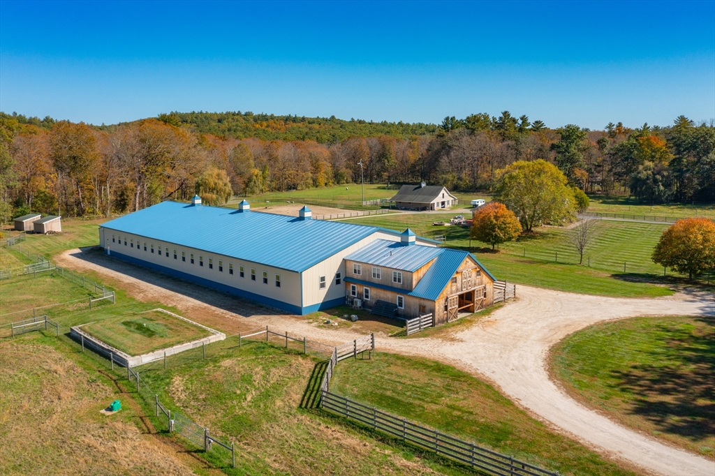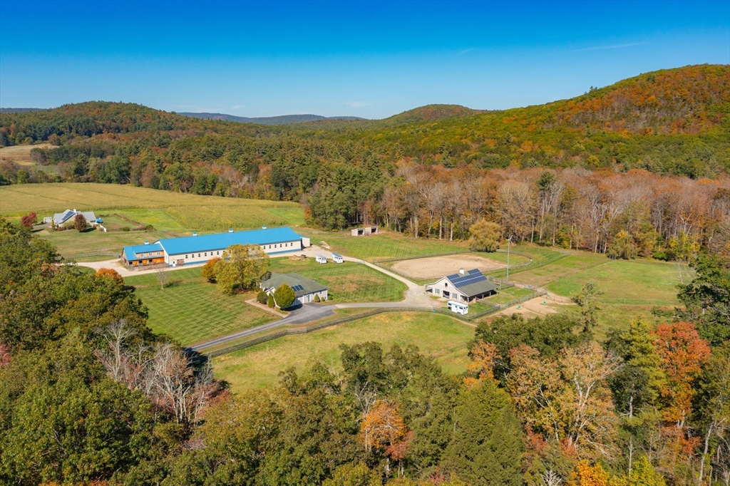An equestrian dream property set on 15 acres in the towns of Westhampton and Northampton with over 1,300 ft of river frontage on the North Branch of the Manhan River. Designed for the discerning horse enthusiast, the estate features nine paddocks, a hunt field, and two exceptional barns. The showcase three-stall barn (built 2019) offers an attached 80’x180’ indoor arena with Tru Tex fiber footing, heated/cooled viewing room, and SIPS construction for energy efficiency. The five-stall main barn includes a hay loft, wash stall, and solar panels supplying power to both barn and residence. The well maintained single-level home offers two ensuite bedrooms with fireplaces, an open kitchen, dining and living area with fieldstone fireplace, laundry room, and full basement with garage access. A rare offering combining craftsmanship, sustainability, and equestrian excellence with easy access to the Five College area and regional show circuits. Floor Plans available for all main structures.