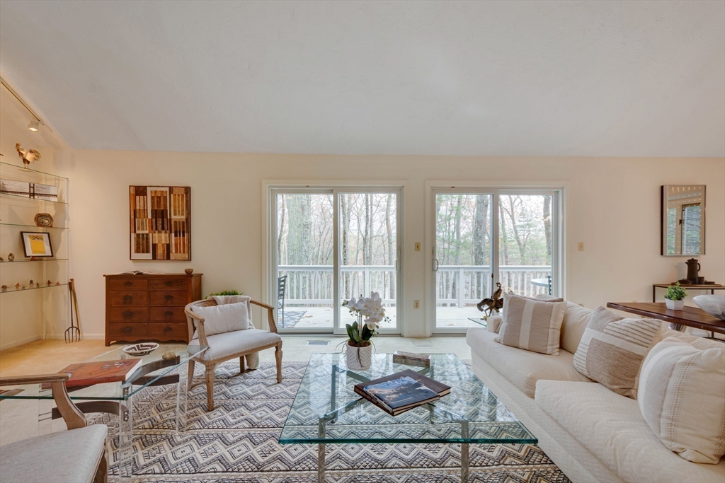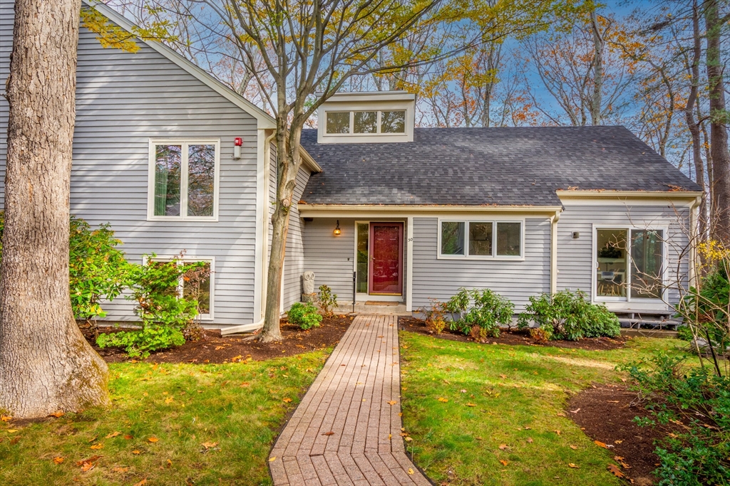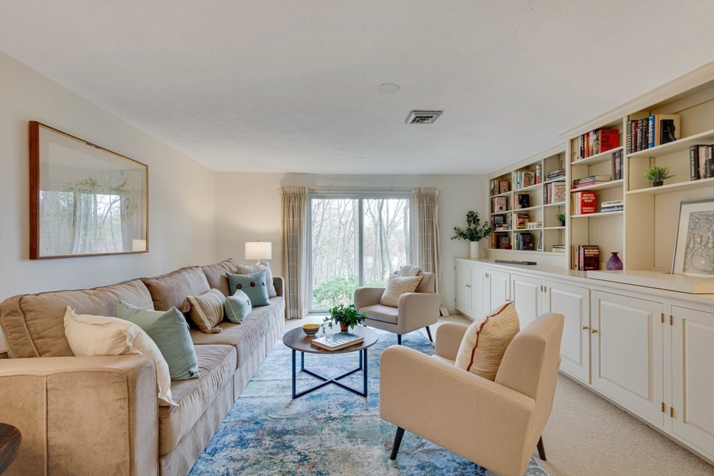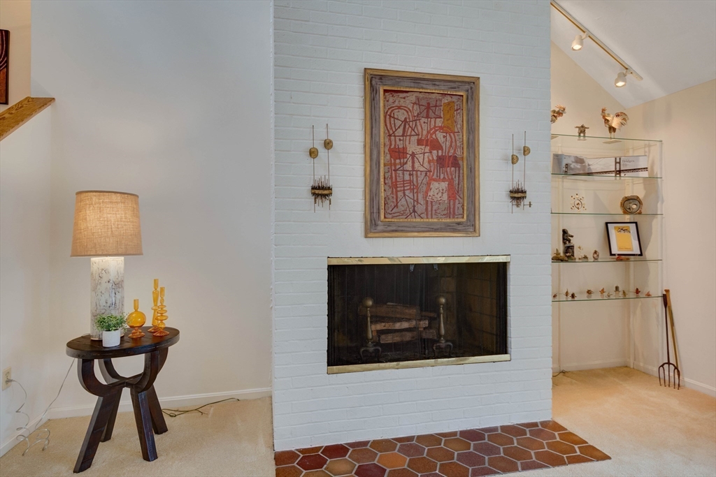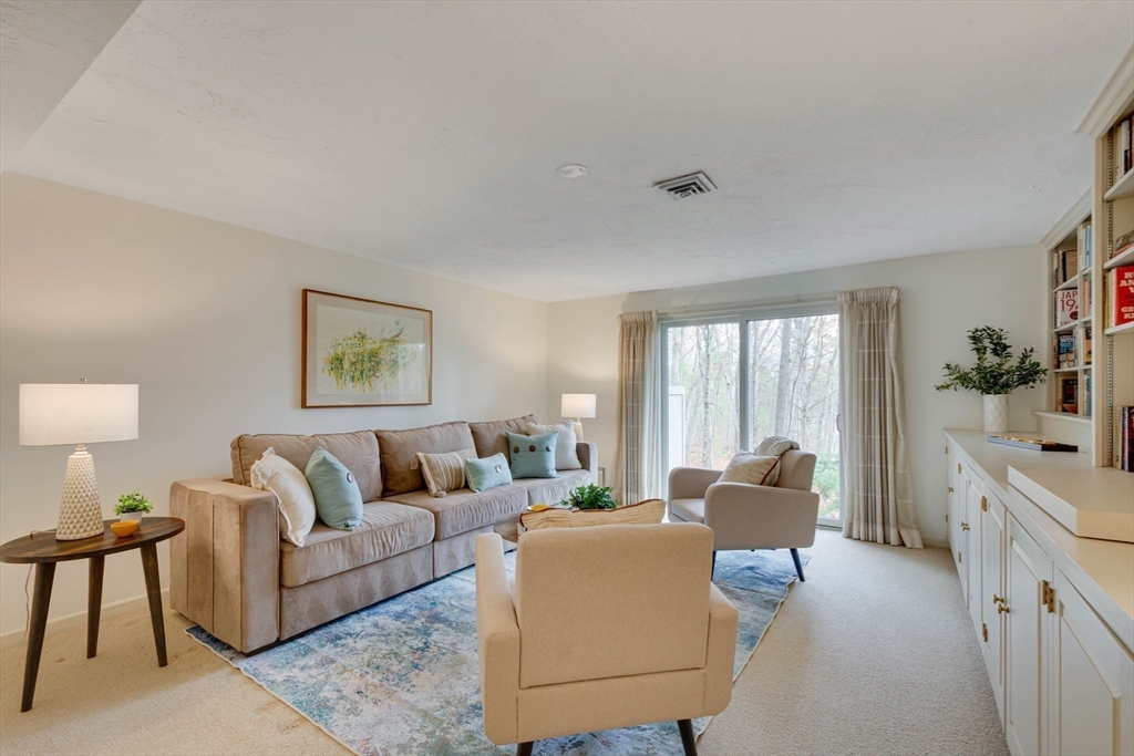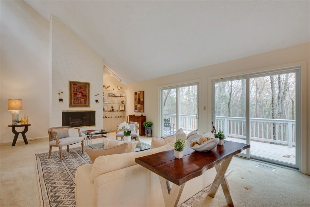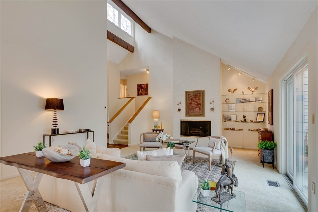 Privately set at the end of a quiet lane in the Lincoln Ridge Condominium community, this inviting three-bedroom, three-bath end-unit townhouse with seasonal 180 degree water views offers a rare blend of tranquility, space, and natural scenery. The open-concept living and dining area features soaring cathedral ceilings, a dramatic floor-to-ceiling brick fireplace, and an expanse of glass doors opening to a deck with views of the pond through the woodlands. The bright, welcoming kitchen includes a generous eat-in area surrounded by windows and sliders. A serene primary suite offers a walk-in closet and a window seat to observe the tranquil views, while the lower level offers a generous family room with built-ins, a third bedroom/home office opportunity, plus a bonus finished room and ample storage. Enjoy the ease of condo living with access to tennis courts, gardens, a canoe launch in Farrar Pond, and miles of scenic trails. Close to town amenities, commuter routes, and train to Boston.