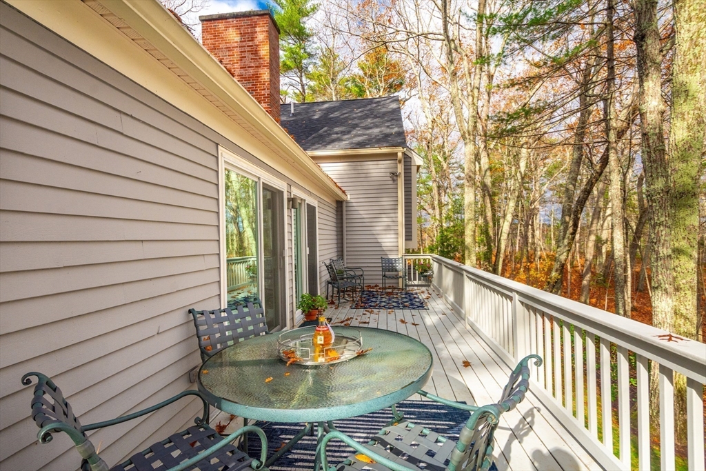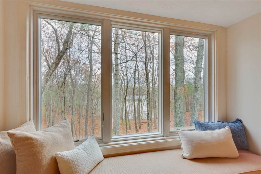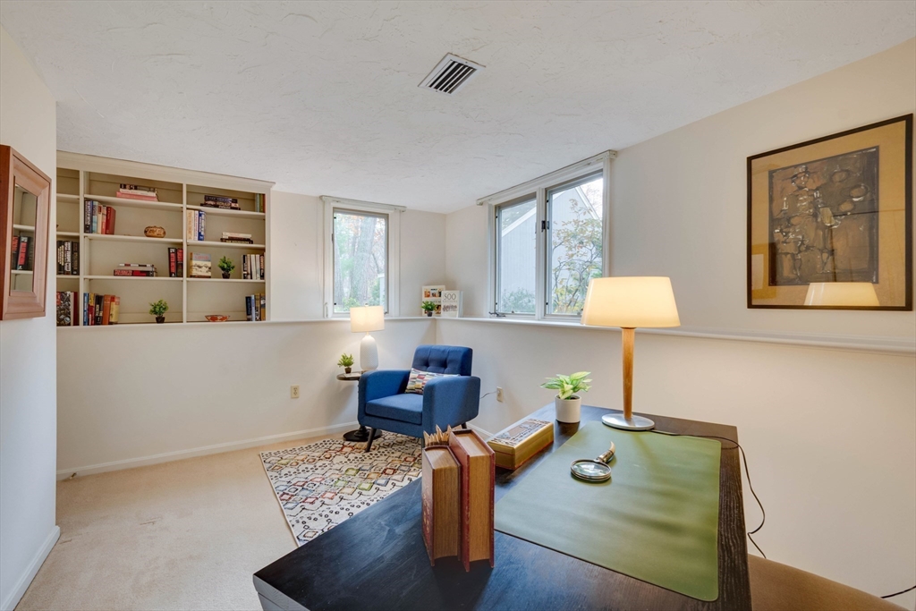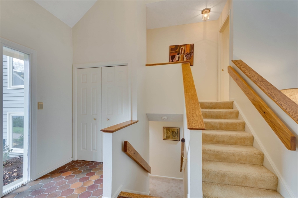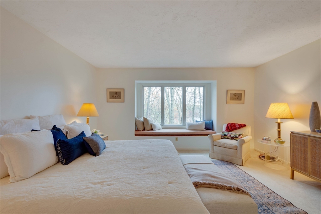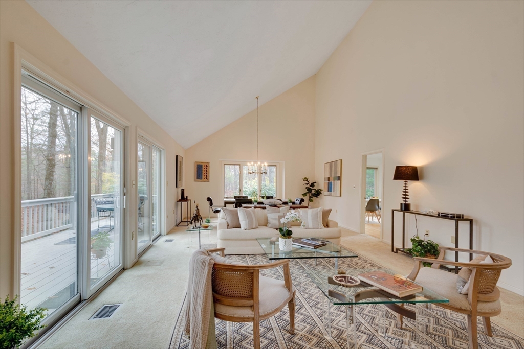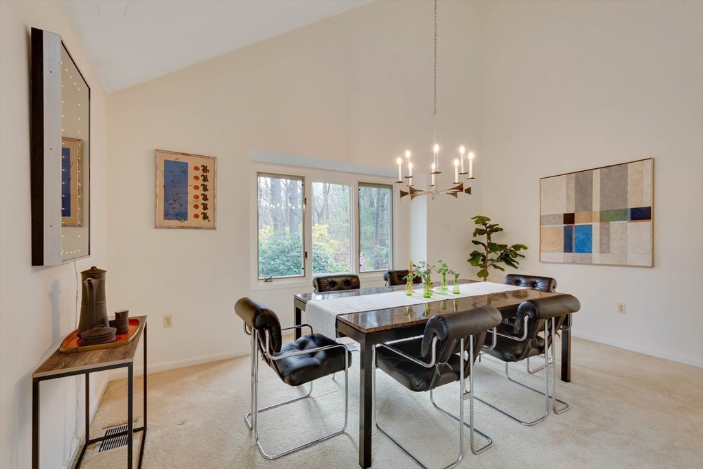 Privately set at the end of a quiet lane in the Lincoln Ridge Condominium community, this inviting three-bedroom, three-bath end-unit townhouse with seasonal 180 degree water views offers a rare blend of tranquility, space, and natural scenery. The open-concept living and dining area features soaring cathedral ceilings, a dramatic floor-to-ceiling brick fireplace, and an expanse of glass doors opening to a deck with views of the pond through the woodlands. The bright, welcoming kitchen includes a generous eat-in area surrounded by windows and sliders. A serene primary suite offers a walk-in closet and a window seat to observe the tranquil views, while the lower level offers a generous family room with built-ins, a third bedroom/home office opportunity, plus a bonus finished room and ample storage. Enjoy the ease of condo living with access to tennis courts, gardens, a canoe launch in Farrar Pond, and miles of scenic trails. Close to town amenities, commuter routes, and train to Boston.