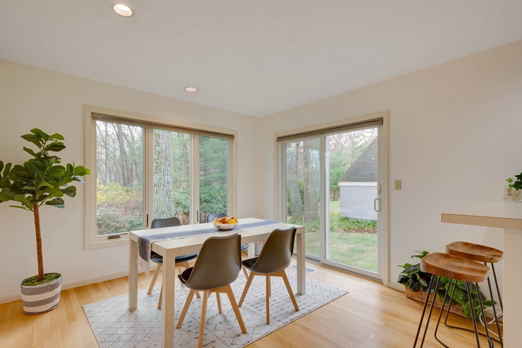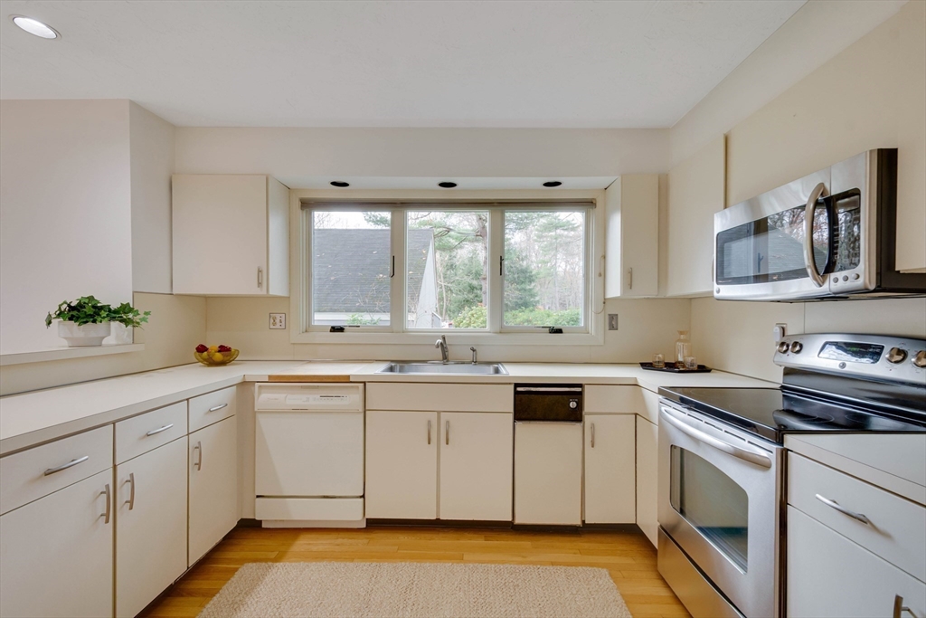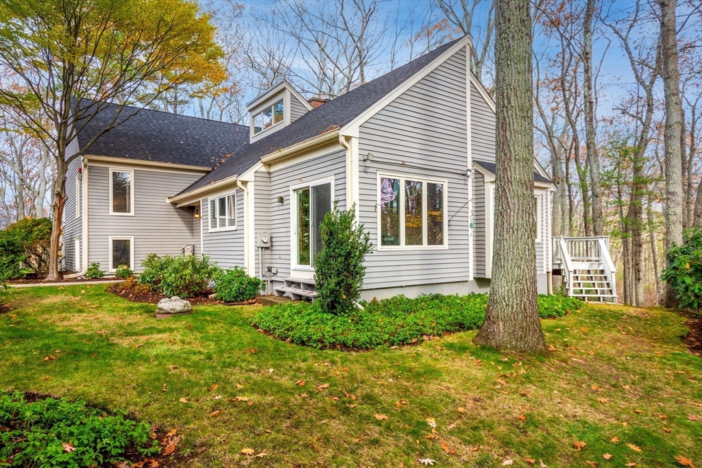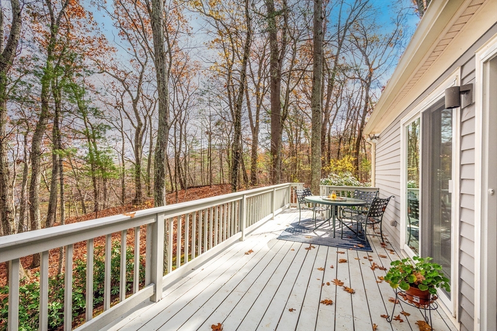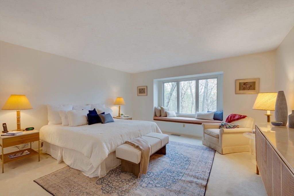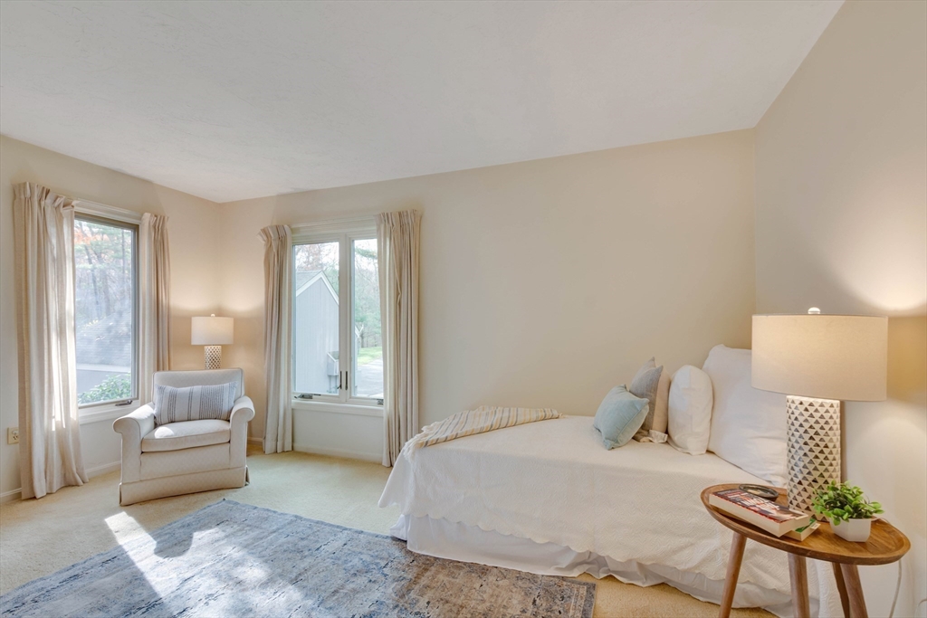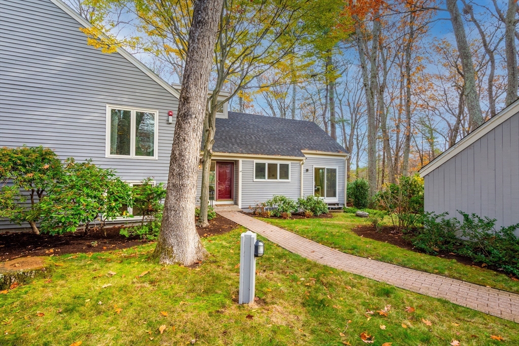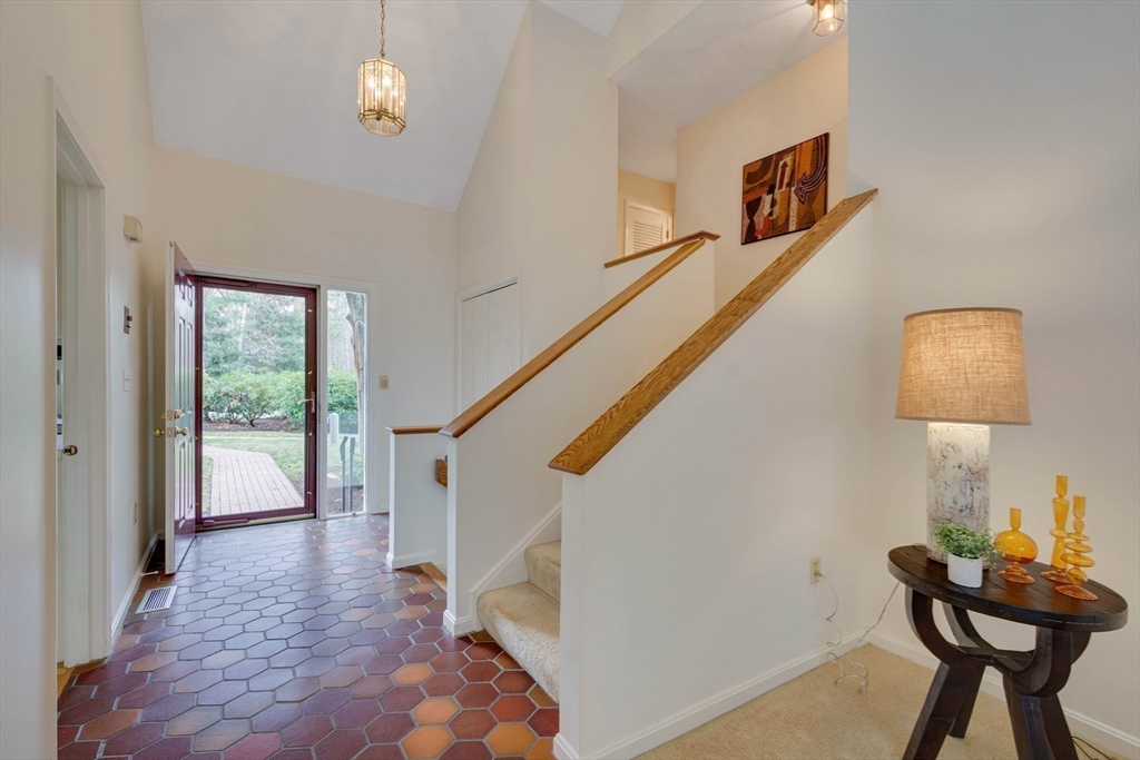 Privately set at the end of a quiet lane in the Lincoln Ridge Condominium community, this inviting three-bedroom, three-bath end-unit townhouse with seasonal 180 degree water views offers a rare blend of tranquility, space, and natural scenery. The open-concept living and dining area features soaring cathedral ceilings, a dramatic floor-to-ceiling brick fireplace, and an expanse of glass doors opening to a deck with views of the pond through the woodlands. The bright, welcoming kitchen includes a generous eat-in area surrounded by windows and sliders. A serene primary suite offers a walk-in closet and a window seat to observe the tranquil views, while the lower level offers a generous family room with built-ins, a third bedroom/home office opportunity, plus a bonus finished room and ample storage. Enjoy the ease of condo living with access to tennis courts, gardens, a canoe launch in Farrar Pond, and miles of scenic trails. Close to town amenities, commuter routes, and train to Boston.