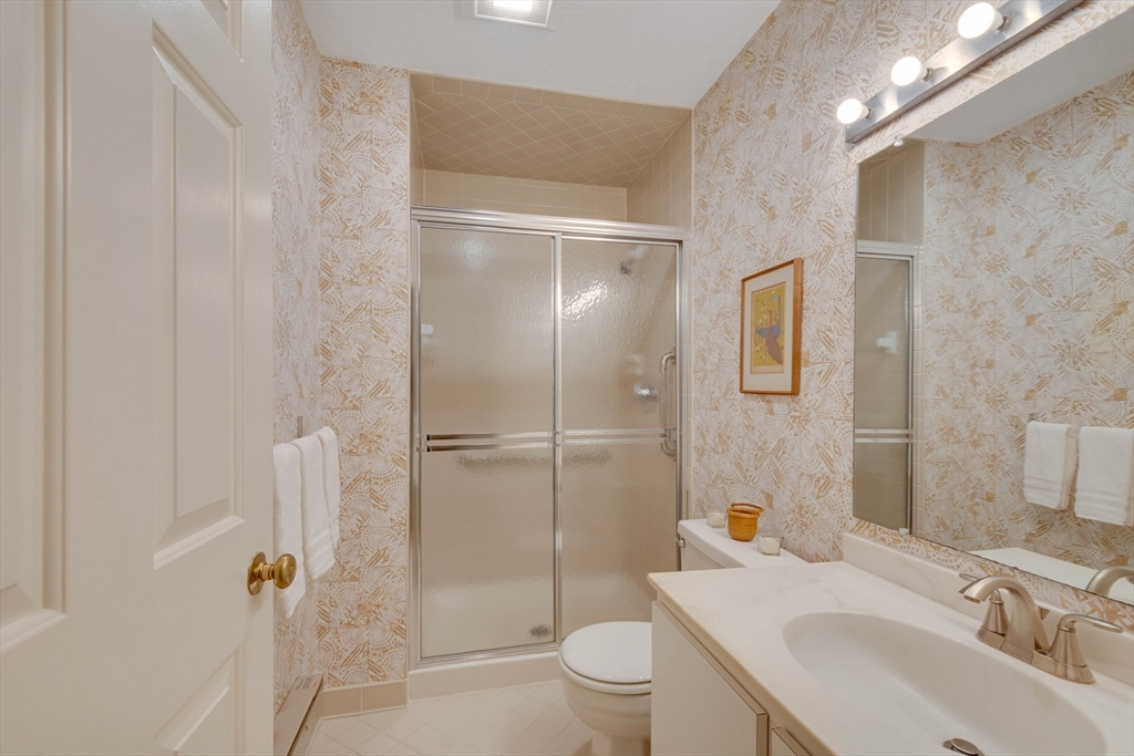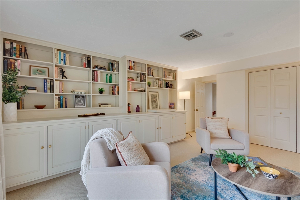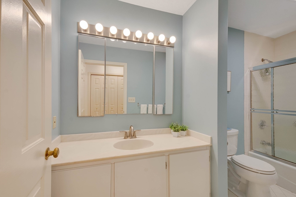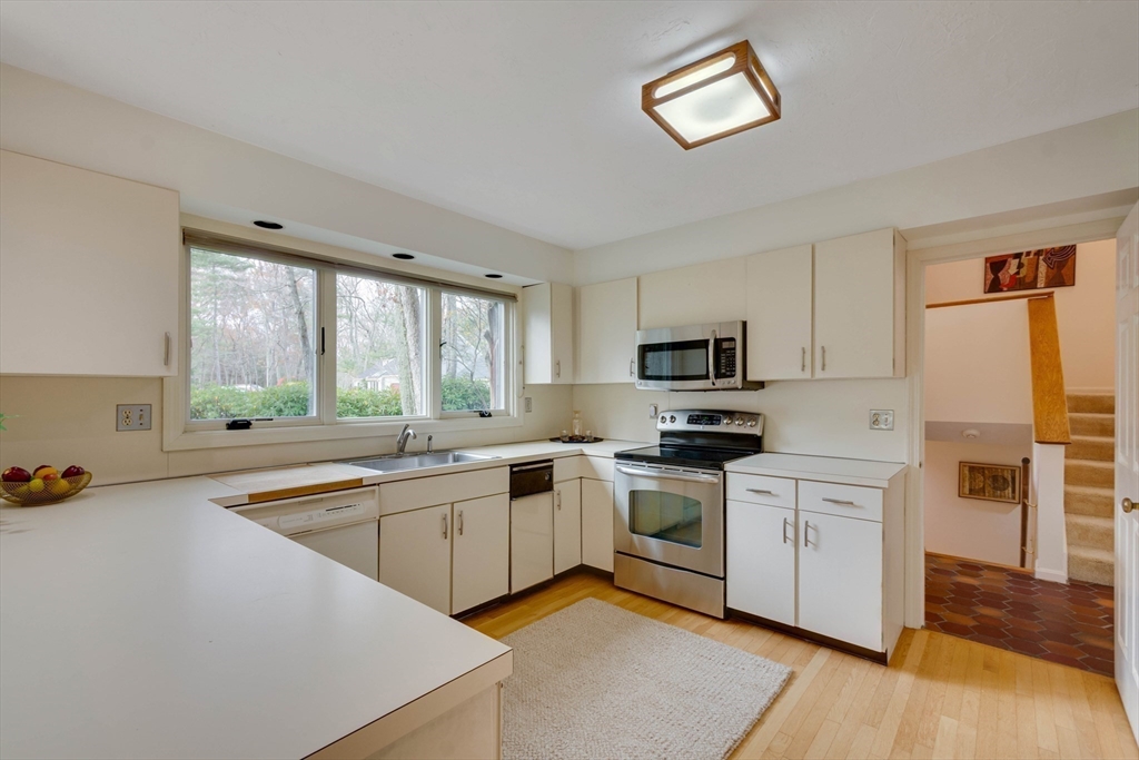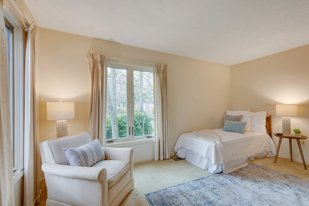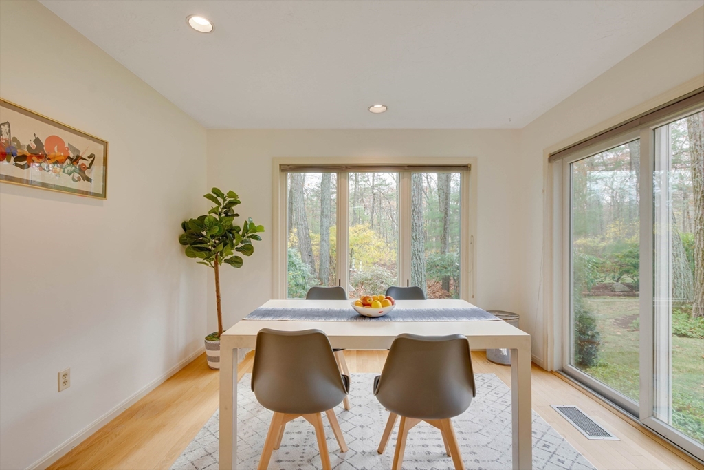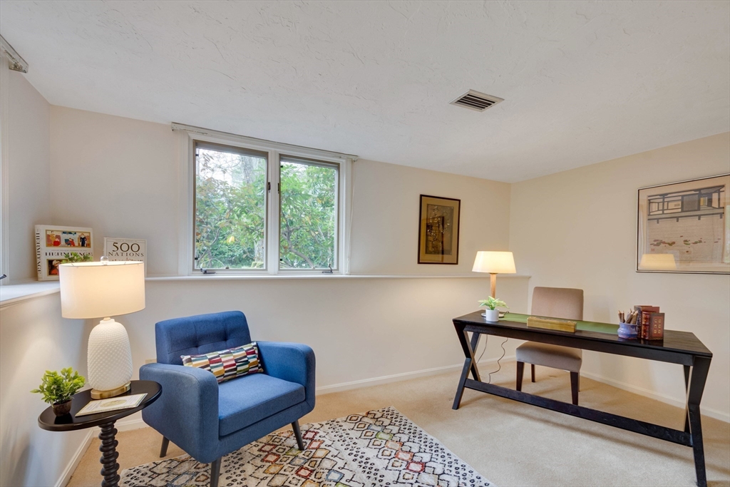Privately set at the end of a quiet lane in the Lincoln Ridge Condominium community, this inviting three-bedroom, three-bath end-unit townhouse with seasonal 180 degree water views offers a rare blend of tranquility, space, and natural scenery. The open-concept living and dining area features soaring cathedral ceilings, a dramatic floor-to-ceiling brick fireplace, and an expanse of glass doors opening to a deck with views of the pond through the woodlands. The bright, welcoming kitchen includes a generous eat-in area surrounded by windows and sliders. A serene primary suite offers a walk-in closet and a window seat to observe the tranquil views, while the lower level offers a generous family room with built-ins, a third bedroom/home office opportunity, plus a bonus finished room and ample storage. Enjoy the ease of condo living with access to tennis courts, gardens, a canoe launch in Farrar Pond, and miles of scenic trails. Close to town amenities, commuter routes, and train to Boston.
