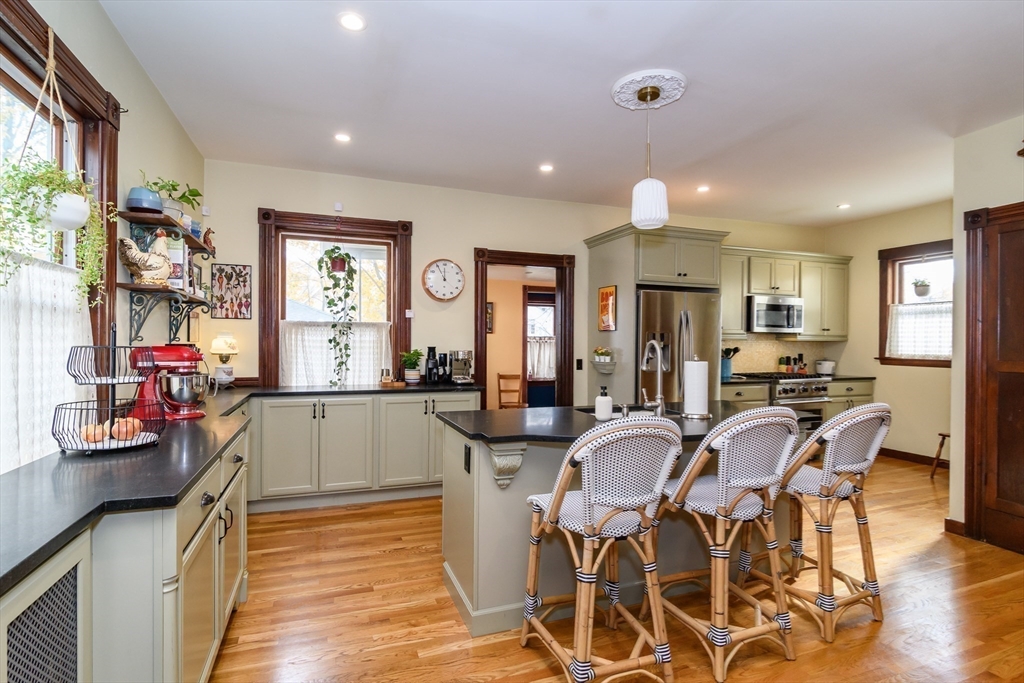This stunning Victorian home perfectly combines timeless charm with thoughtful and modern updates. Featuring pristine original woodwork, architectural details, gleaming hardwood floors, and spacious living areas filled with natural light, it exudes warmth and character throughout. The beautifully updated and expanded kitchen offers modern style and functionality, ideal for today’s lifestyle. A formal living room, dining room and large entry way establish the heart of the home. A half bath, mudroom and laundry area complete the first floor. The second floor offers 4 spacious bedrooms and a home office! The finished third floor offers a versatile retreat—perfect for a private office, media room, or play space. Enjoy outdoor living on the inviting patio within the fenced yard, ideal for relaxing or entertaining. A two-car garage adds convenience and extra storage. With its blend of historic elegance and modern upgrades, this home is truly special.