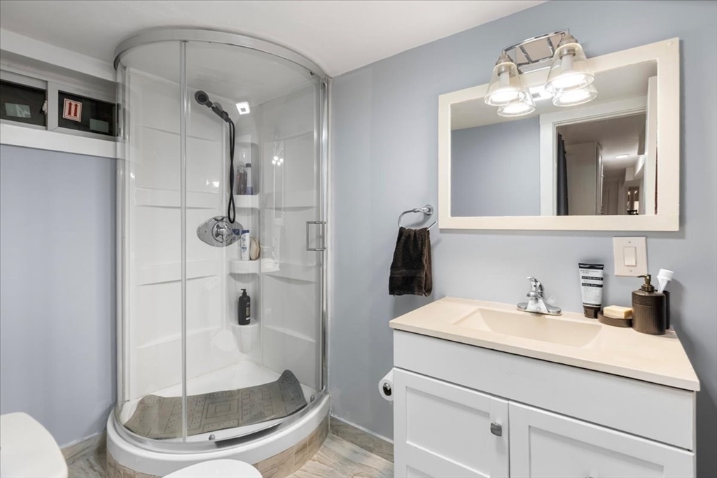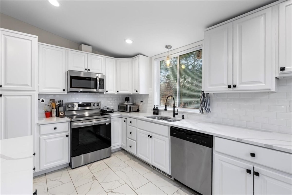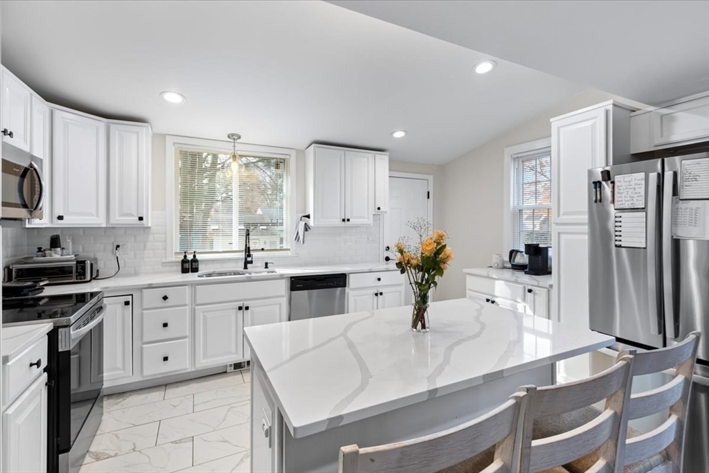 Renovated Home Sweet Home before Christmas! Elegant finishes throughout. Quartz counters and island, recessed lighting, hardwood floors, marbled tile, vented range, and large windows to the back yard. Finished basement with 3rd bedroom, kitchenette and bath. All this with a good sized fenced back yard, new Heat and A/C, water heater, windows, updated electrical and 2.5 baths! 2 driveways and storage shed. Neighborhood location, side street!