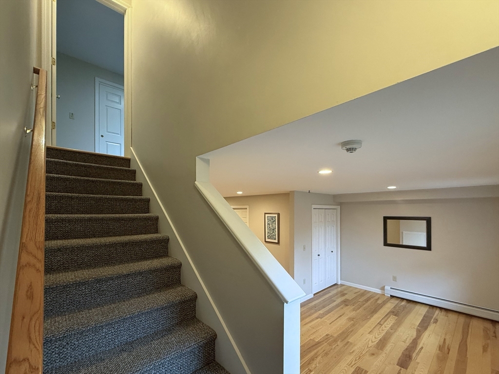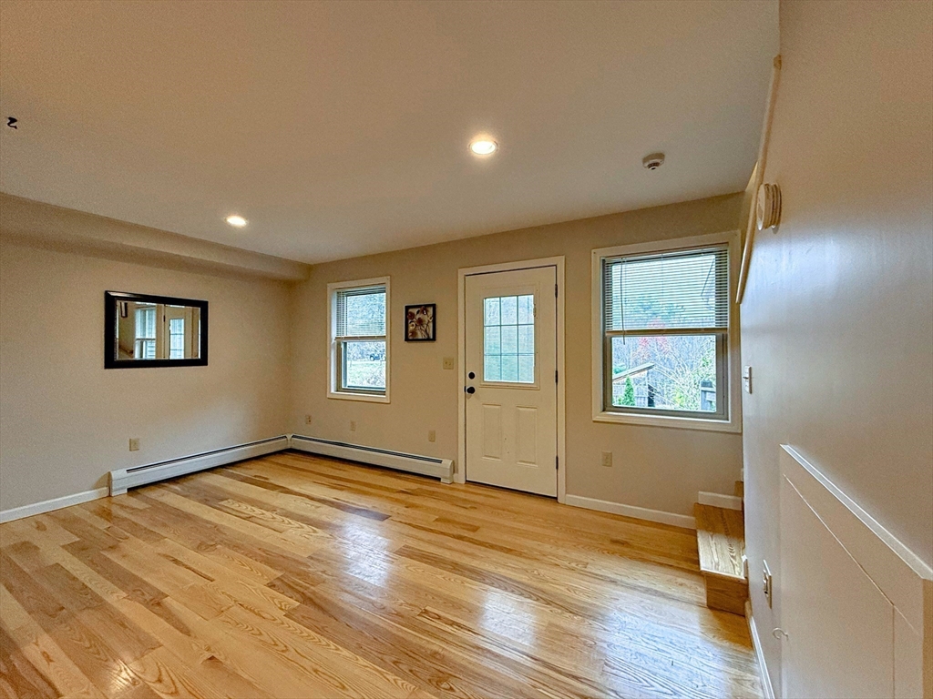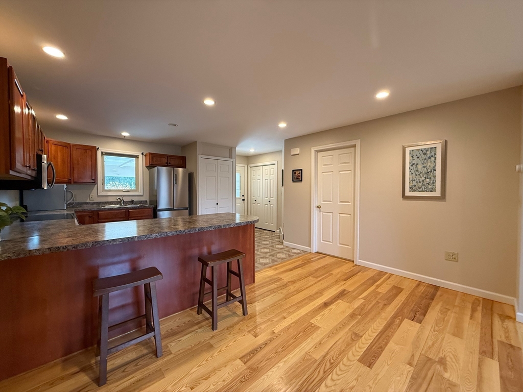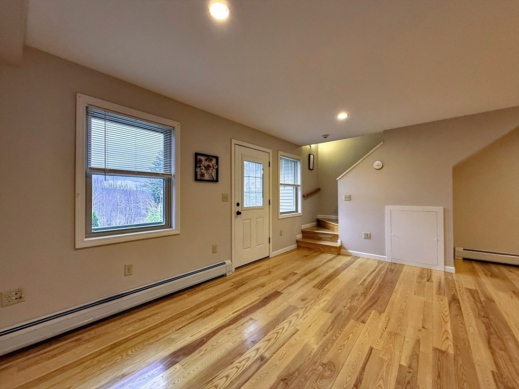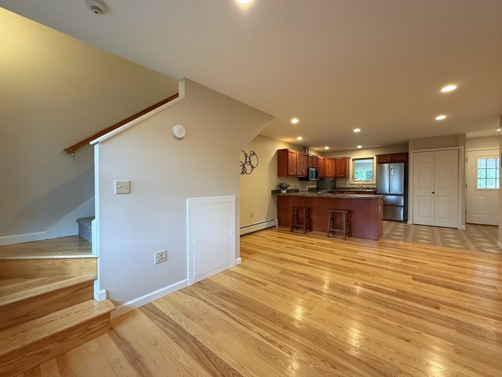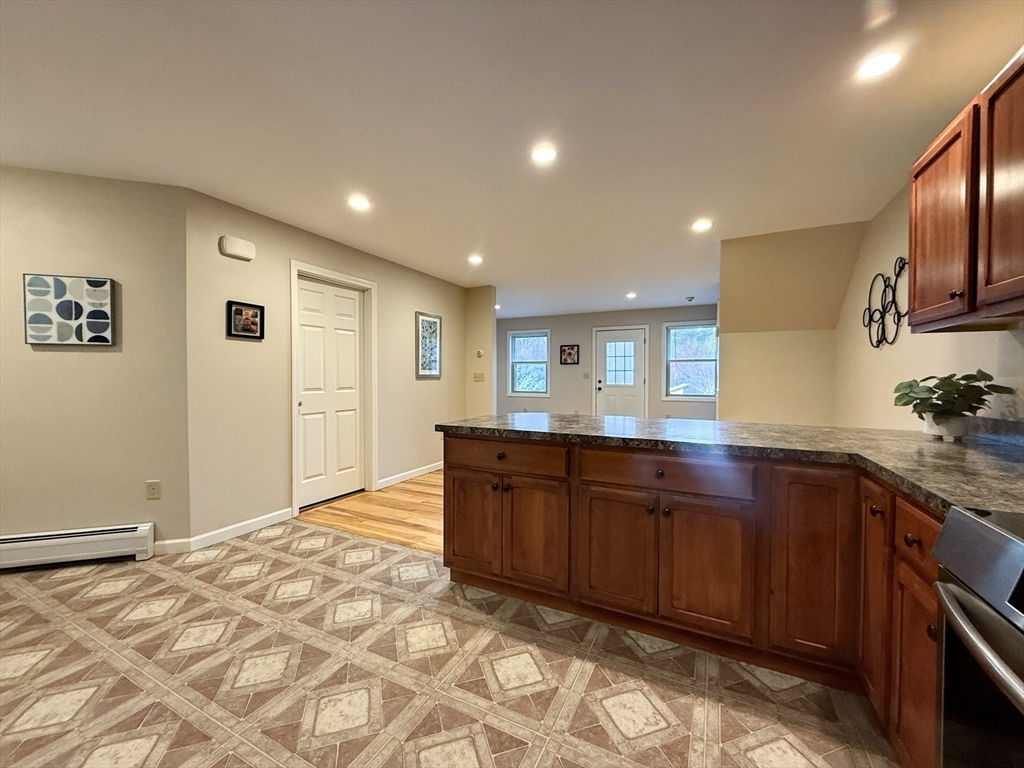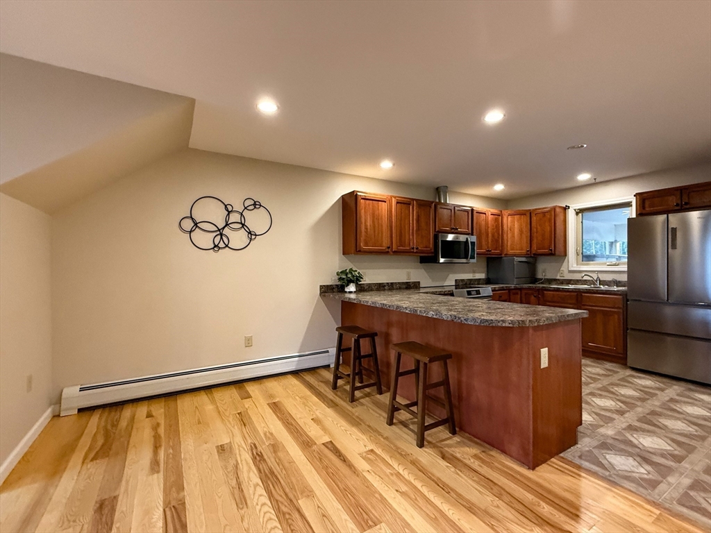 Discover comfort and style in this inviting one-bedroom condo in Haydenville. The open floor plan features hardwood floors and a modern kitchen with cherry cabinets, induction range and spacious breakfast bar, great for casual dining and entertaining. Updated bath includes tiled floor, granite vanity and built-in shelving, and the extra-large bedroom offers two generous, customized closets for exceptional storage. Enjoy the convenience of in-unit laundry and the covered parking is ideal for New England weather. Set in a peaceful rural location just five minutes from Look Park in Northampton, this pet-friendly condo offers the perfect mix of comfort, convenience, and charm.