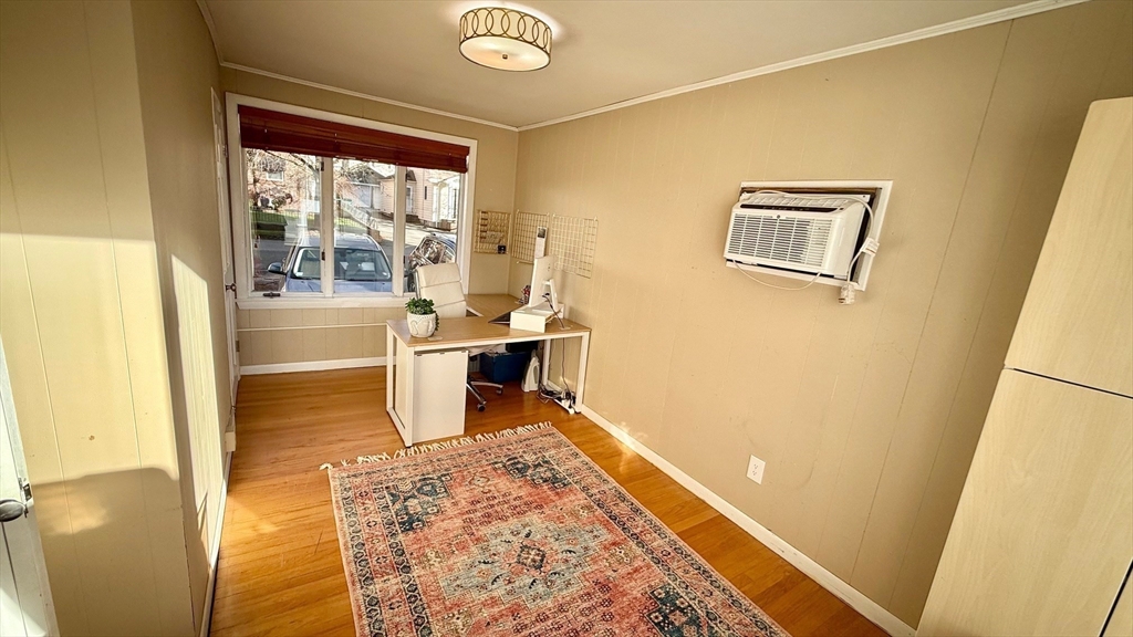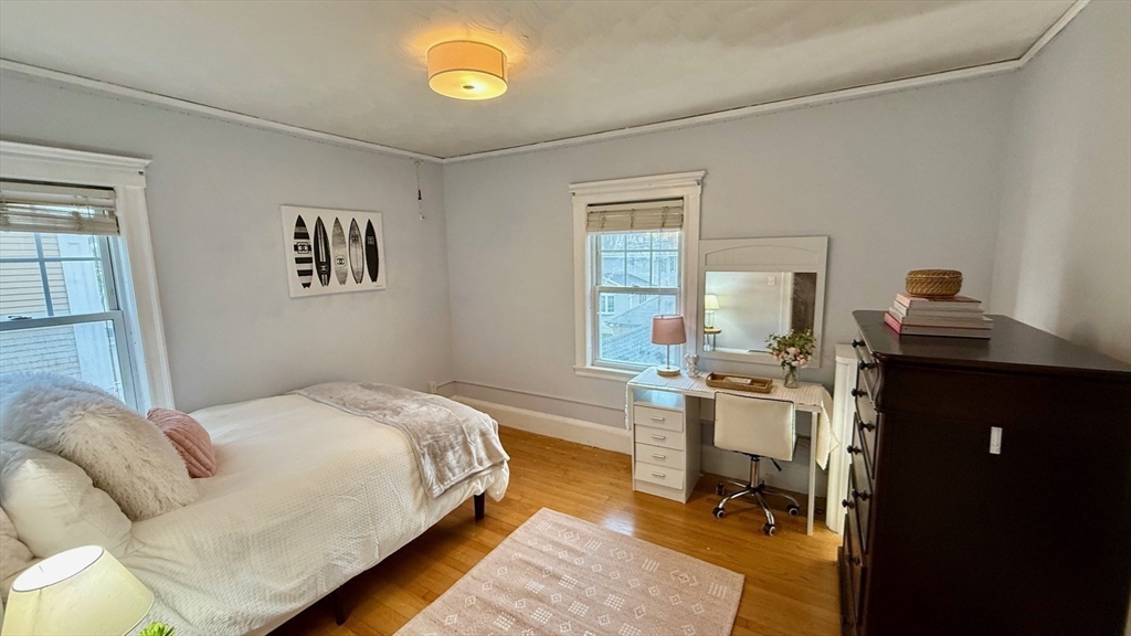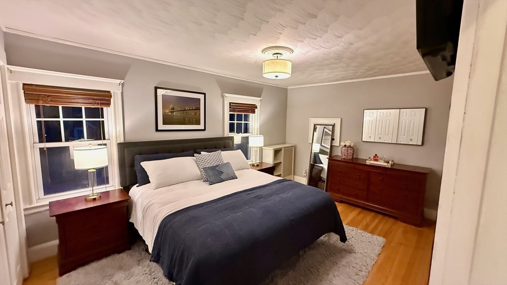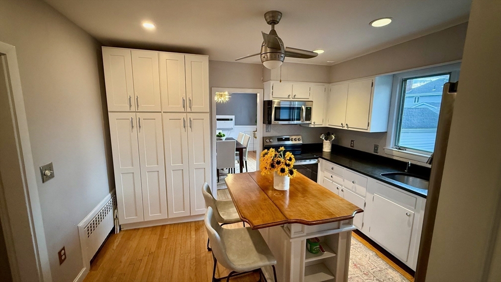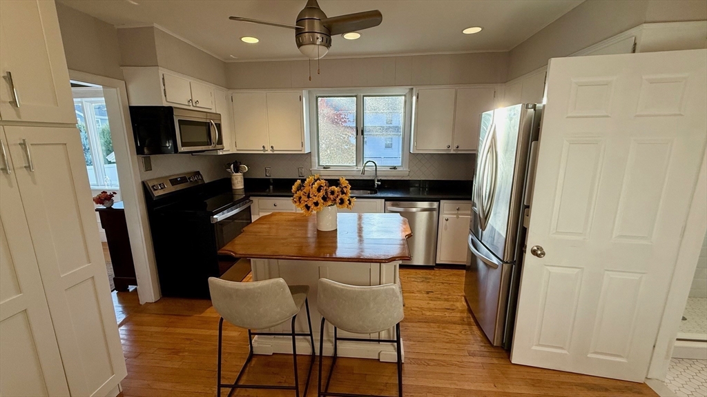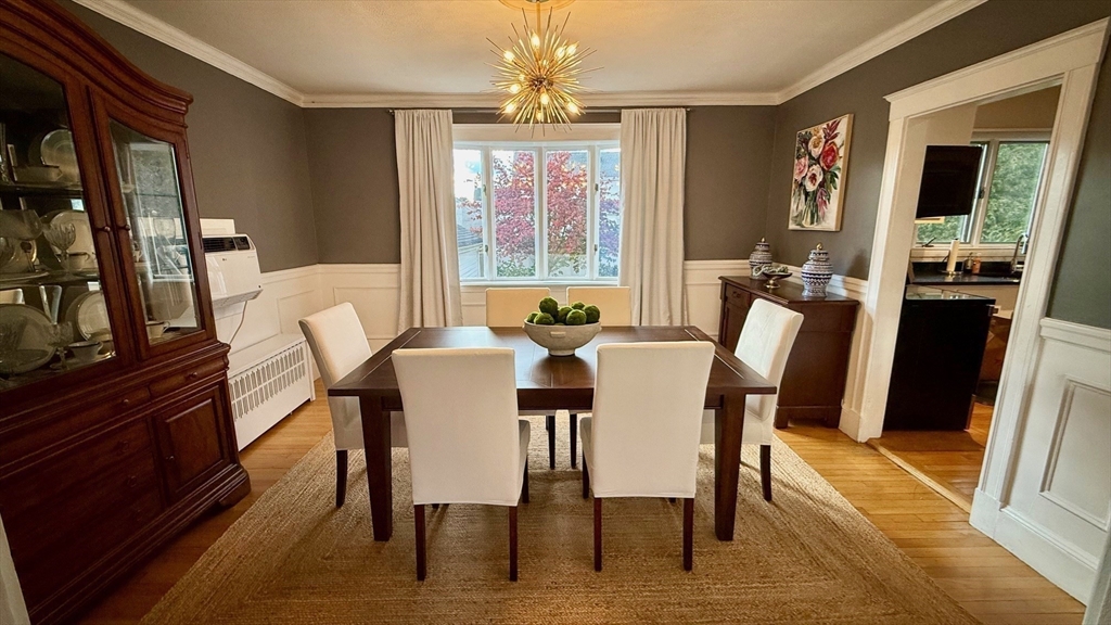 RARE OPPORTUNITY IN LAWRENCE ESTATES! 3-bedroom 2.5-bath on quiet road. Move-in ready with hardwood floors throughout. First floor features large living room with fireplace, formal dining room, updated kitchen with granite, SS appliances (2020) and expansive pantry storage, a den/office/optional 4th bedroom with closet, plus a remodeled bath with large tiled shower (2021). 3 bedrooms upstairs including a primary w/oversized double closets and custom organization system, plus remodeled full bath (2019). Pull-down attic access provides ample storage. Finished basement includes spacious family room, custom granite bar, surround sound, full-size stainless fridge, half bath with laundry featuring new high-end GE washer/dryer (2025). Updated systems include NEW gas furnace (2024) and 50 gallon hot water tank (2023).Side-by-side driveway with parking for 3-4 cars-a huge plus! Fells reservation trails at end of block. Walk to Medford Sq. High demand neighborhood!