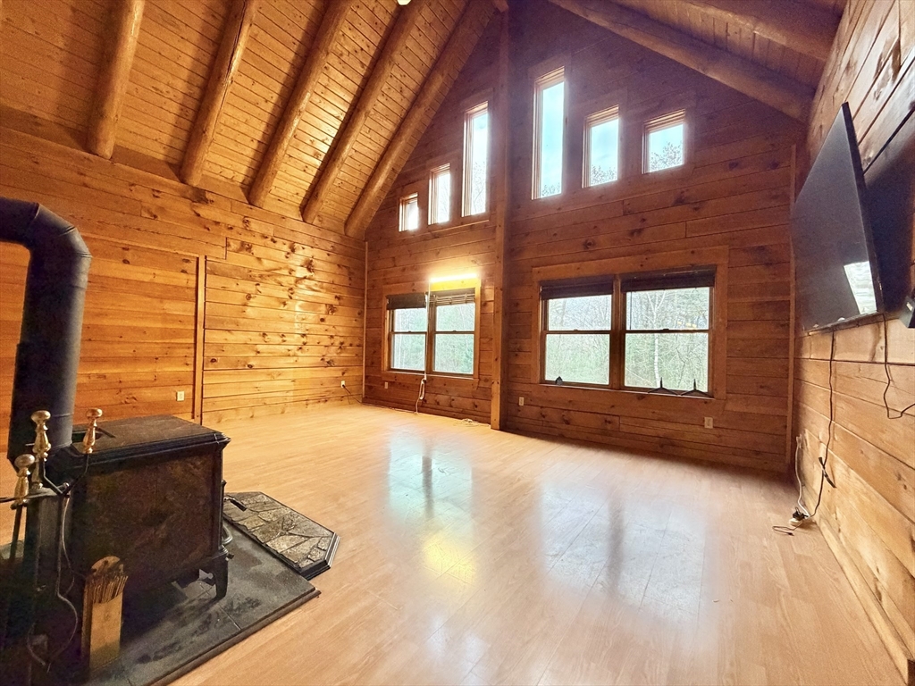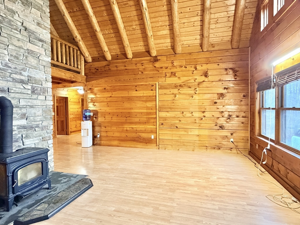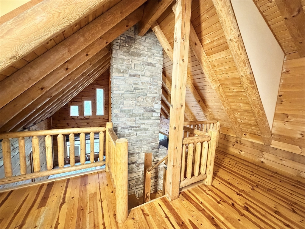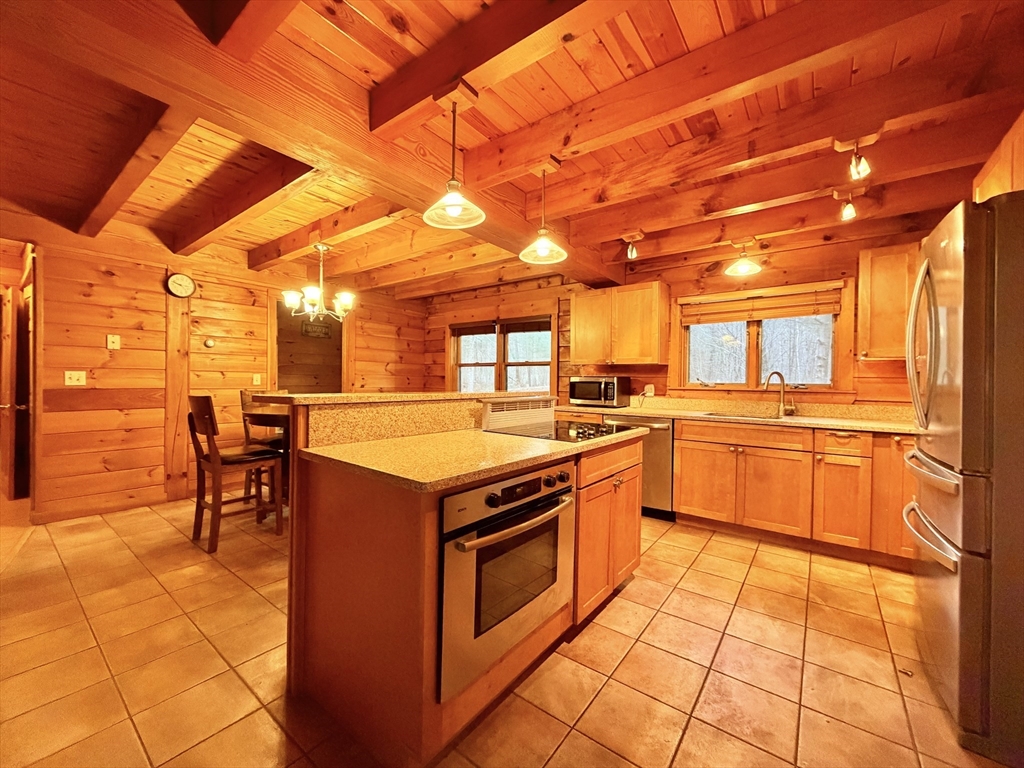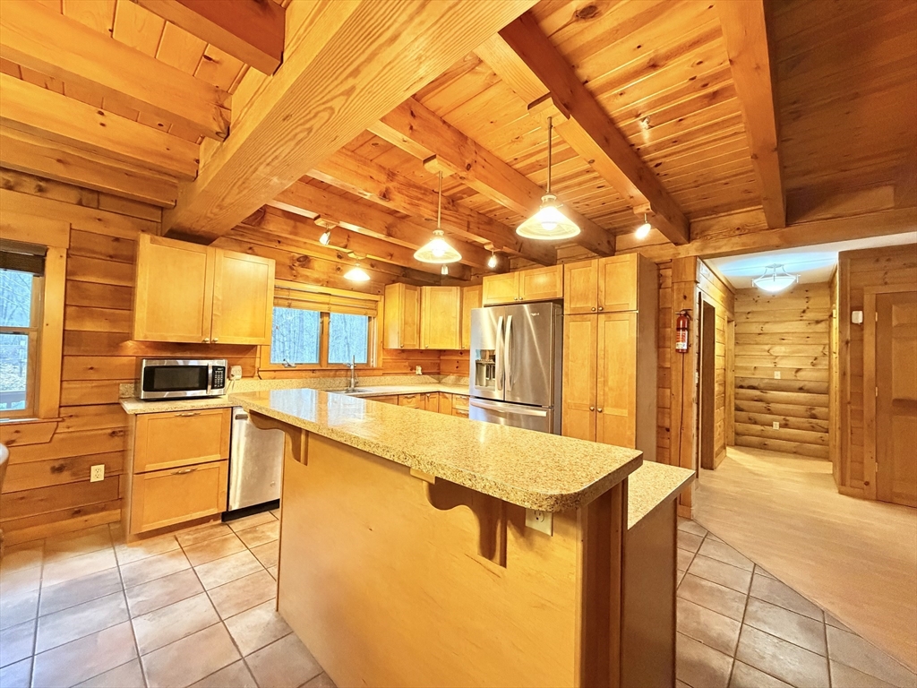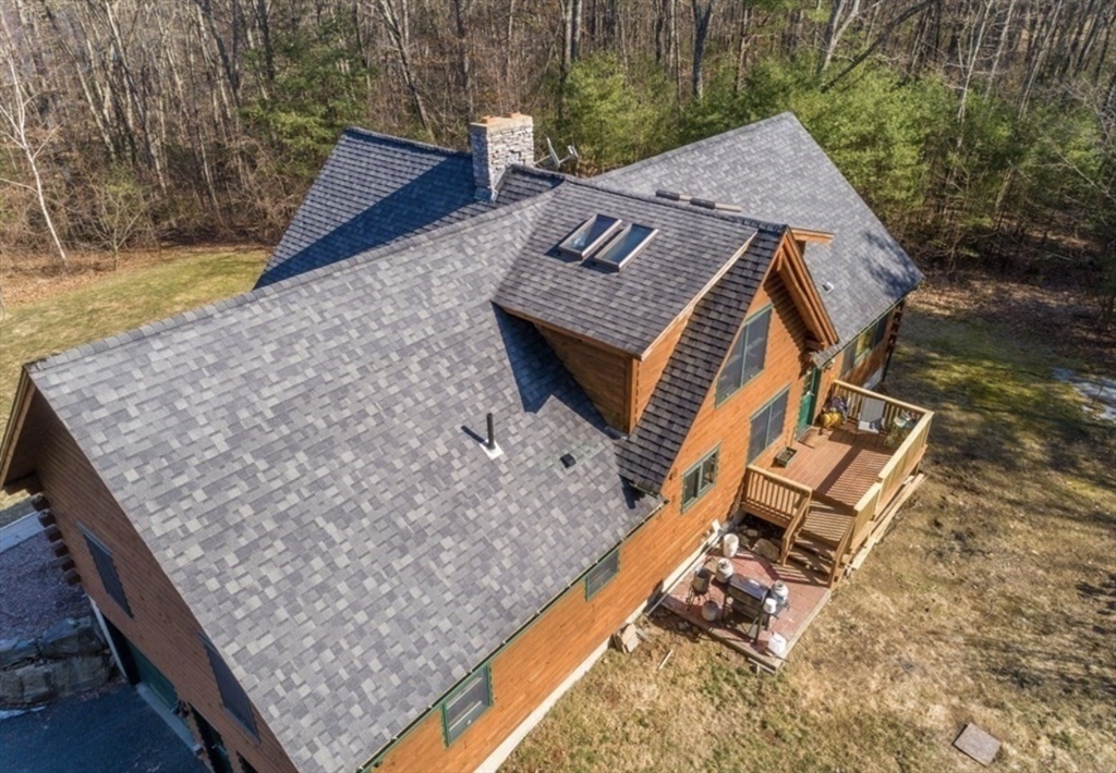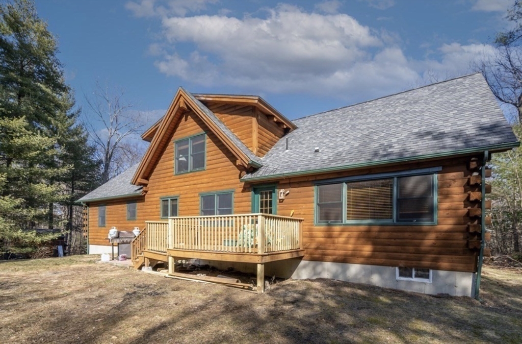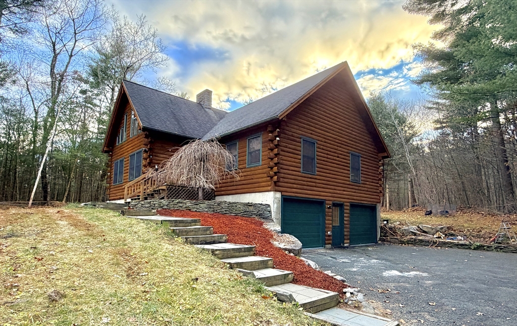 Quality materials used thru-out this custom designed home. you will find this spacious and inviting custom-built Log that has been lovingly maintained by the owners. True single-level living that offers 3 bedrooms and 2 baths (master bath) with 1st floor laundry and attached 2-car garage. Hydronic Floor Heat(Radiant), Wood Stove. One of the most beautiful towns in New England, this Well Maintained Log home is privately set 300' off the road on over 28 acres of land, complete with stonewalls, trails for hiking or ATV's and 610' of frontage. Nature & wildlife, a mile to Gate 43 of the Quabbin Reservoir. The moment you step inside of this home you feel warm and welcomed. The Sun filled Great Room with a Cathedral Ceiling, stone hearth and wood stove is open to the dining room and Gourmet kitchen that offers wood ceiling, a center island with breakfast bar and appliances to remain, the gorgeous custom built staircase leads to the loft with skylights.