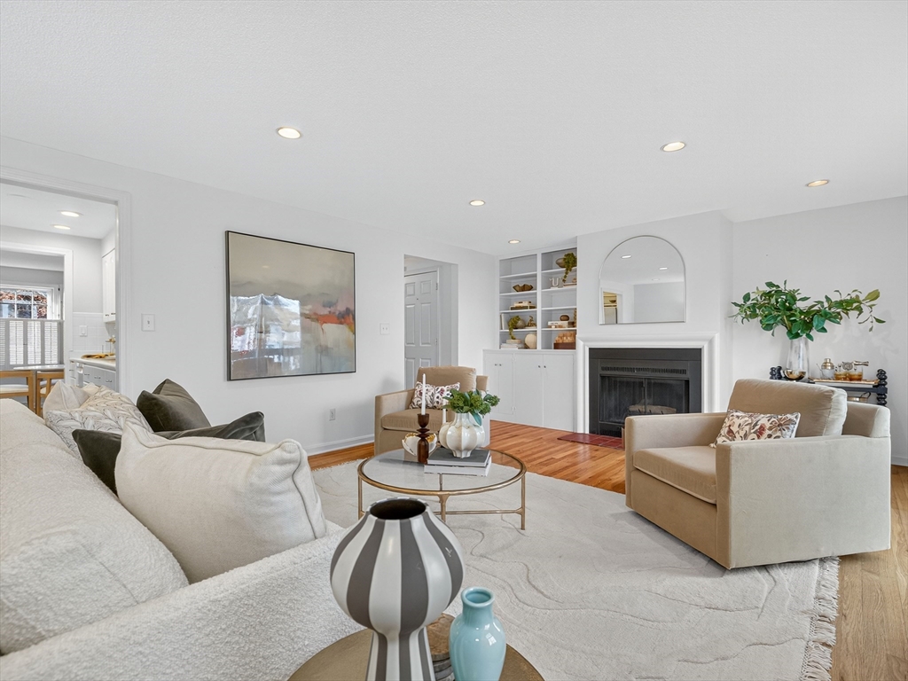 Charming Townhouse in the heart of Wellesley center. This spacious TH offers a thoughtfully designed layout across three levels. The main floor includes a bright sunny living room w/gleaming hardwood floors, cozy fireplace, and built-in bookshelves. A large sliding glass door opens to your private balcony, ideal for morning coffee or evening relaxation. The dining room also boasts hardwood floors & convenient pantry storage, leading to a well-appointed galley kitchen with white cabinetry. Upstairs, you'll find two generously sized bedrooms w/ HW flooring. The primary suite includes a private full bath & 2 double closets. An additional full bath in the hallway houses the in-unit laundry for ultimate convenience. The full basement offers excellent storage space and provides direct access to the garage. Enjoy the best of Wellesley living with nearby commuter rail, shops, restaurants, and more. This is the right size in the right location.