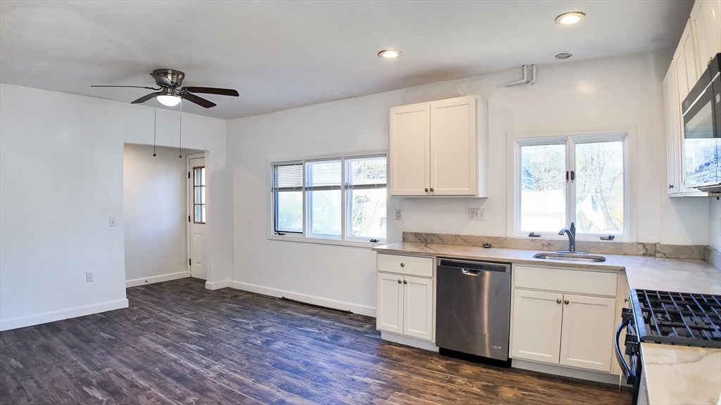 Experience exceptional first-floor living in this beautifully maintained two-family home. This inviting unit features a stylish, modern eat-in kitchen complete with newer stainless-steel appliances and granite countertops. The sun-filled living room provides a warm and welcoming atmosphere, perfect for relaxing or entertaining. Enjoy two spacious bedrooms, including a primary suite with its own private bath. A versatile bonus room offers the ideal setup for a home office or guest space. An additional full bathroom adds convenience for residents and visitors alike. The basement includes laundry hookups and ample storage. Outside, you’ll appreciate abundant off-street parking and a generous yard—perfect for outdoor enjoyment year-round.