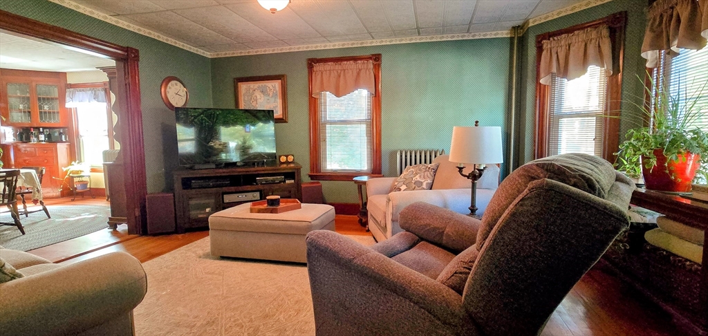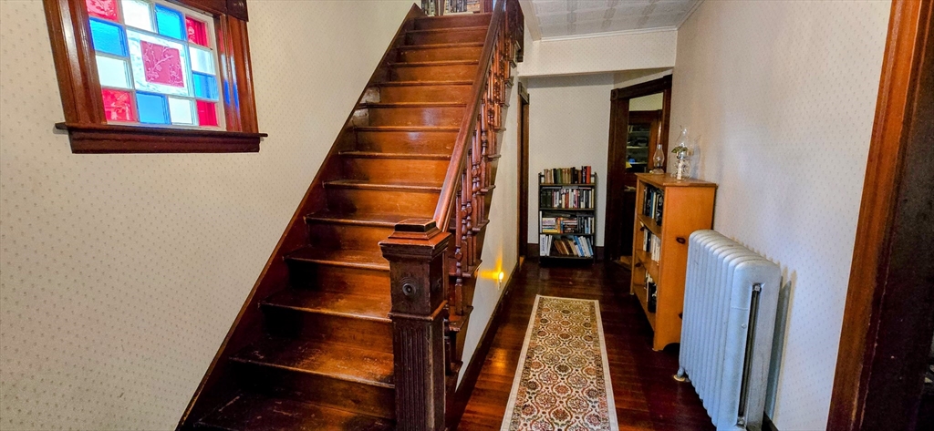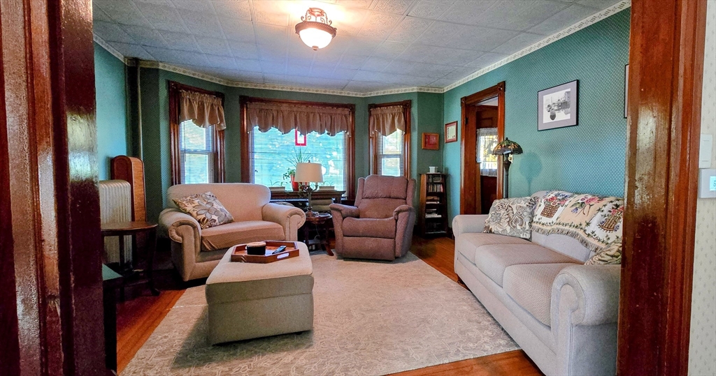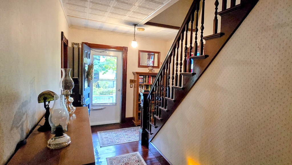 WELL LOVED AND CARED FOR FAMILY HOME JUST 15 MINUTES FROM ROUTE 2! This gorgeous colonial holds 100+ years of beautiful memories and history. There is original woodwork that features bulls-eye molding through out the house. The first floor features a spacious eat-in kitchen, newer stainless steel appliances, cozy pantry, laundry room &1/2 bath-all freshly painted. A large mudroom off the kitchen offers extra storage. Open, Sun-filled living & dining room with beautiful hardwood & built in cabinets. Office off the dining room/kitchen leads into the impressive foyer with extra wide staircase original molding, & stain glass window. Upstairs features 3 charming,freshly painted & carpeted bedrooms with plenty of walk in closet space. New 30 year roof in 2019, new gutters and freshly painted side deck.The detached oversize, 2 car garage has new insulated, steel doors and a 30 year roof replaced in 2023. Located on a quiet side street. Close to schools, shopping, parks and downtown.