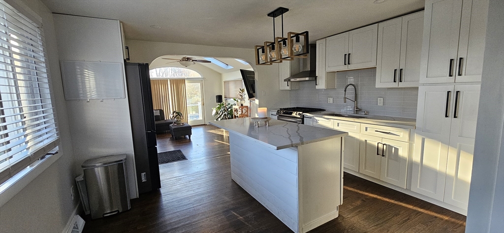 Situated at the end of a quiet cul-de-sac in a lovely neighborhood, this beautifully updated front-to-back split offers comfort, charm, and an abundance of living space. Step inside into the family room with cathedral ceilings, skylights, and a slider overlooking the private fenced yard with multiple decks. The home features hardwood floors throughout, a recently remodeled kitchen at the heart of the home with quartz countertops, gas cooking, and modern updates that make it both functional and stylish.A large living room with a fireplace and bay window provides yet another comfortable space to gather. Upstairs, you’ll find the bedrooms with large walking closets and a renovated full bathroom. The finished basement adds even more versatility, featuring a family room, 1 bedroom and an additional bathroom that is framed and ready to be finished according to your vision. With its updates, generous layout, and prime location, this home is ready for its next chapter. Roof replaced in 2019.