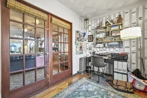 Stunning sun-filled 2-bedroom + office, 1-bath rental on the 1st floor of a beautifully maintained two-family home! This bright and spacious unit features gleaming hardwood floors throughout, an open and airy layout with a large living room, formal dining room, and a well-appointed kitchen complete with granite countertops, stainless steel appliances (new fridge & dishwasher), upgraded cabinetry, and convenient private laundry. The versatile bonus room is perfect as a home office, nursery, or guest space. Enjoy elegant French doors, a full bathroom, and exclusive access to the huge walk-up attic for additional storage or future expansion potential.Additional highlights include gas heat (system replaced 2019), fresh paint, and abundant natural light from multiple exposures. Plenty of parking with off street parking plus street parking all year. Shared backyard for relaxing or grilling.Prime location just steps to public transportation, shops, restaurants, parks, and everythin