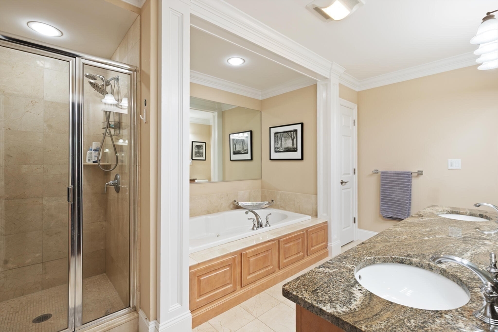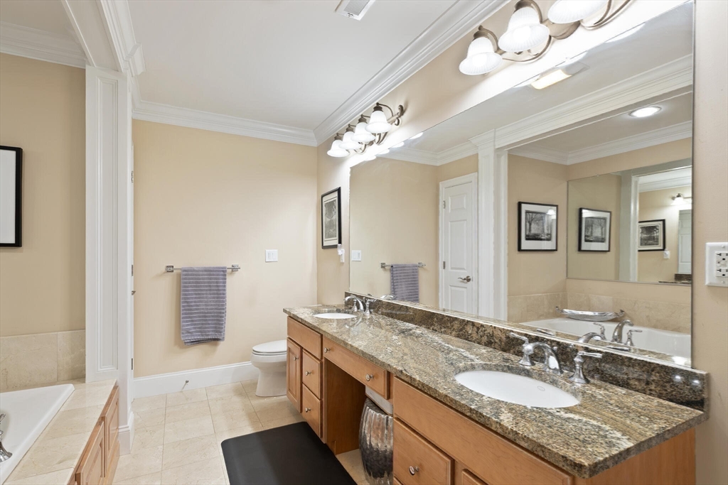 Beautifully appointed two bedroom, two and a half bath townhouse on a quiet cul-de-sac near schools, highways, and a vibrant town center. Features include crown moldings, plantation shutters, custom built-ins, and an EV outlet in the garage. The open-concept main level offers spacious living and dining areas, a well-designed kitchen, and access to a private patio with a gas grill . A short set of stairs leads to a large family room with built-ins and a gas fireplace. Two en-suite bedrooms include a primary suite with walk-in closet, dual sinks, jetted tub, and walk-in shower. Finished lower level is ideal for a gym or playroom and a separate space for an office. Stylish, private, and close to everything. Start the New Year right...lease available January 1st!
