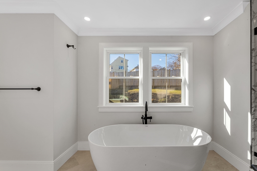 A rare new construction home in Roslindale, meticulously crafted by a local luxury builder and thoughtfully designed by *Kerry Driscoll Design* . This stunning residence showcases 3 levels of living boasting a bright, open design plan with upgraded wide-plank white oak flooring throughout, a designer kitchen with custom cabinetry, bar area w/bev cooler, gas fp lv room with marble mantle and built-ins and a sunroom that seamlessly extends to a outdoor patio complete with a gas line for grilling, perfect for entertaining.The upper level offers 4 bedrooms including a serene primary suite featuring a spa-inspired bath with solid stone flooring and shower, stylish fixtures and a massive walk-in closet, laundry room and full bath with tub wrapped in porcelain tile. The lower level provides a two-car garage with an attached flex space ie. gym/office, blending convenience with modern living. Every detail has been elevated, from the high-end finishes to the carefully curated design elements.