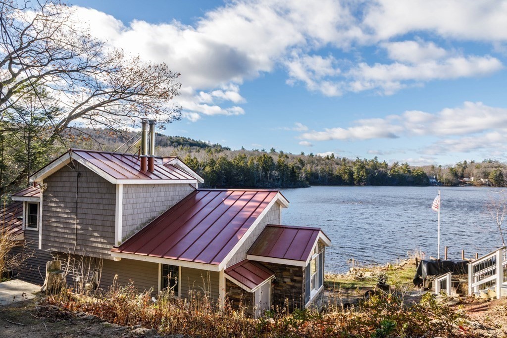 Welcome to a perfect waterfront escape location! Nestled on a dead end road along the peaceful shores of sparkling Stodge Meadow Pond, this year round charming waterfront is a rare offering! Spend long summer days swimming, fishing or boating from your private 125 ft. shoreline with 2 docks. Unwind with family & friends on the deck with full view of Mt. Watatic, sunset light dancing across the water. Featuring inviting open-concept living area with wood beam accents, picture-perfect views from nearly every window. Custom remodeled kitchen by Superior kitchen, living room with wood stove. Beautiful tile bathroom, main bedroom on upper level with slider to balcony. Newer roof, siding and double wall oil tank. Drilled well has new pump, also new pump in septic system. Shed to convey. Don’t miss your chance to own a slice of lakefront paradise. Sold as is – an exceptional chance to own your dream waterfront retreat!