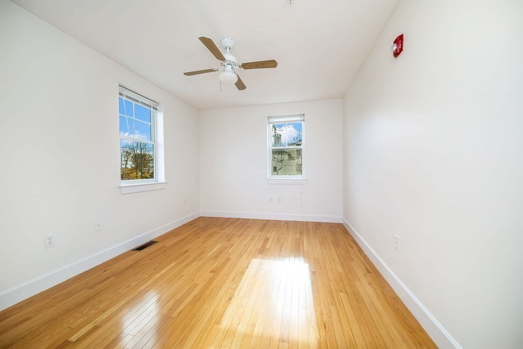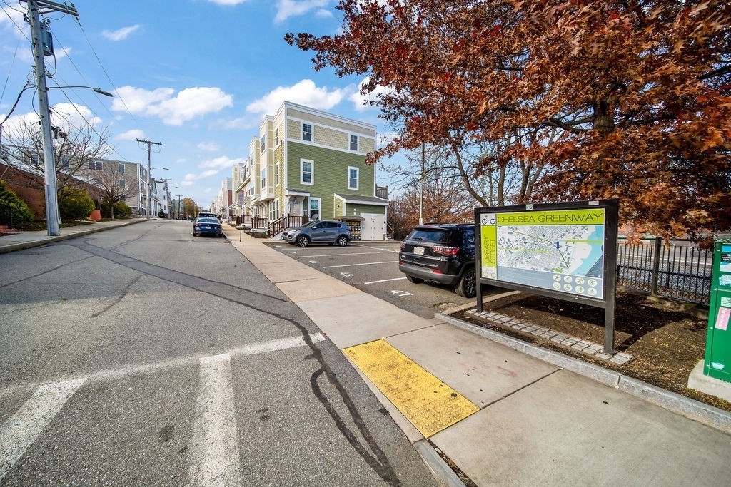Stunning corner end-unit penthouse bi-level with 1,093 square feet, three bedrooms, one and a half bathrooms, and two deeded parking spaces. Sun-filled with three exposures at the end of a dead-end street. The main level offers hardwood floors, recessed lighting, and an open kitchen and living area with stainless steel appliances, gas cooking, a pantry, and a private balcony overlooking the Chelsea Greenway. The half bath is tucked next to the laundry room, which also contains the newer Goodman heating system and Navien on-demand hot water tank. Upstairs has three bedrooms and a fully renovated bathroom with a custom tiled glass shower, bench seating, and a window. Professionally managed. Prime location in the Box District just one block to the Silver Line, and close to the Commuter Rail, bus routes, Blue Bikes, parks, dining, shopping, Chelsea Commons, Mystic Mall, and the Apollinaire Theatre, with the Greenway perfect for walking, biking, and dog walking.