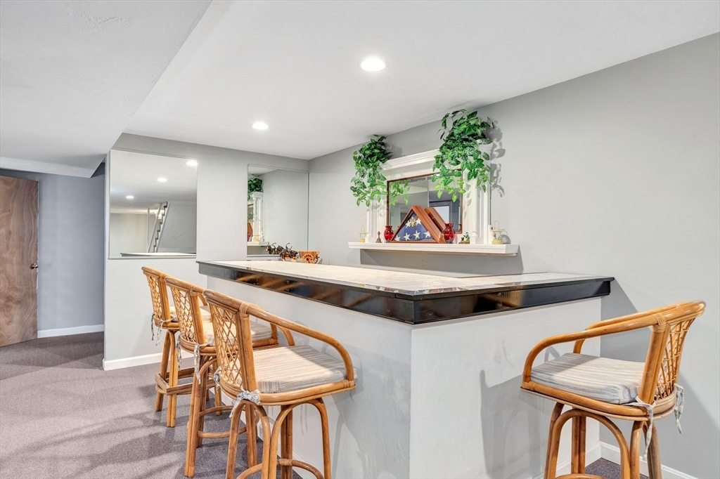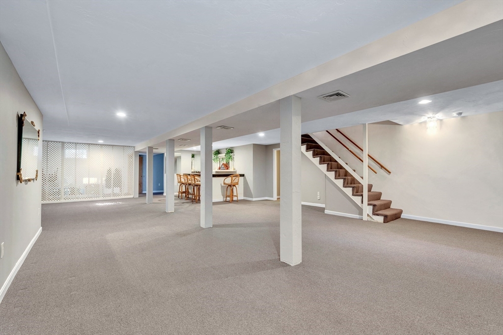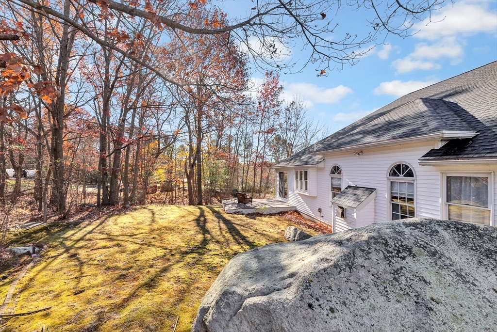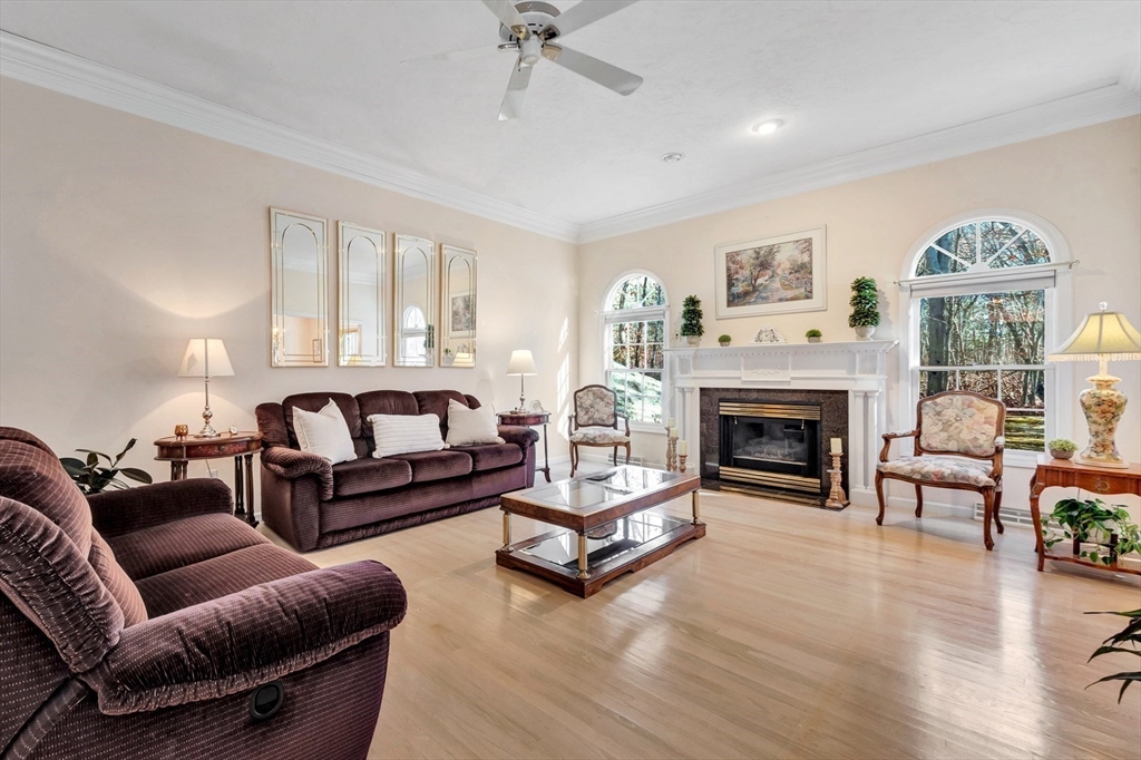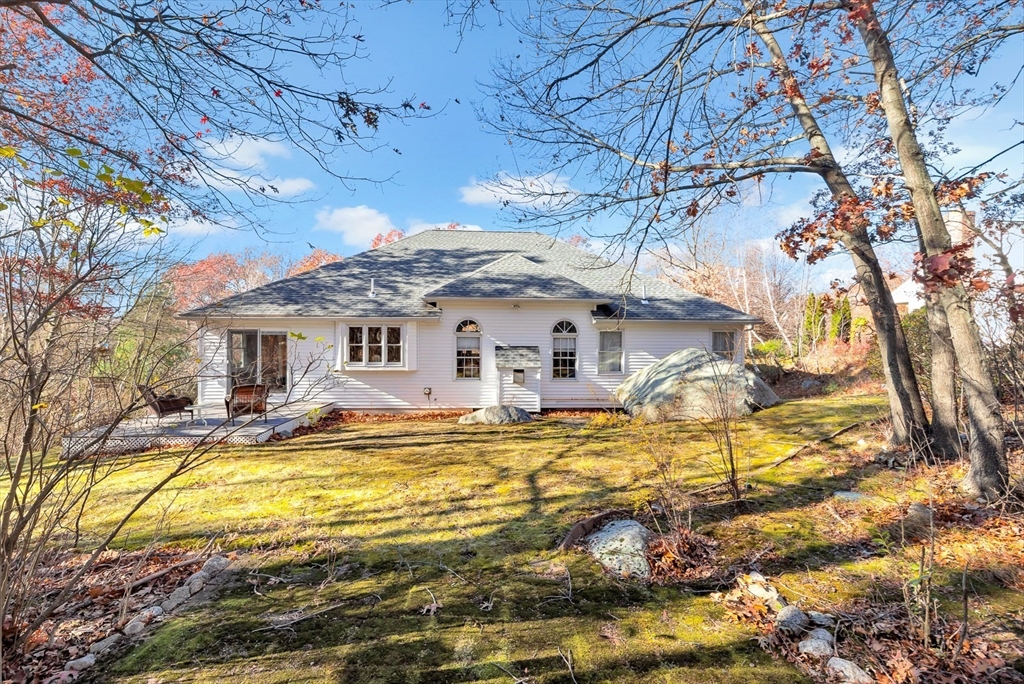 Beautiful custom-built 3BR/3BA ranch set in picturesque neighborhood of well-maintained homes. Located on quiet cul-de-sac offering exceptional curb appeal. Oversized lot with a wooded backdrop provides wonderful privacy. Enjoy nearby shopping, restaurants, parks, walking trails, & easy access to highway. Large eat-in kitchen with skylight, granite counters, & center island, & opens to flexible bonus room perfect for den/playroom/home office with sliders leading to deck & yard. Formal dining room & living room with gas fireplace, crown molding, & arched windows create an inviting main living area. Features 3 generous bedrooms, including primary suite with walk-in closet & full bath. Oversized 1st floor laundry & 2-car garage provides easy access to kitchen. Expansive lower level includes built-in bar, full bath, & large storage area—ideal bonus space for entertaining. Central air, wide double driveway, & striking rooflines that elevate the ranch style complete this impressive home.