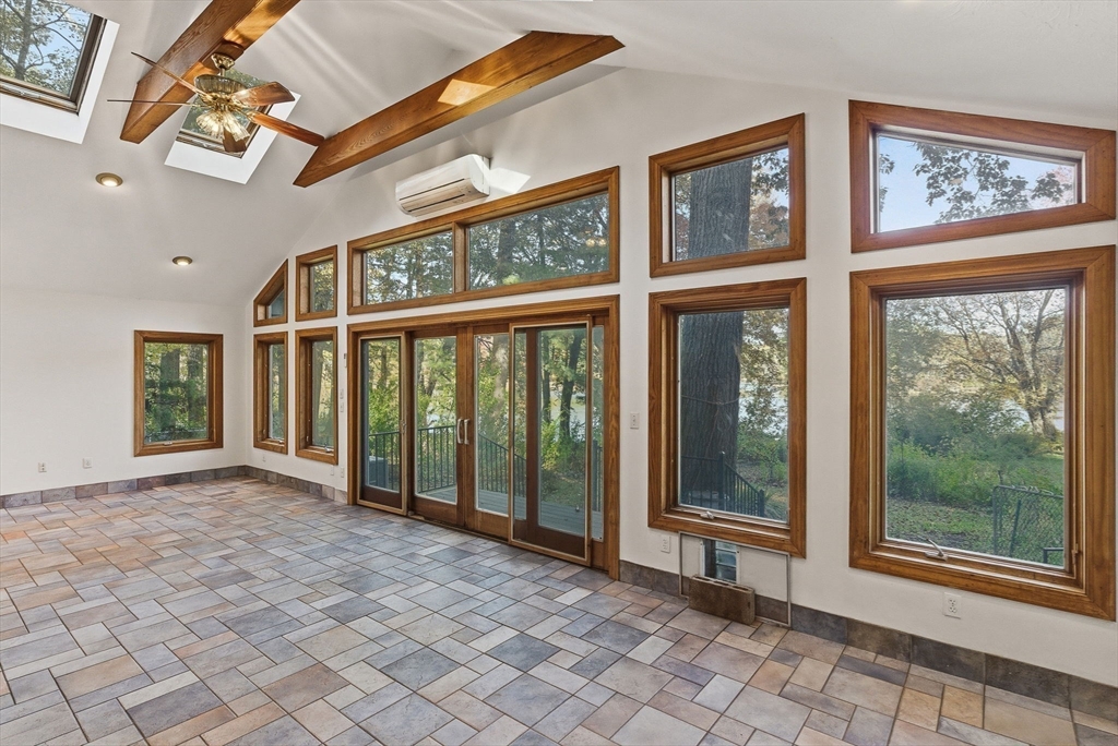 Privately sited on 1.4 acres, this custom 3 BR, 2.5 BA retreat is nestled pond-front on Lake Maspenock, offering serene sunrise views over the water. Custom built w/a touch of Scandinavian flair, it features an open flr plan & fam rm w/soaring cathedral ceiling, skylights & wall of glass that fills the home w/light—perfect for modern living. The kitchen impresses w/cherry cabinets, granite counters, Thermador gas range & water views while you cook. Living rm offers a raised brick hearth w/wood stove that can heat the entire 1st flr. The dining rm, open to the view, makes every meal special. 1st-flr laundry/mudrm adds convenience. 2nd level features hardwds throughout, 3 spacious BRs including primary suite w/sliders to a balcony, water views & ensuite bath. Outdoors enjoy an expansive composite deck, large 2-car garage w/workspace, 2 sheds & fishing & kayaking from your yard! Gas cooking /heating. ’25 new plank flrs & fresh white paint, ’24 gas burner. Waterfront living & charm!
