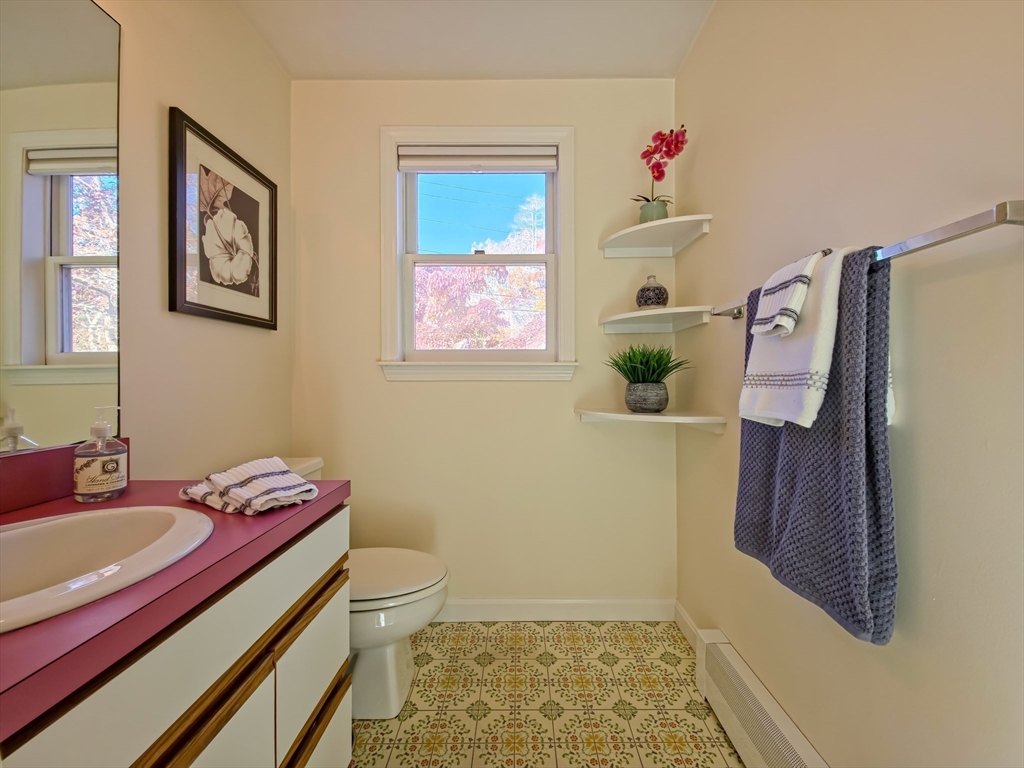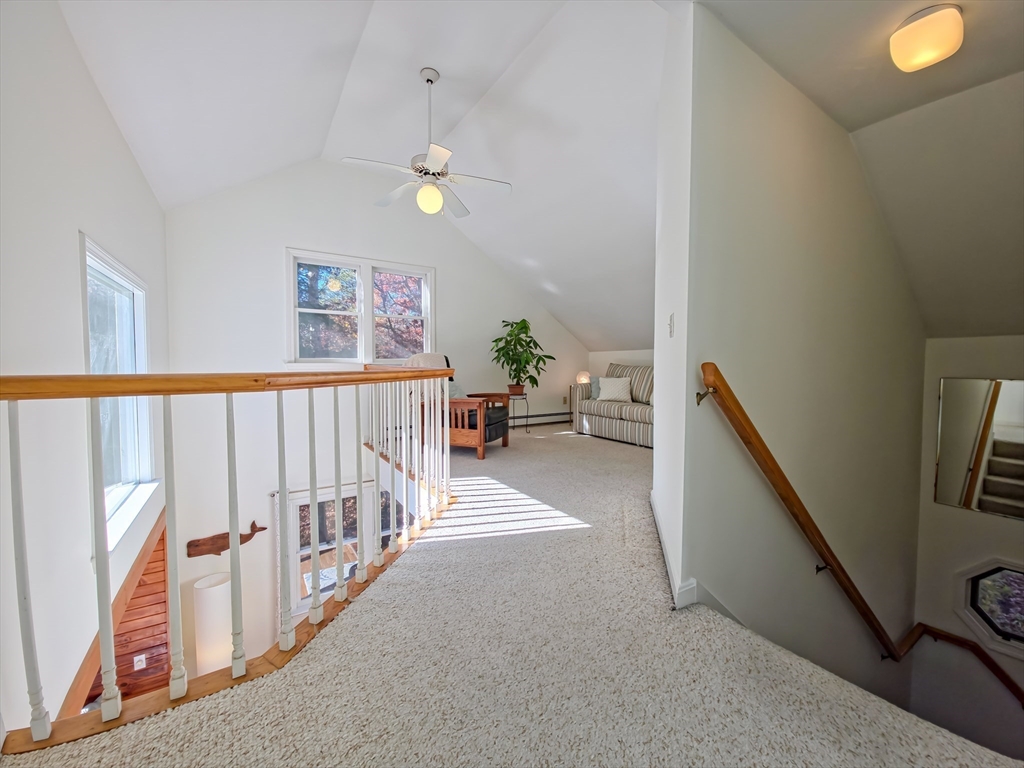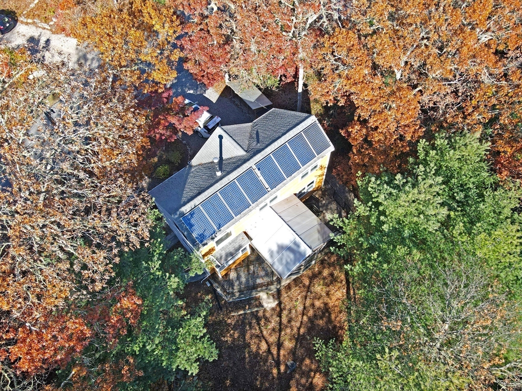 Escape the crowds in this storybook cottage filled with natural light, open space, and cozy charm. This West Falmouth home is tucked away at the edge of the woods near trailed conservation land with easy access to the Shining Sea bike path and a short walk to Chapoquoit Beach. The unique design is split over 3 levels and includes a window seat and a woodstove. The ground floor has an updated kitchen and half bath, dining area, and large living room. From here, doors open onto a screened porch that feels like a treehouse above the dramatic slope of the wooded backyard which provides rare privacy in this desirable West Falmouth location. The upper level includes a spacious bedroom; full bath; and loft that can be used as an office or can be enclosed to create a more private bedroom. The walkout lower level has an additional bedroom and full bath. The fully owned solar panels will keep your utility bills and carbon footprint low. Passing title V in hand for 3 bedrooms.
