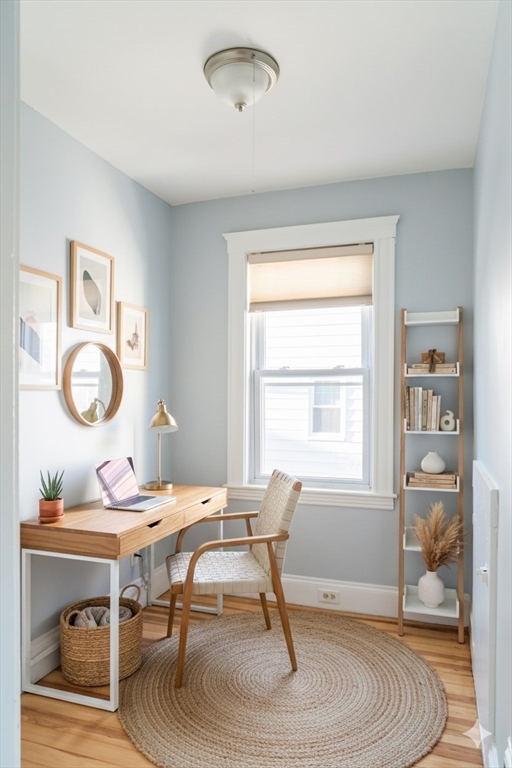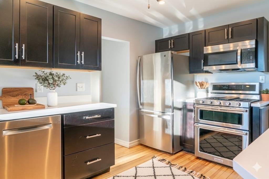 Beautifully updated 1-bedroom with bonus flex/office space just steps from Quincy Adams MBTA! This spacious first-floor unit features stunning natural-colored, recently refinished hardwood floors, fresh paint, central air, gas heat, and in-unit laundry. Enjoy lower electric bills with solar panels. The home includes an enclosed front porch, Energy Star appliances, and exclusive use of 1 off-street parking space (plus additional street parking). A fenced, shared backyard offers bonus outdoor space. Water, sewer, trash, recycling, and solar included. Set in a quiet, well-kept neighborhood close to Quincy Center, shopping, restaurants, major highways, and Faxon Park’s trails and courts. One dog under 40 lbs or one cat considered. Move-in now. Must have strong credit, income, references. Photos with diamond in lower right corner are virtually staged.