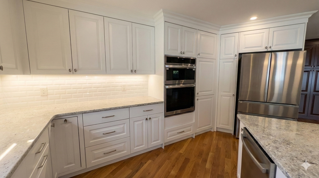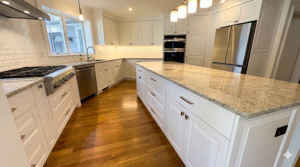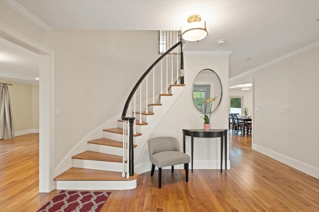 Situated on a beautiful lot in a prime location, this exquisite residence was expanded and rebuilt in 2019 to offer a seamless open floor plan with abundant natural light. A gracious foyer with the original spiral staircase leads to an entertainment-sized living room, private library, formal dining room, and a sun-drenched family room.The heart of the home is the pristine 2025 renovated kitchen, showcasing modern white cabinetry, an expansive island, wine bar, and updated appliances. A versatile 1st-floor bedroom suite offers a private separate entry. The 2nd floor features the primary suite, a guest suite connected to a study, plus two additional bedrooms and laundry. The finished lower level offers a half bath and a newly installed humidity control system. Surrounded by mature landscaping and elegant new hardscapes. Walk to schools.