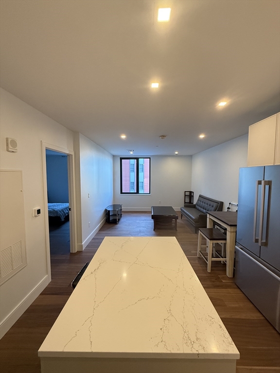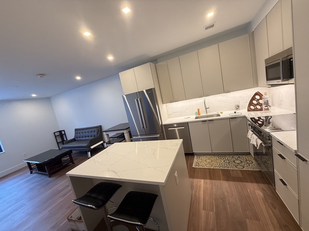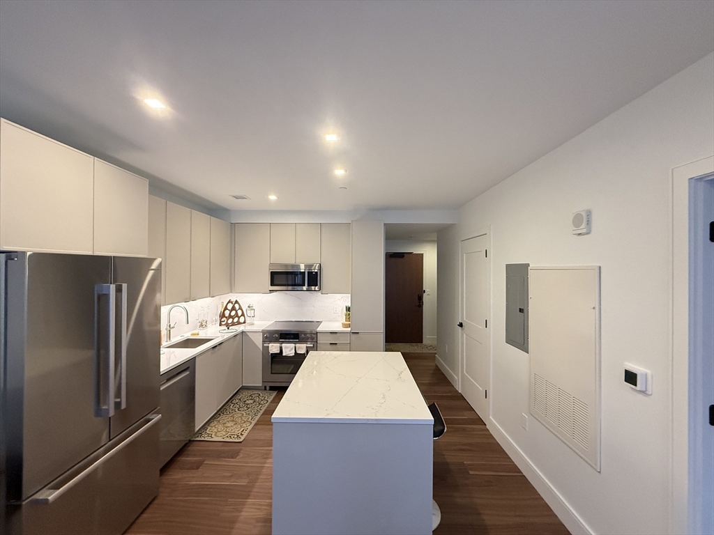 Move-in ready and built in 2024, this spacious 1 bedroom plus den, 2 full-bath luxury apartment offers modern living at its finest. Freshly painted with new flooring throughout, the home features an in-unit washer/dryer, central air with smart thermostat, and an assigned garage parking space including EV charging access. Enjoy secure Butterfly access controls, elevator convenience, and quick transit access just 3–5 minutes to Greenline (B Line) Train station. The building elevates lifestyle with 24/7 concierge and security, a rooftop sky deck with fire pit and bar, second-floor terrace with grilling stations, putting green and lounge, private work rooms and co-working spaces, refrigerated package room, onsite gym with on-demand programs, golf/multi-sport simulator, pet spa and pet run, and bike storage. Close to BC, BU, local dining, and just minutes to Whole Foods. Luxury, convenience, and community all in one exceptional address.